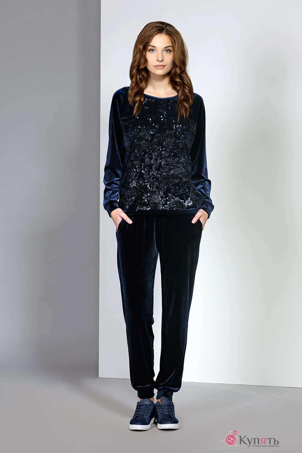 Комплект: джемпер и брюки. Комплект выполнен из велюра, полочка джемпера расшита пайетками. Брюки на резинке по талии, плюс вставлен декоративный шнур.