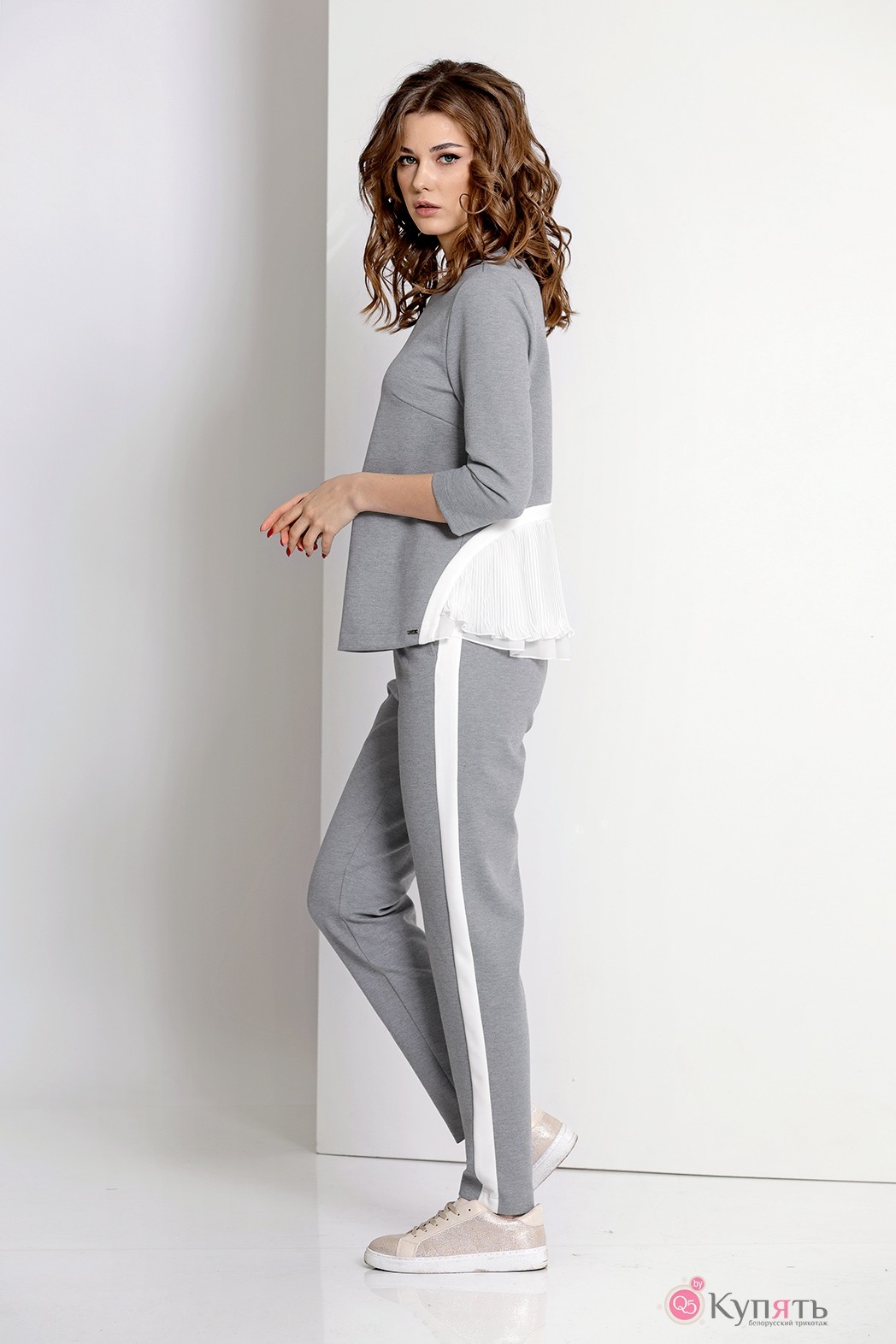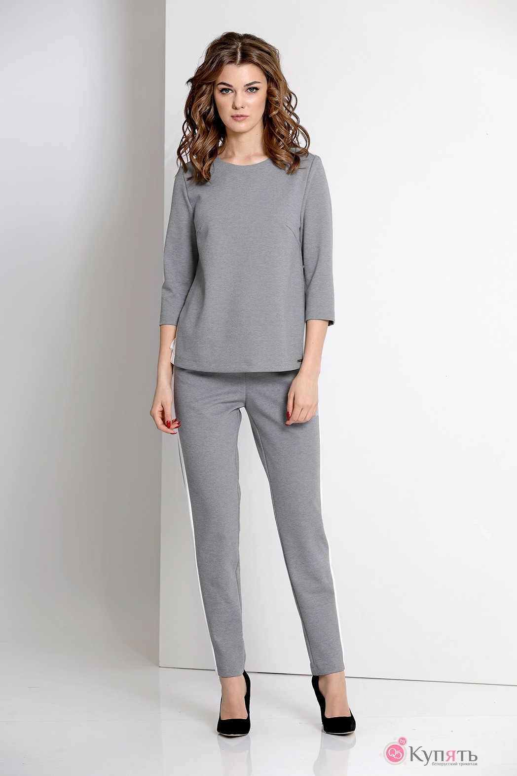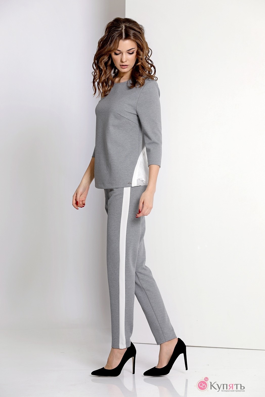Комплект: блуза, брюки. Комплект выполнен из трикотажного полотна с контрастной отделкой. Блуза слегка расширена книзу, на спинке вставка из плисированного крепа, застежка по горловине на спинке на декоративную пуговицу. Брюки заужены к низу, с карманами по бокам, застежка на молнию спереди.