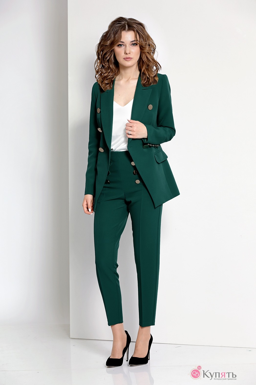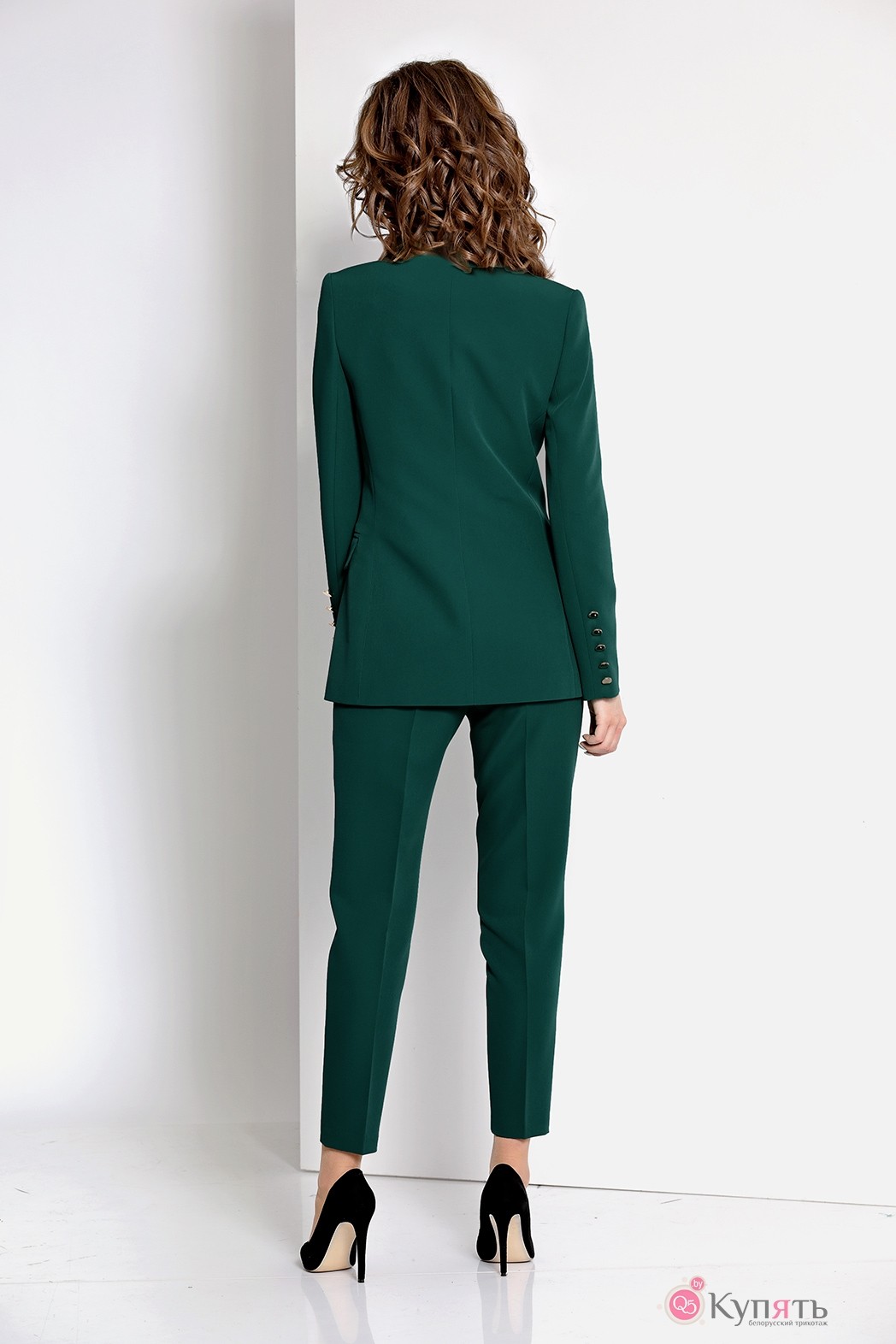Комплект: жакет, брюки. Комплект выполнен из костюмной ткани. Жакет приталенный, двубортный, на подкладке, по переду - прорезные карманы в рамку с клапаном, рукав с пятью пуговицами. Брюки заужены книзу, с карманами, по переду декоративные металлические пуговицы, застежка на декоративную металлическую молнию в среднем шве сзади.