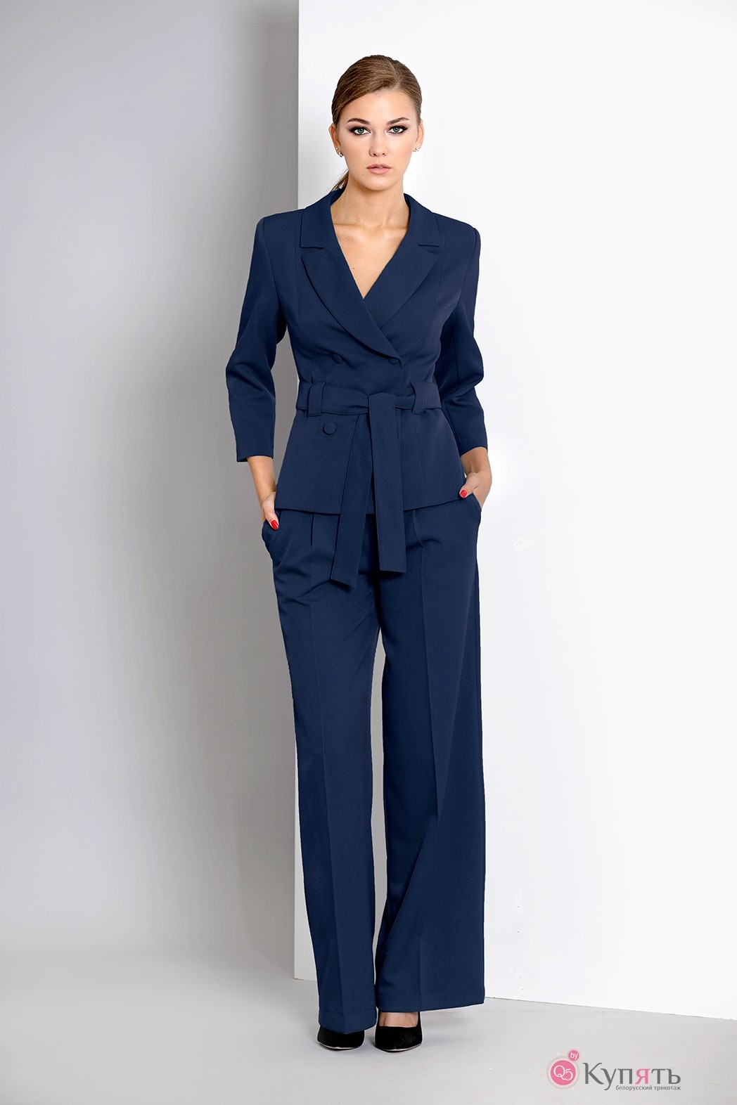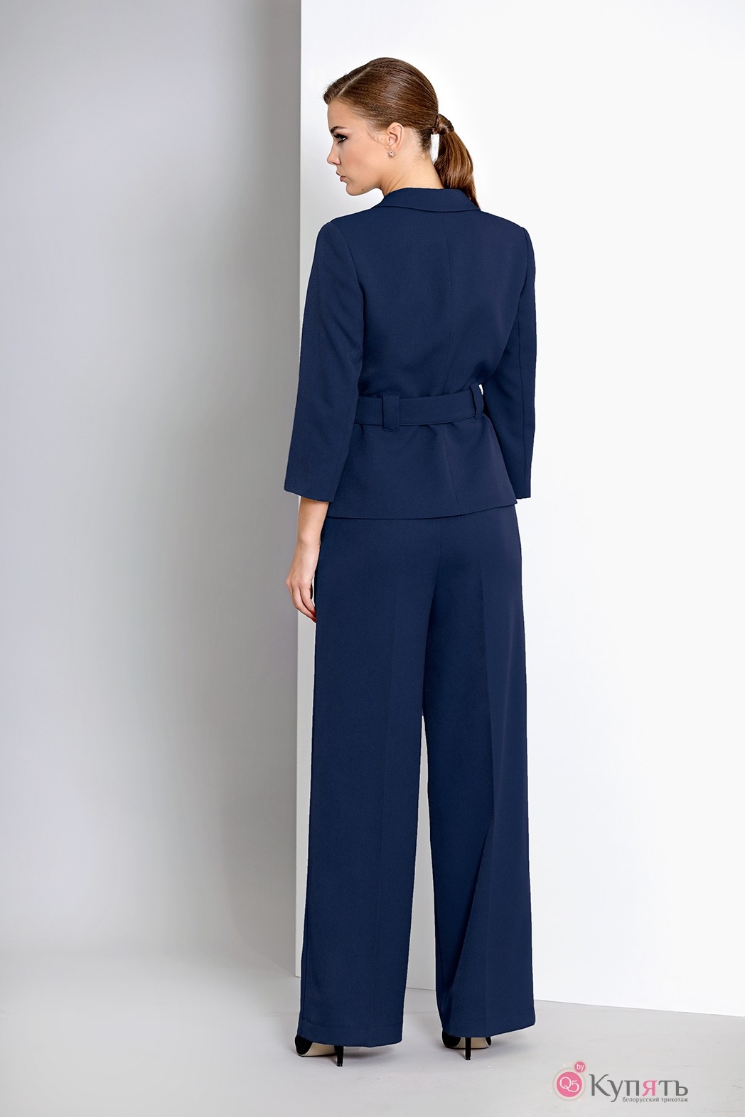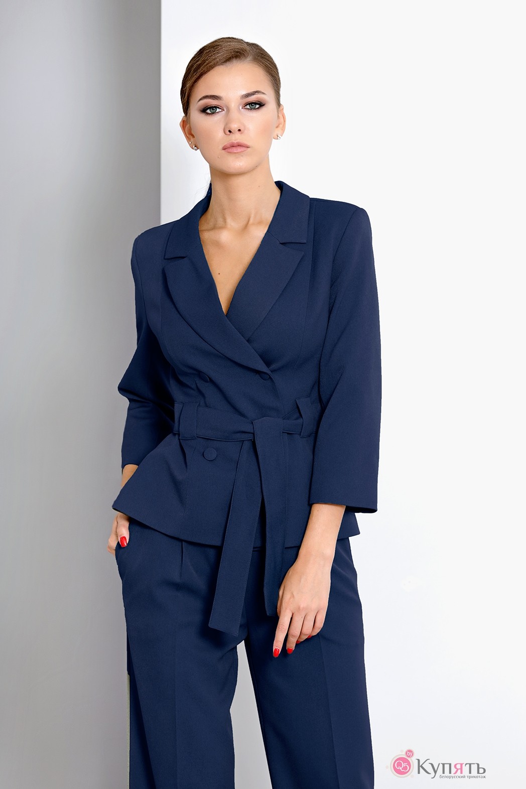 Комплект: жакет, брюки. Комплект выполнен из костюмной ткани. Жакет приталенный, двубортный, на подкладке, без карманов, с завязывающимся поясом, рукав 7/8. Брюки на широком поясе на талии, слегка расширены к низу и заутюжены на кант, карманы в боковых швах, брюки с застежкой на молнию в боковом шве.