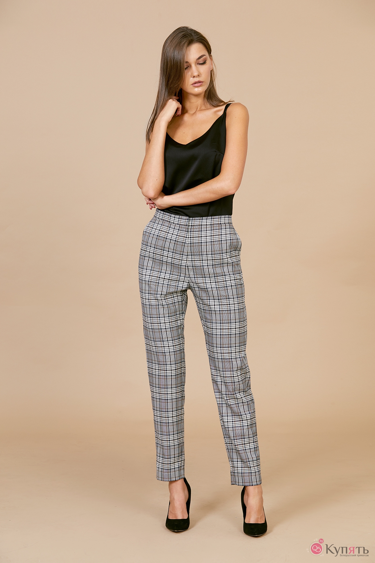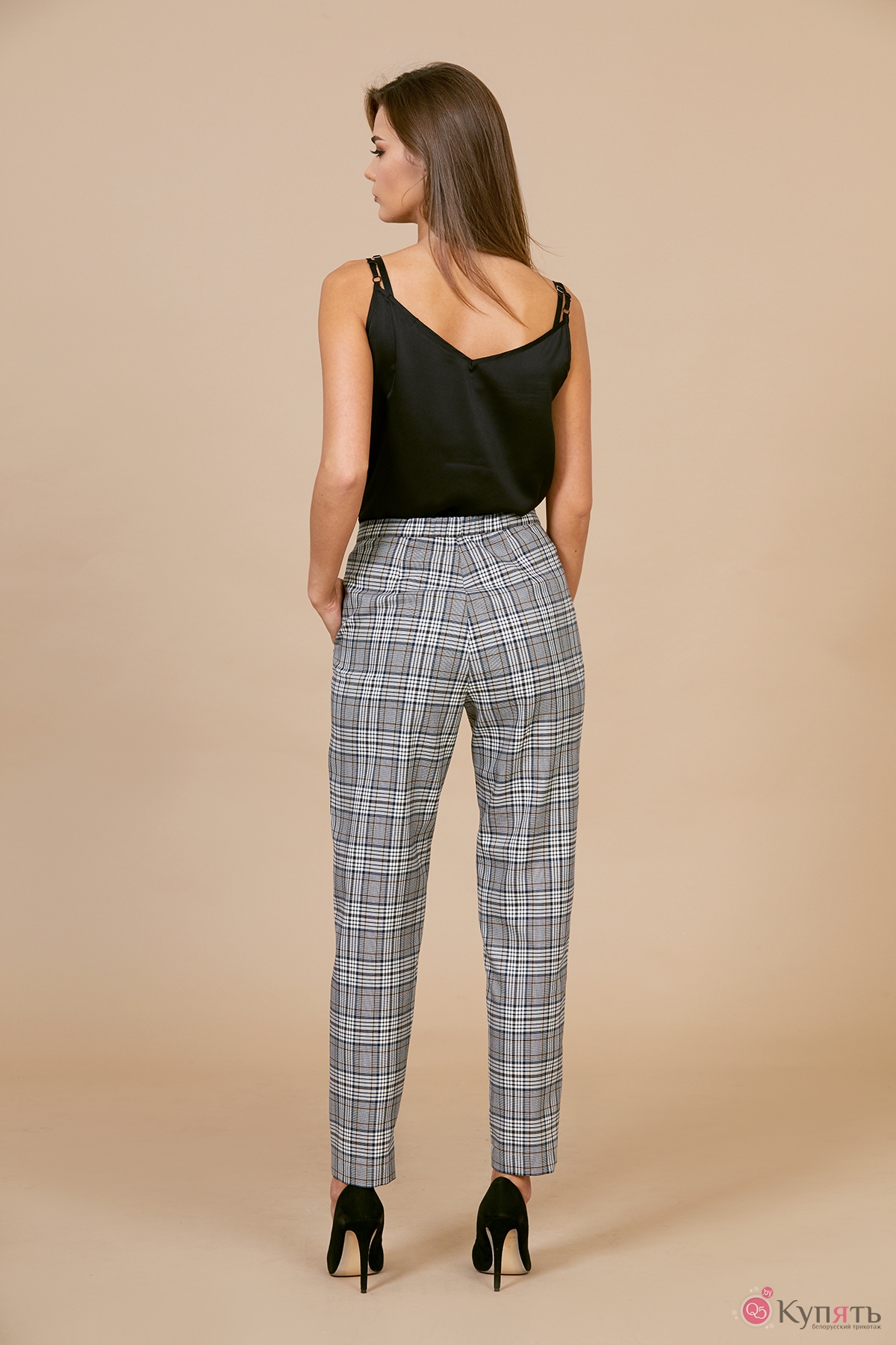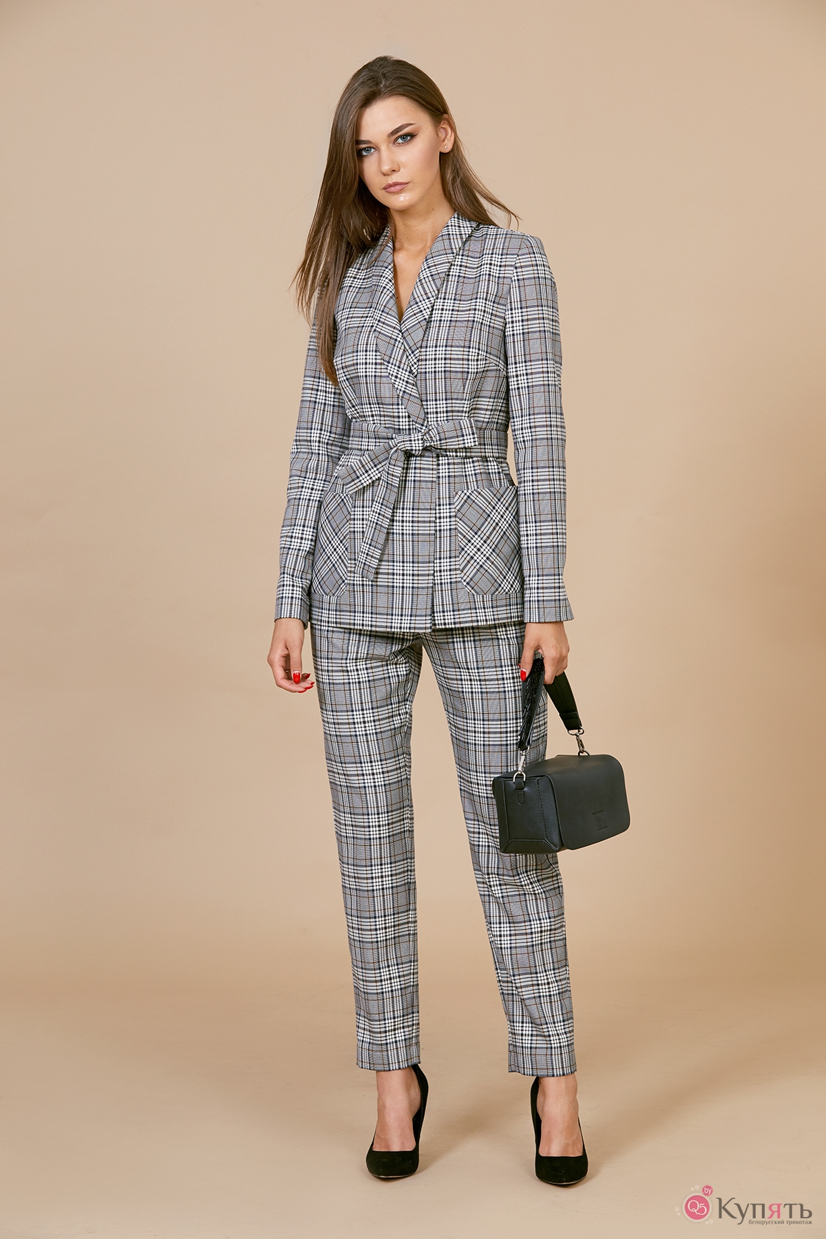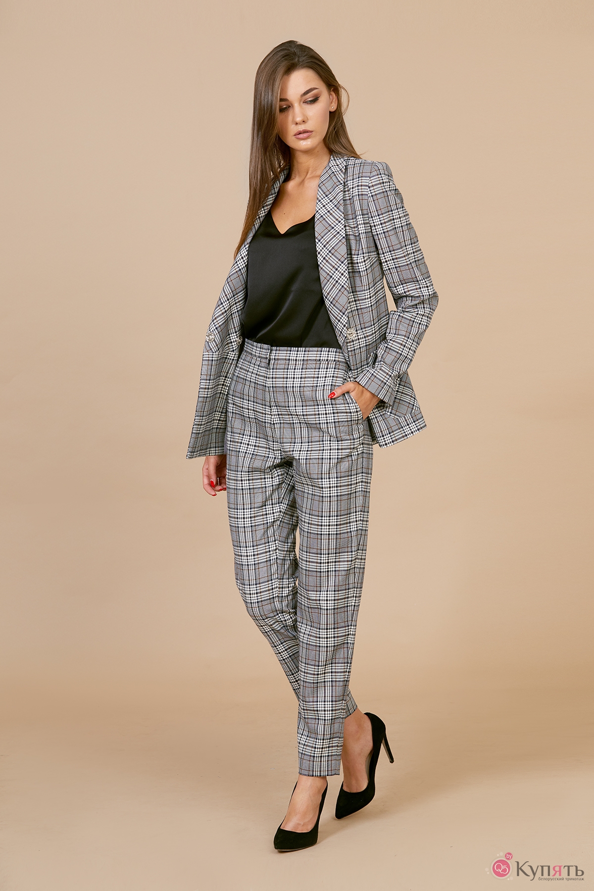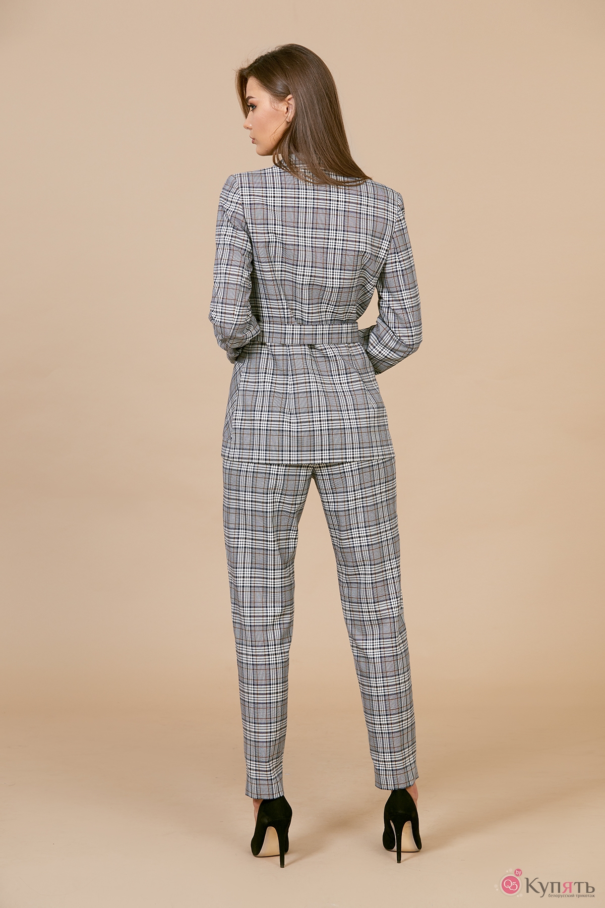 Комплект: жакет, брюки. Комплект выполнен из костюмной ткани в клетку, на подкладке, двубортный, с застёжкой на пришивные кнопки. По переду накадные карманы. Рукав длинный, двушовный. Пояс из основной ткани, идёт в комплекте. Брюки с высокой посадкой, на поясе с резинкой сзади и карманами в боковых швах. Заужены книзу, застежка на молнию спереди.