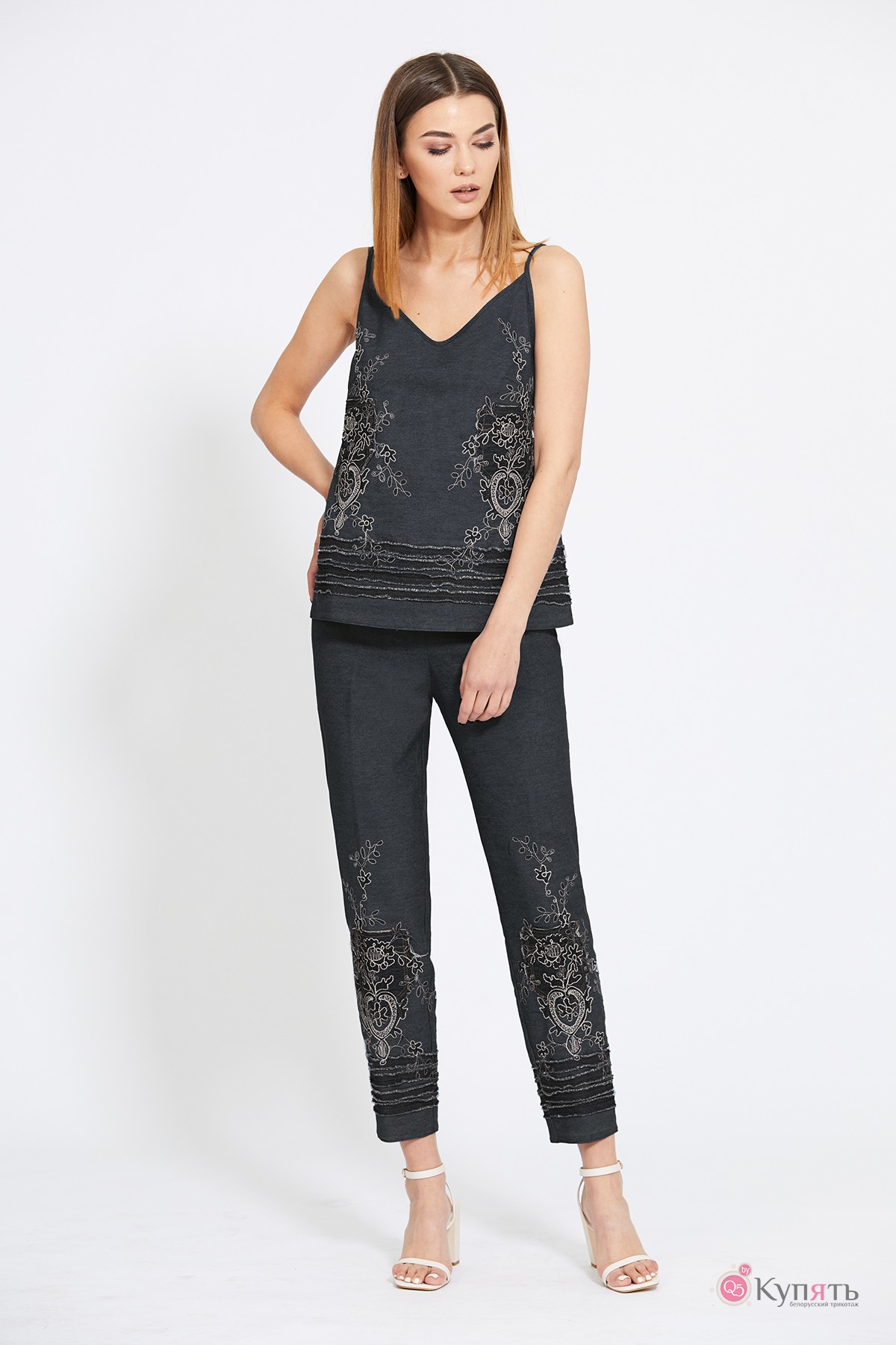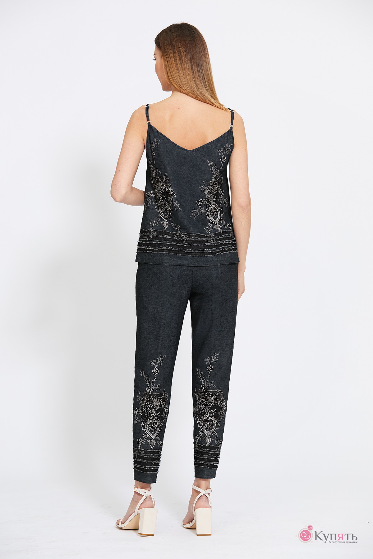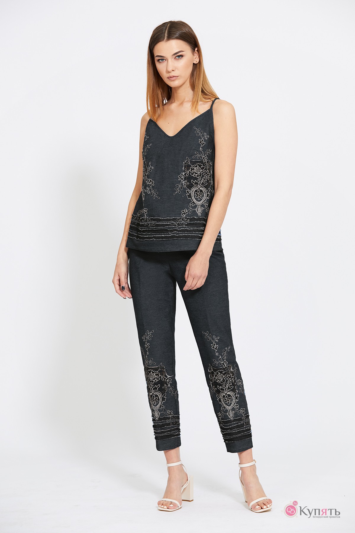 Комплект: брюки + топ. Топ выполнен из однотонной джинсовой ткани с вышивкой, на регулируемых бретелях. Брюки выполнены из однотонной джинсовой ткани с вышивкой, заужены книзу, застежка на декоративную металлическую молнию в среднем шве брюк сзади.