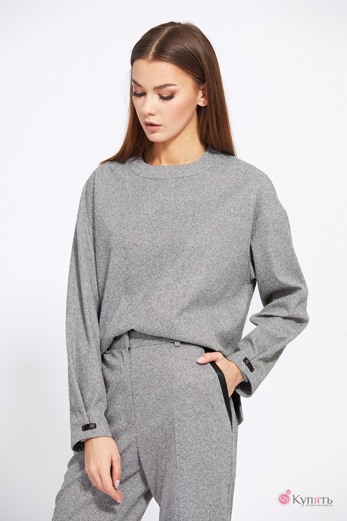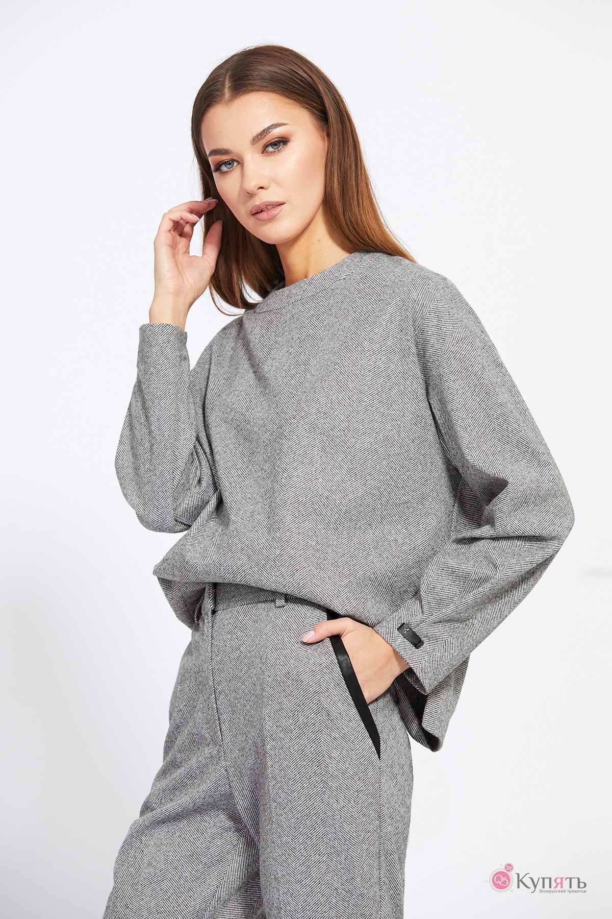 Комплект: джемпер+брюки. Комплект выполнен из трикотажного полотна с рисунком "елочка". Джемпер прямого силуэта, длиной выше линии бедер. Перед и спинка цельные. Застежка сзади сверху на металлическую молнию. Горловина округлой формы, обработана бейкой. Плечевой шов удлинен. Рукав рубашечного покроя, одношовный. Спереди рукава по низу обработана односторонняя складка и пришит декоративный элемент. Спинка джемпера длиннее переда на 4 см, в боковых швах разрезы. Брюки зауженные к низу, на притачном поясе, длиной 7/8. Застежка спереди на молнию с гульфиком, брючный крючок и потайную пуговицу. Спереди боковые карманы с наклонным входом, обработанным широкой окантовкой из эко-кожи. Передние и задние половинки заутюжены на кант.