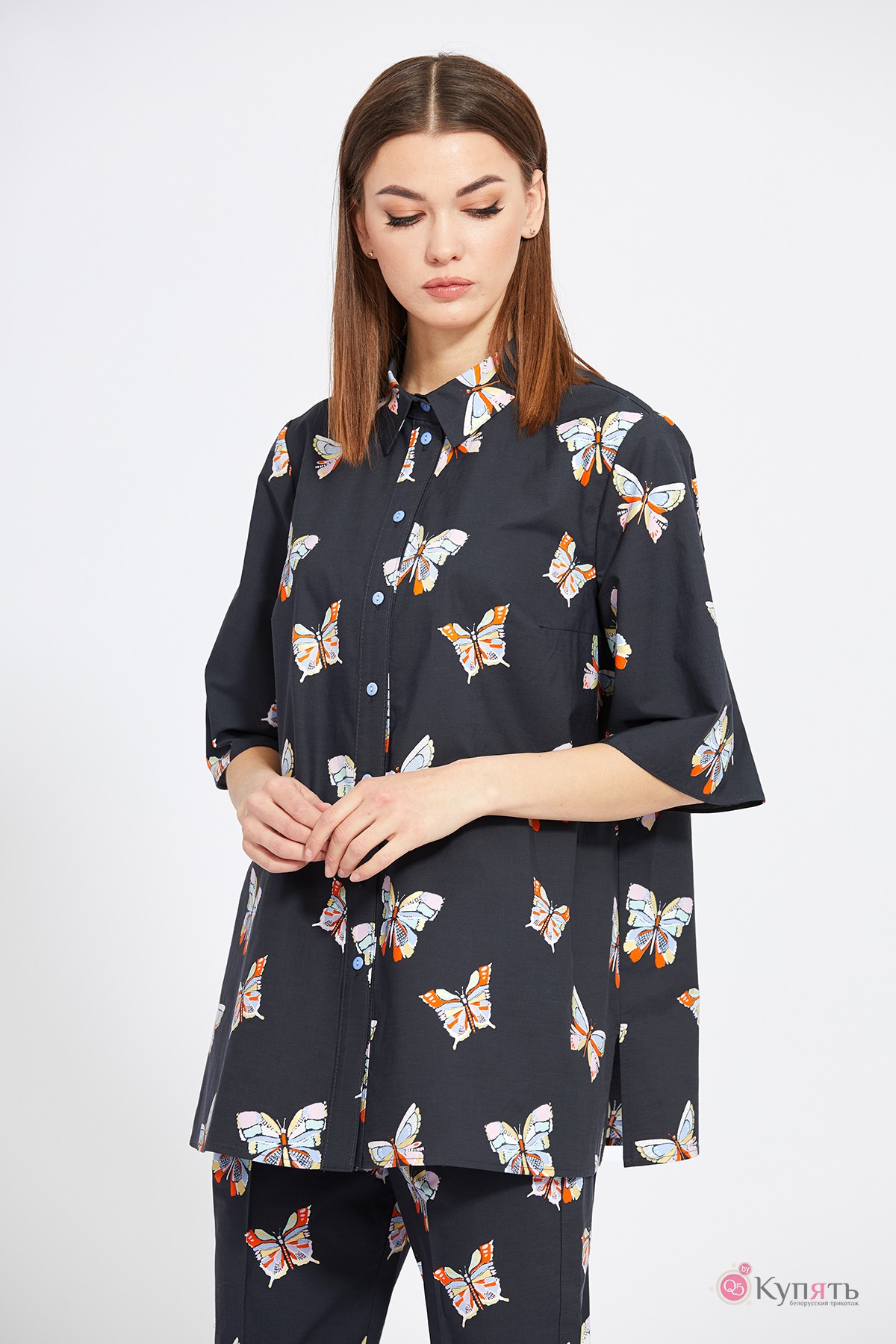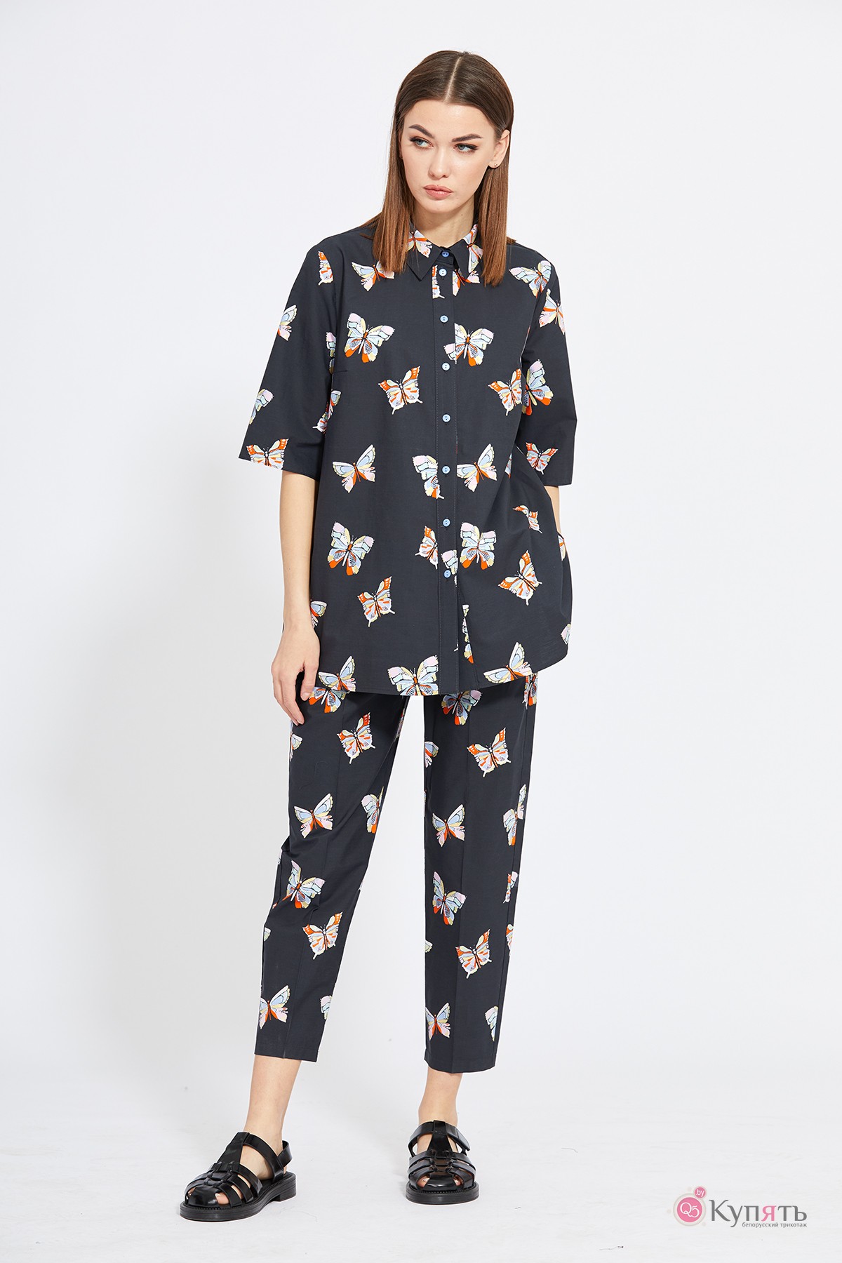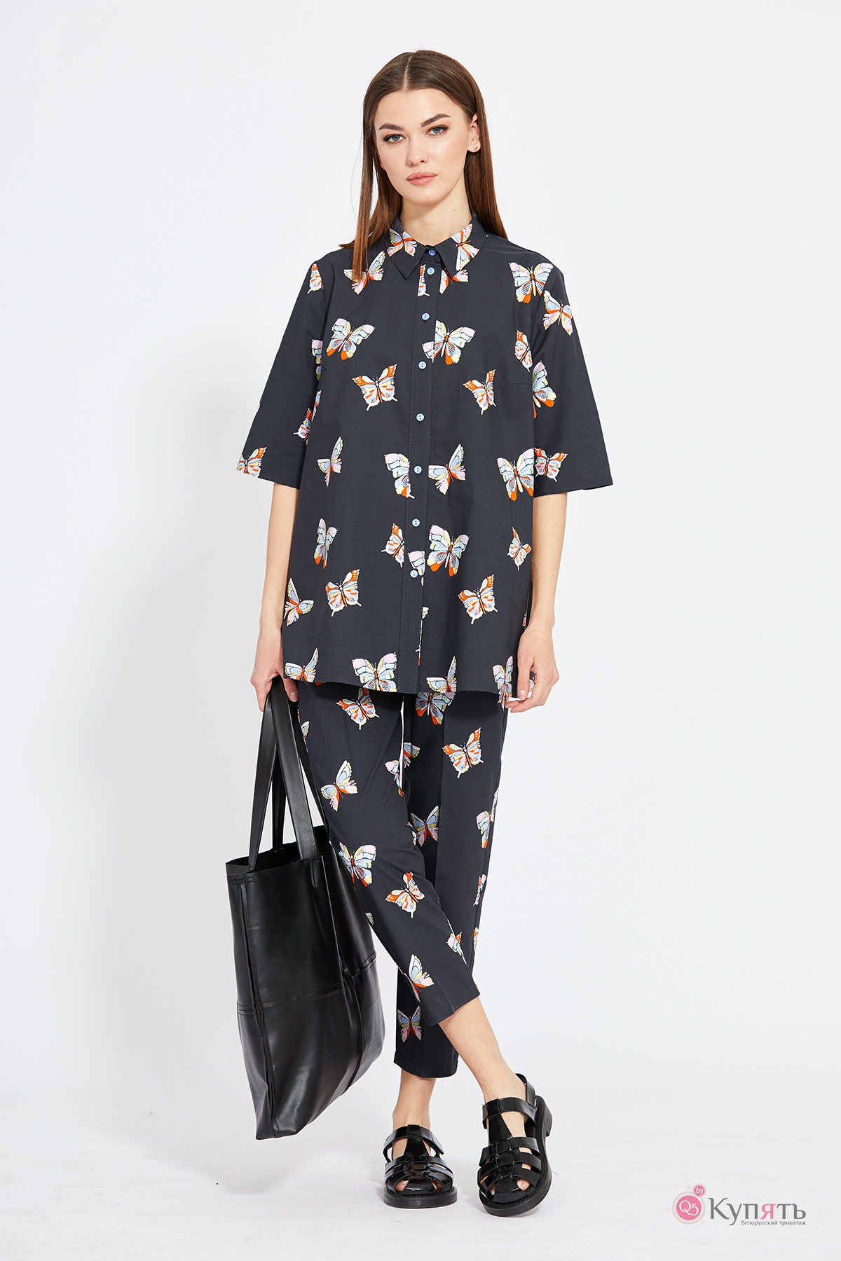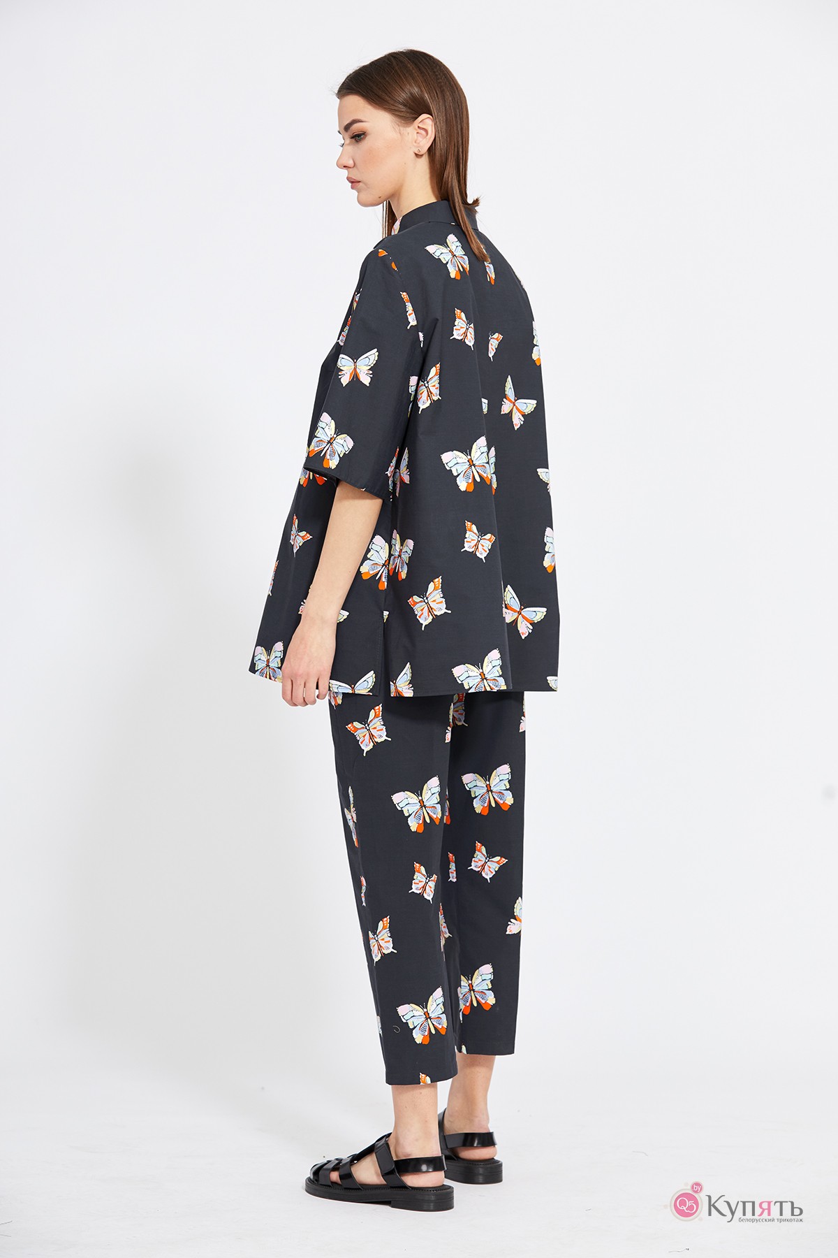 Комплект: блузка + брюки. Комплект выполнен из костюмно-плательной ткани с принтом. Блузка А-образного силуэта, длиной до линии бедер. Спереди центральная застежка на пуговицы, на планке. Воротник стояче-отложной. Рукав втачной, одношовный, длиной до линии локтя, расширенный к низу. Брюки на притачном поясе, длиной 7/8, заужены к низу. Застежка спереди на молнию с гульфиком. Спереди боковые карманы с наклонным входом. Пояс по спинке на эластичной тесьме. Передние половинки брюк заутюжены на кант.