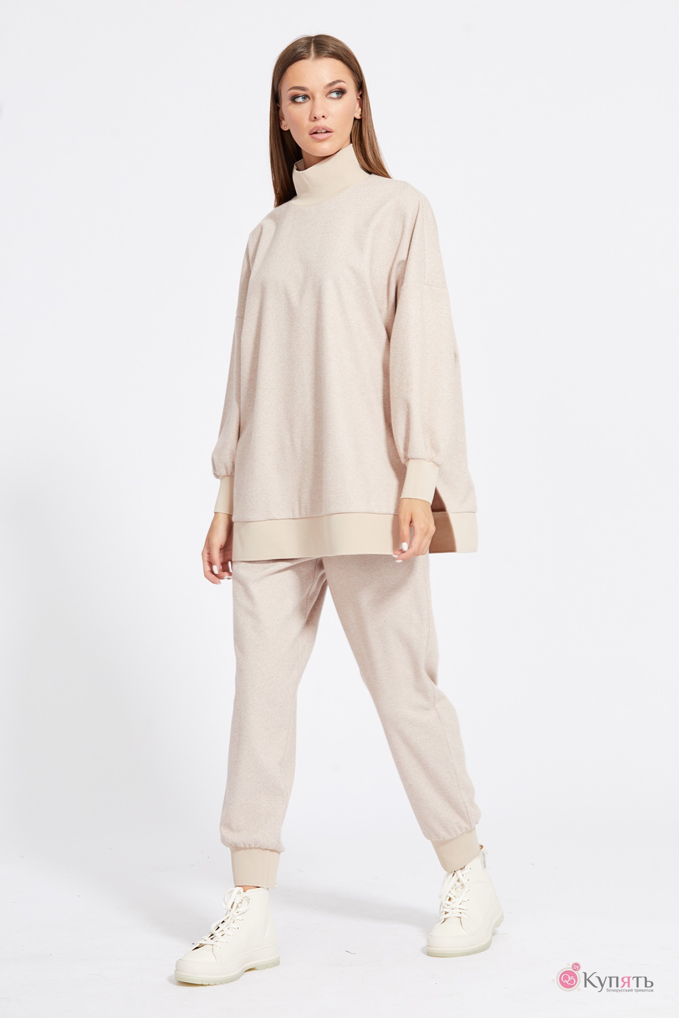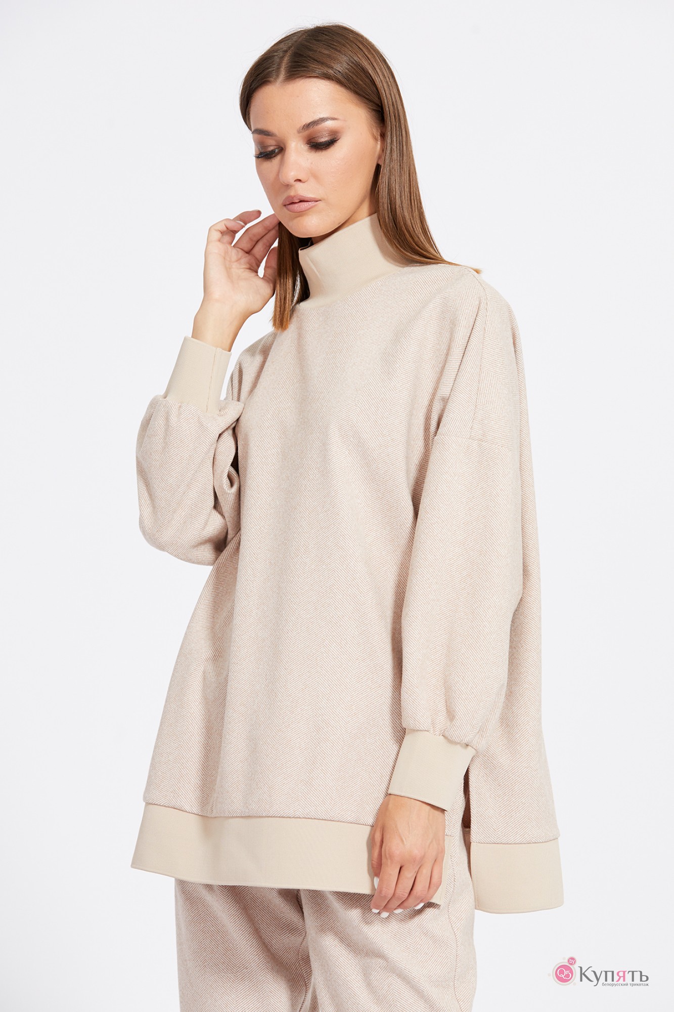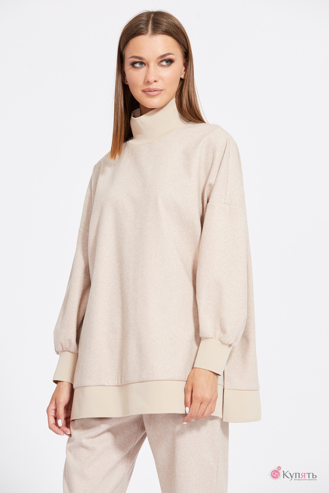 "Комплект: джемпер+брюки. Комплект выполнен из трикотажного полотна с рисунком ""елочка"". Джемпер прямого силуэта, длиной ниже линии бедер. Перед и спинка цельные. Воротник-стойка выполнен из довяза. Плечевой шов удлинен. Рукав и низ джемпера на притачной манжете из довяза. В боковых швах разрезы. Брюки зауженны к низу, на притачном поясе с эластичной тесьмой, длиной 7/8. Спереди боковые карманы с фигурным входом. Низ брюк на притачной манжете из довяза.