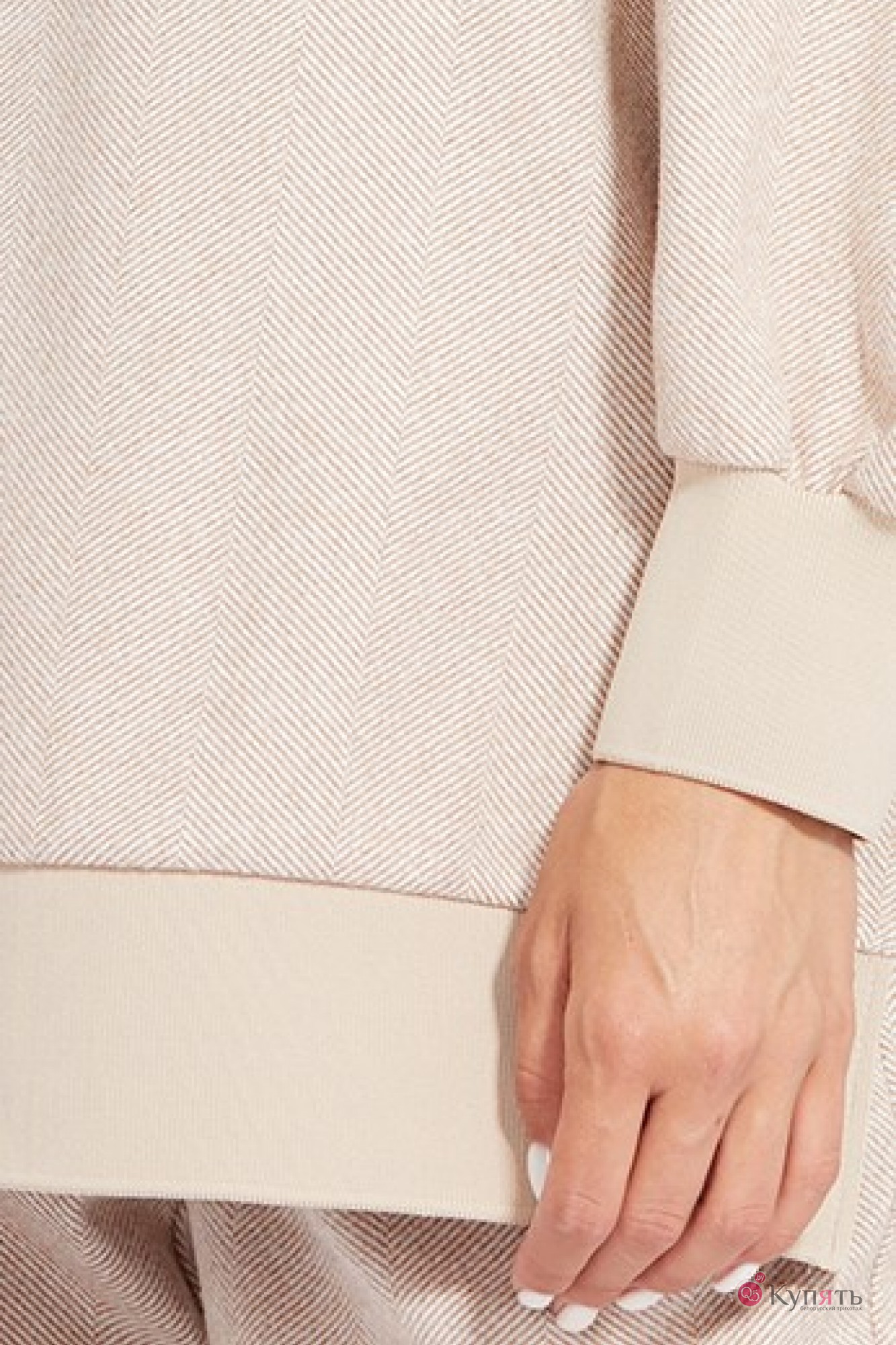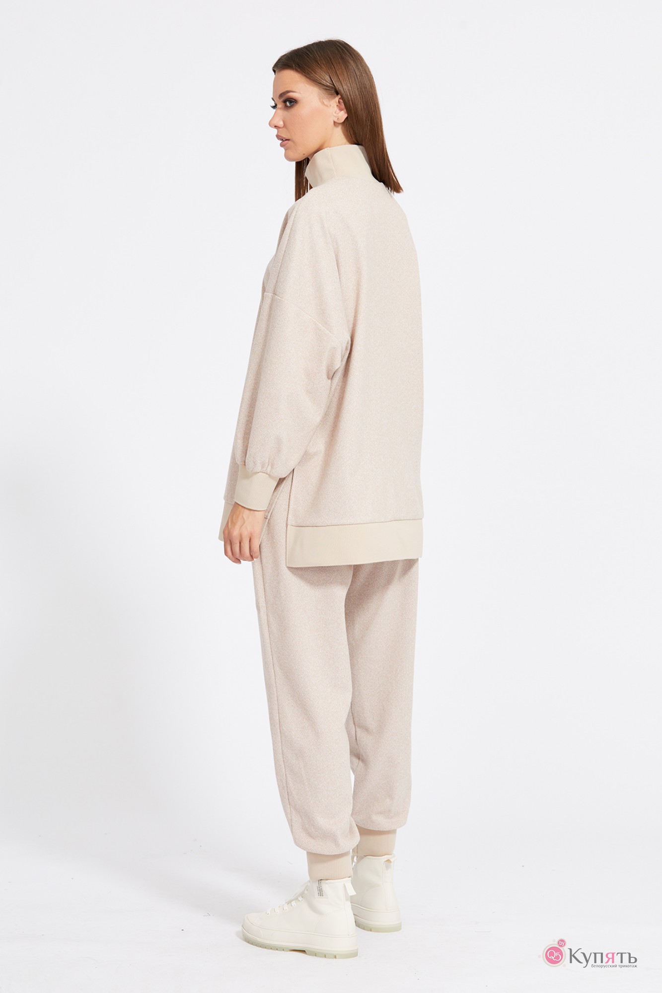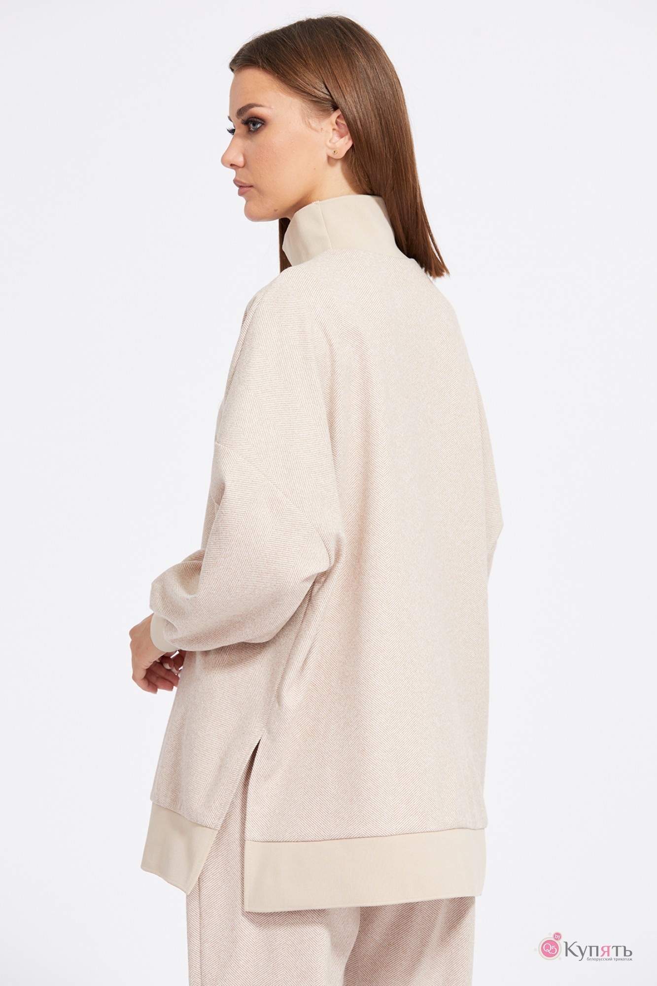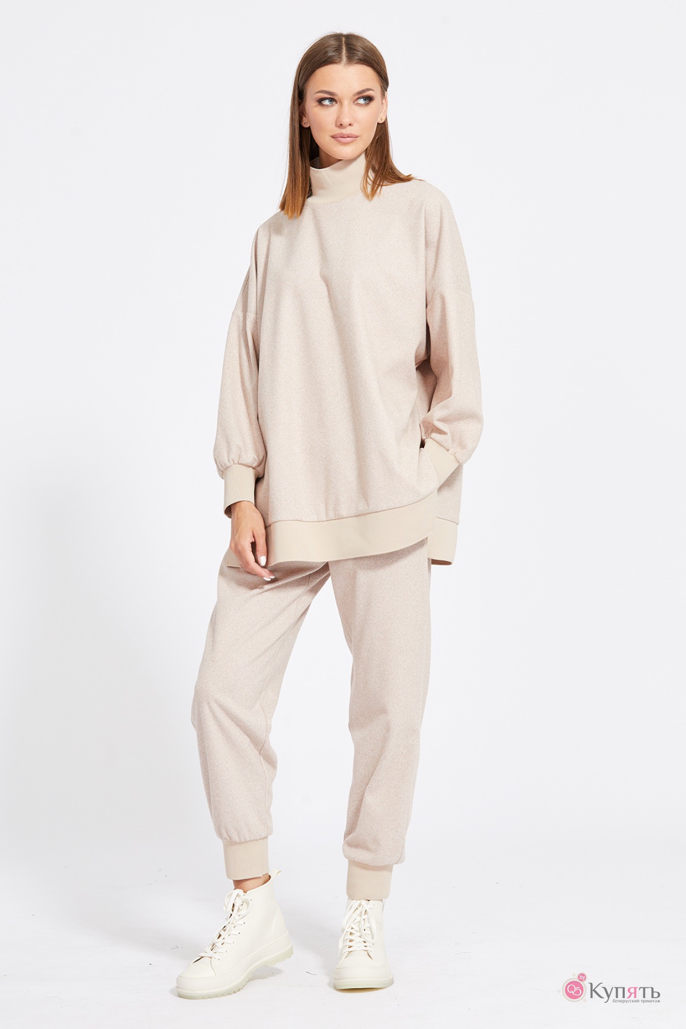 "Комплект: джемпер+брюки. Комплект выполнен из трикотажного полотна с рисунком ""елочка"". Джемпер прямого силуэта, длиной ниже линии бедер. Перед и спинка цельные. Воротник-стойка выполнен из довяза. Плечевой шов удлинен. Рукав и низ джемпера на притачной манжете из довяза. В боковых швах разрезы. Брюки зауженны к низу, на притачном поясе с эластичной тесьмой, длиной 7/8. Спереди боковые карманы с фигурным входом. Низ брюк на притачной манжете из довяза.