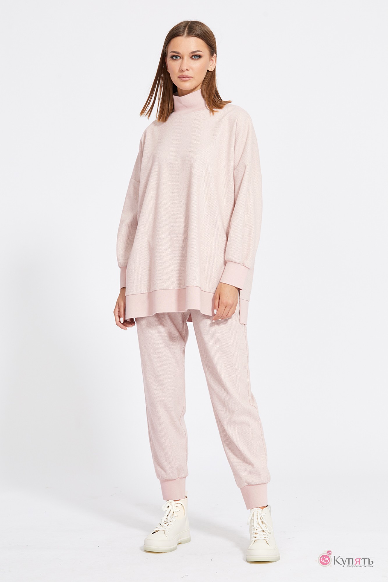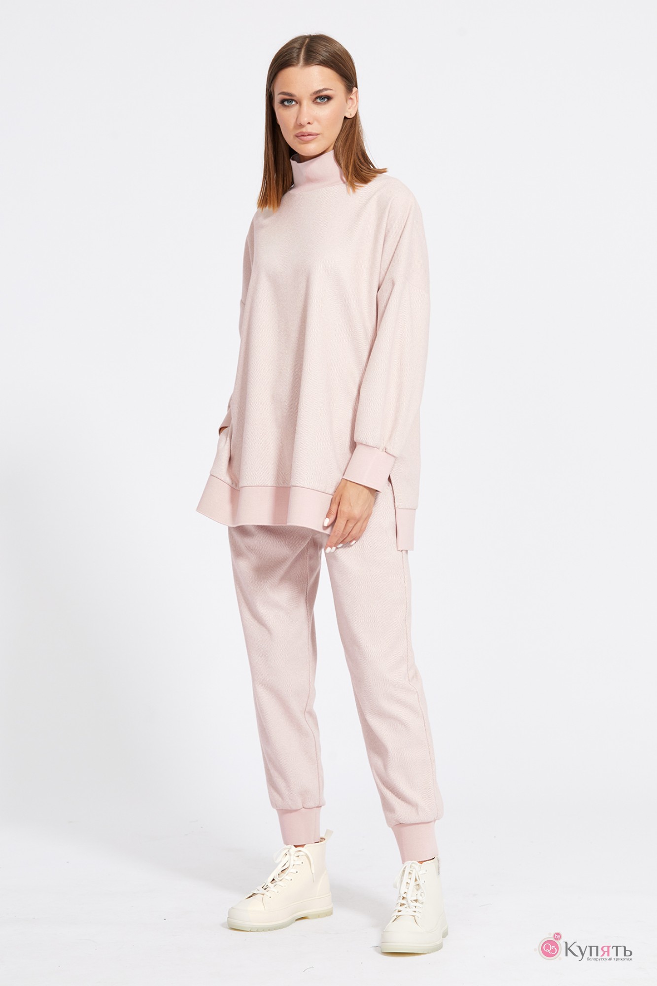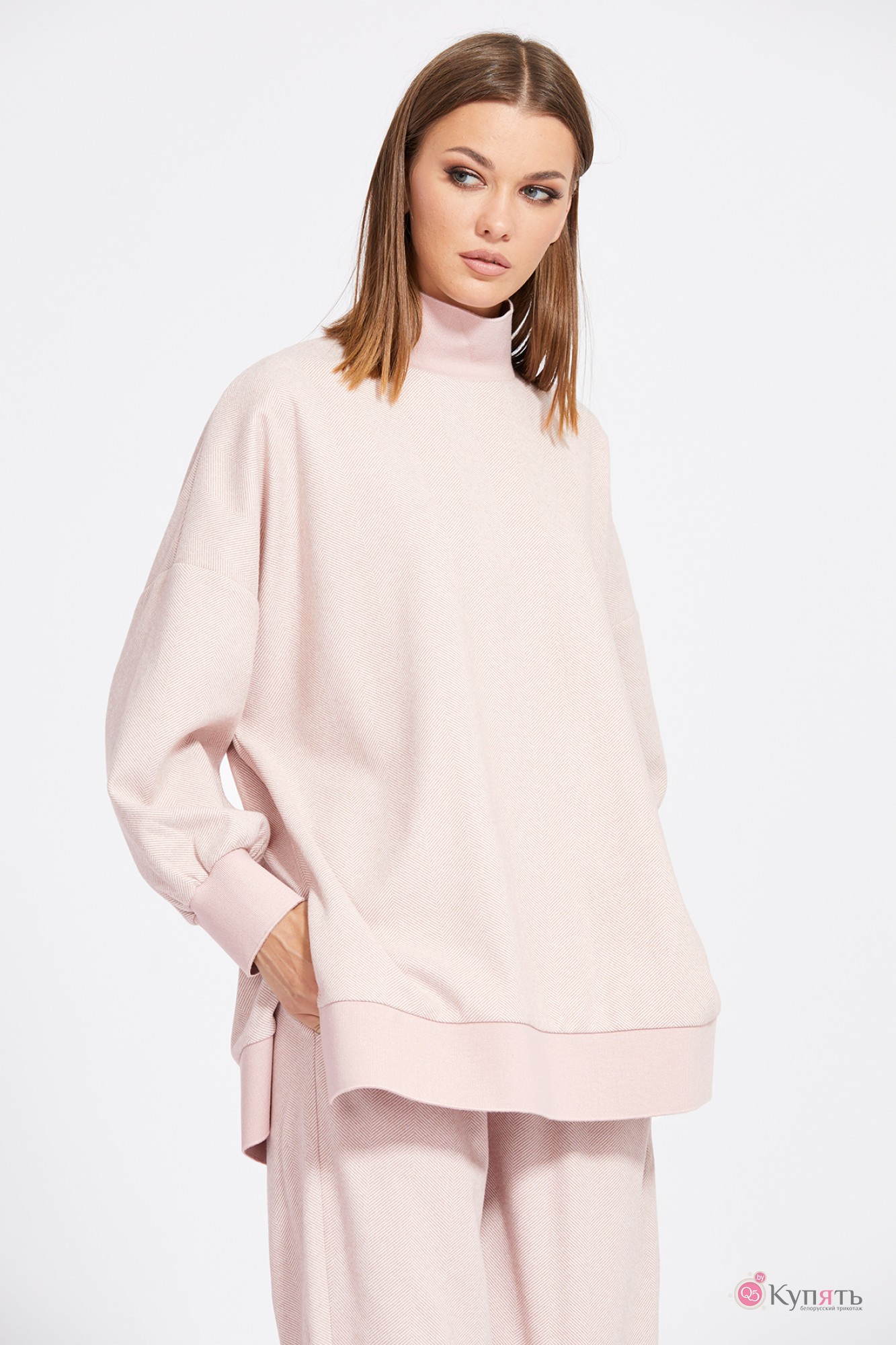 "Комплект: джемпер+брюки. Комплект выполнен из трикотажного полотна с рисунком ""елочка"". Джемпер прямого силуэта, длиной ниже линии бедер. Перед и спинка цельные. Воротник-стойка выполнен из довяза. Плечевой шов удлинен. Рукав и низ джемпера на притачной манжете из довяза. В боковых швах разрезы. Брюки зауженны к низу, на притачном поясе с эластичной тесьмой, длиной 7/8. Спереди боковые карманы с фигурным входом. Низ брюк на притачной манжете из довяза.