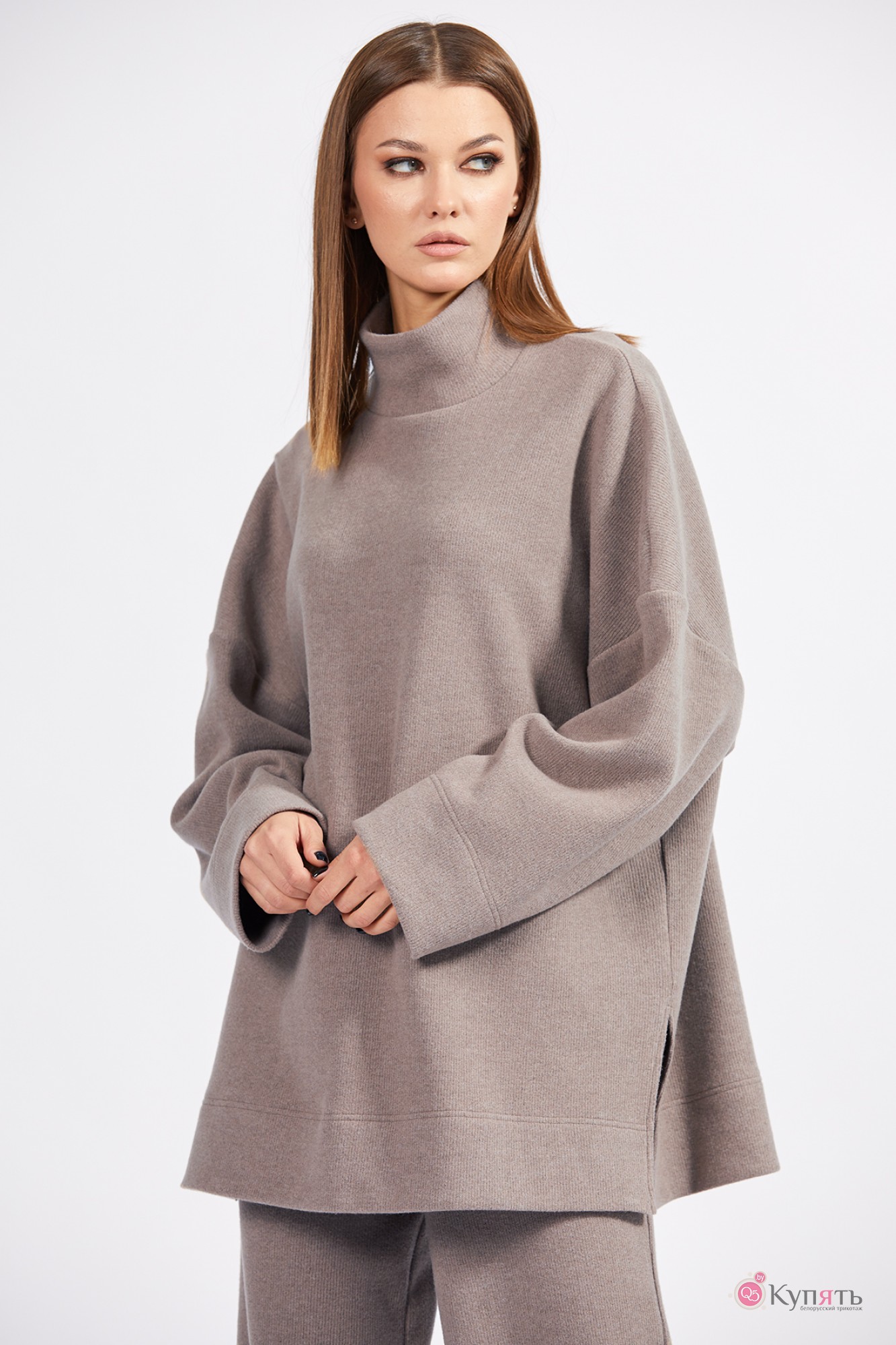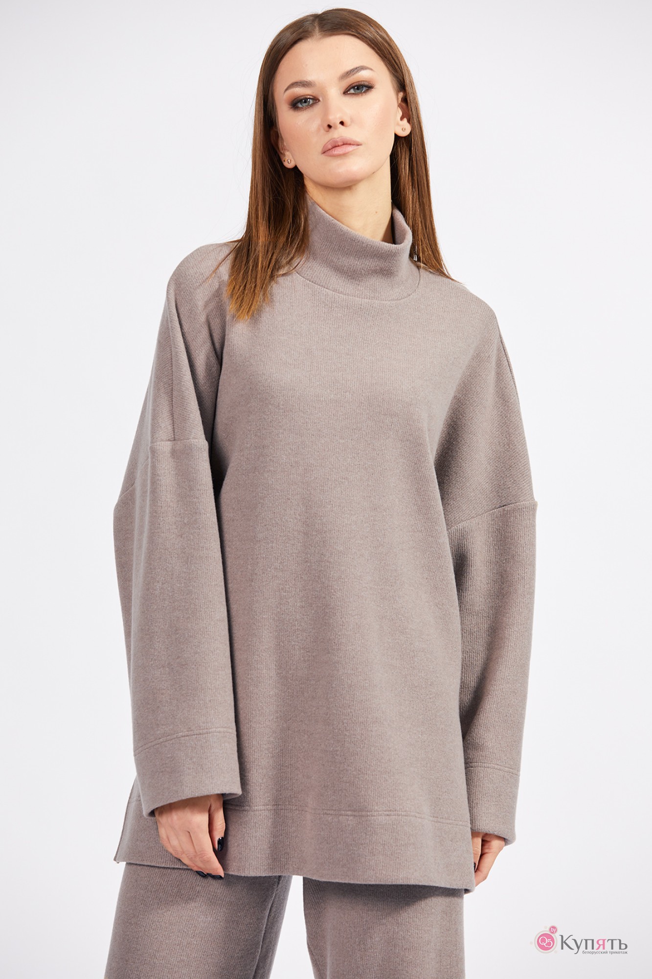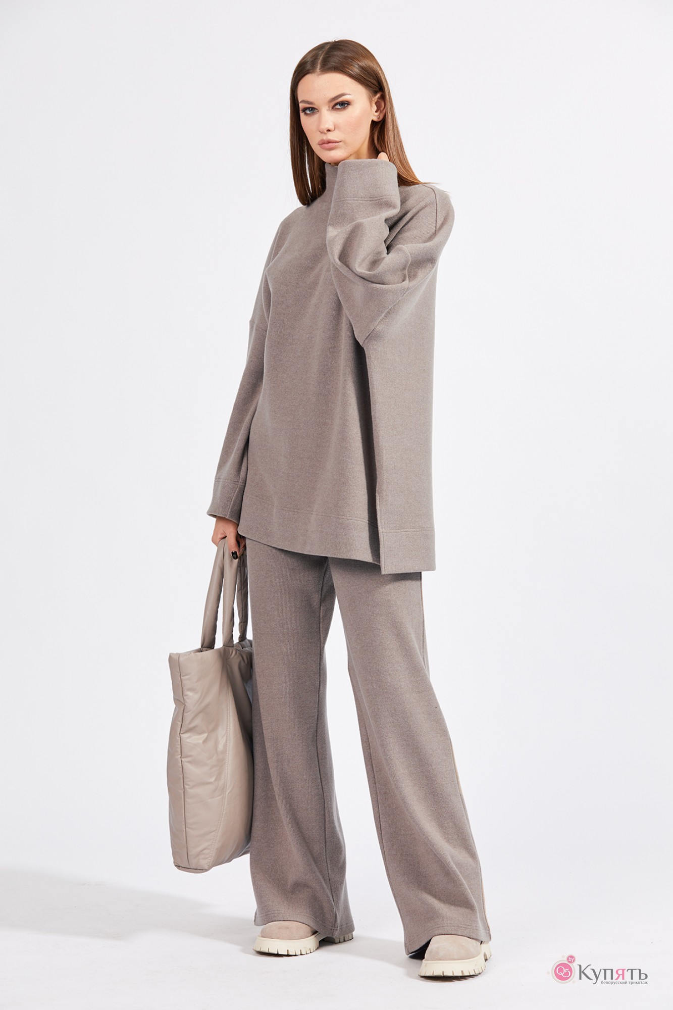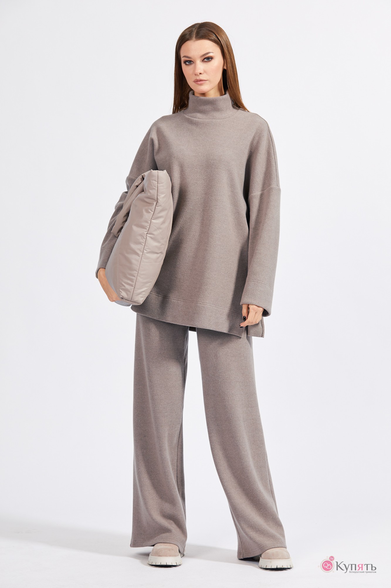 "Комплект: джемпер+брюки. Комплект выполнен из из однотонного трикотажного полотна. Джемпер прямого силуэта, длиной ниже линии бедер. Перед и спинка цельные. Воротник-стойка. Плечевой шов спущен. В боковых швах разрезы. Брюки прямого силуэта, длиной в пол. Брюки на притачном поясе с эластичной тесьмой. (Внимание: полотно с небольшим ворсом, следовательно, подвержено образованию катышков.)