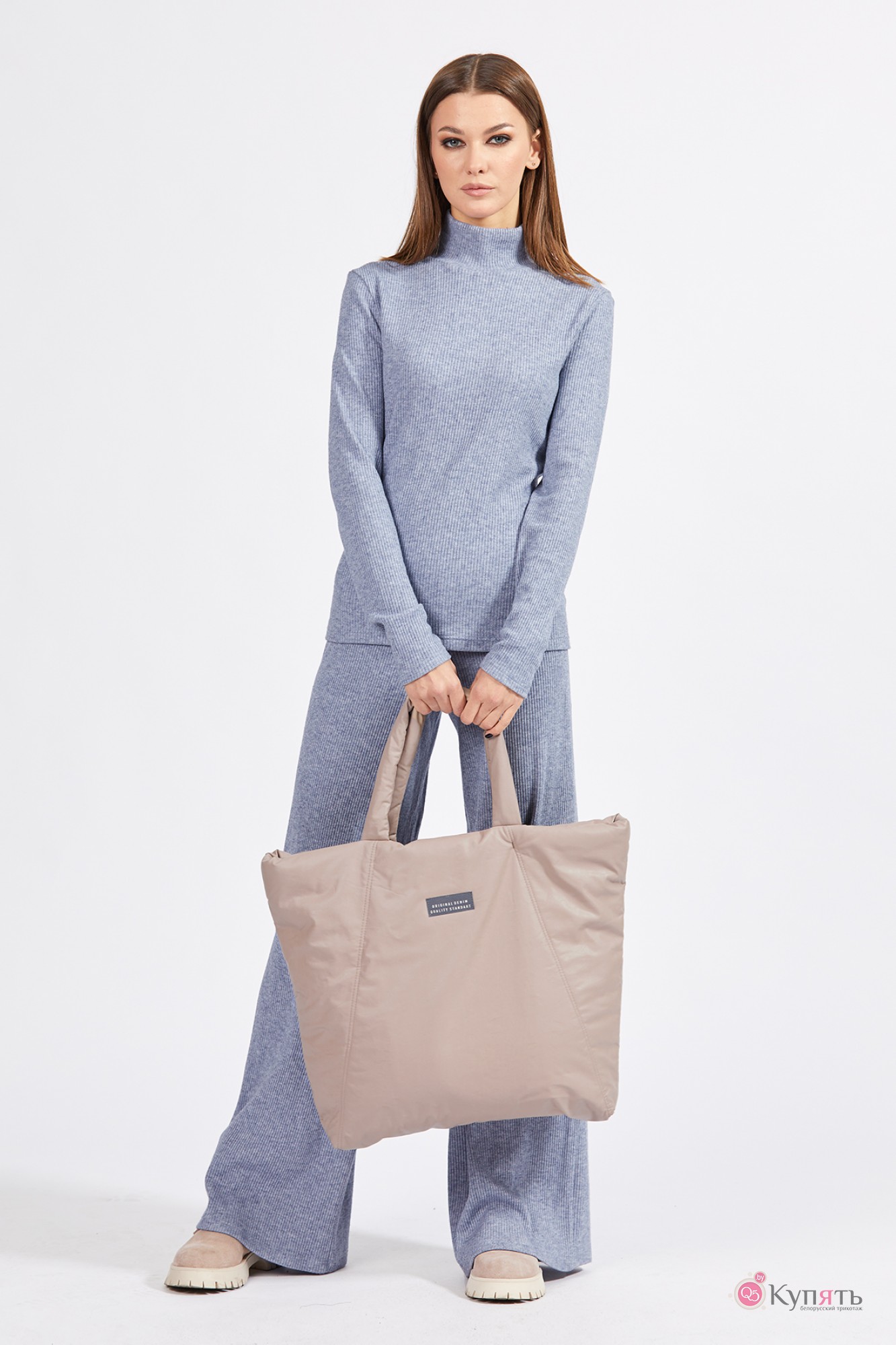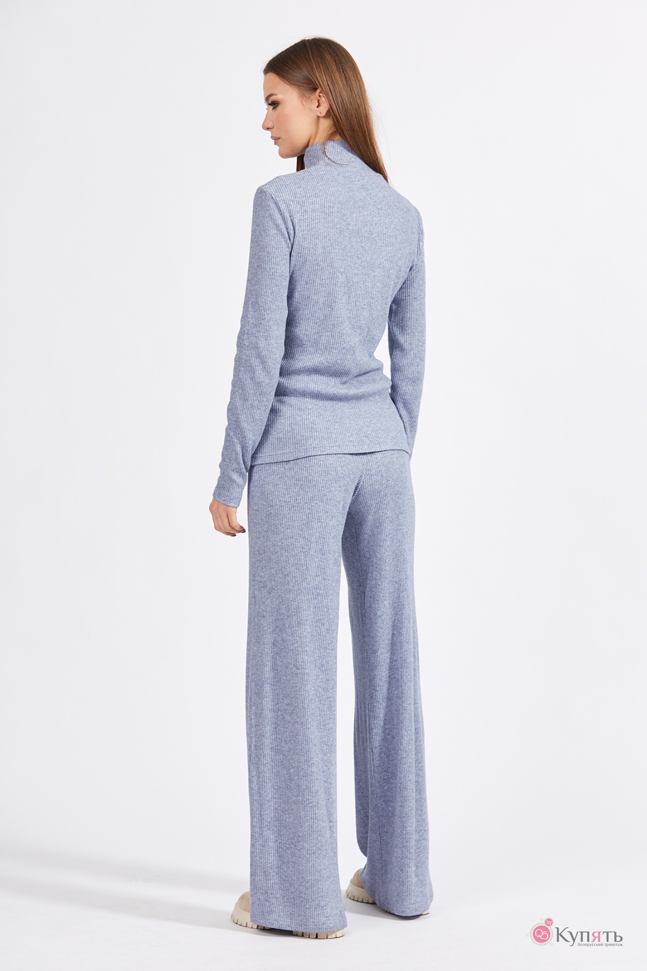 "Комплект: джемпер+брюки. Комплект выполнен из меланжевого трикотажного полотна в рубчик. Джемпер прилегающего силуэта, длиной до линии бедер. Перед и спинка цельные. Воротник-стойка. Брюки прямого силуэта, длиной в пол. Брюки на притачном поясе с эластичной тесьмой.