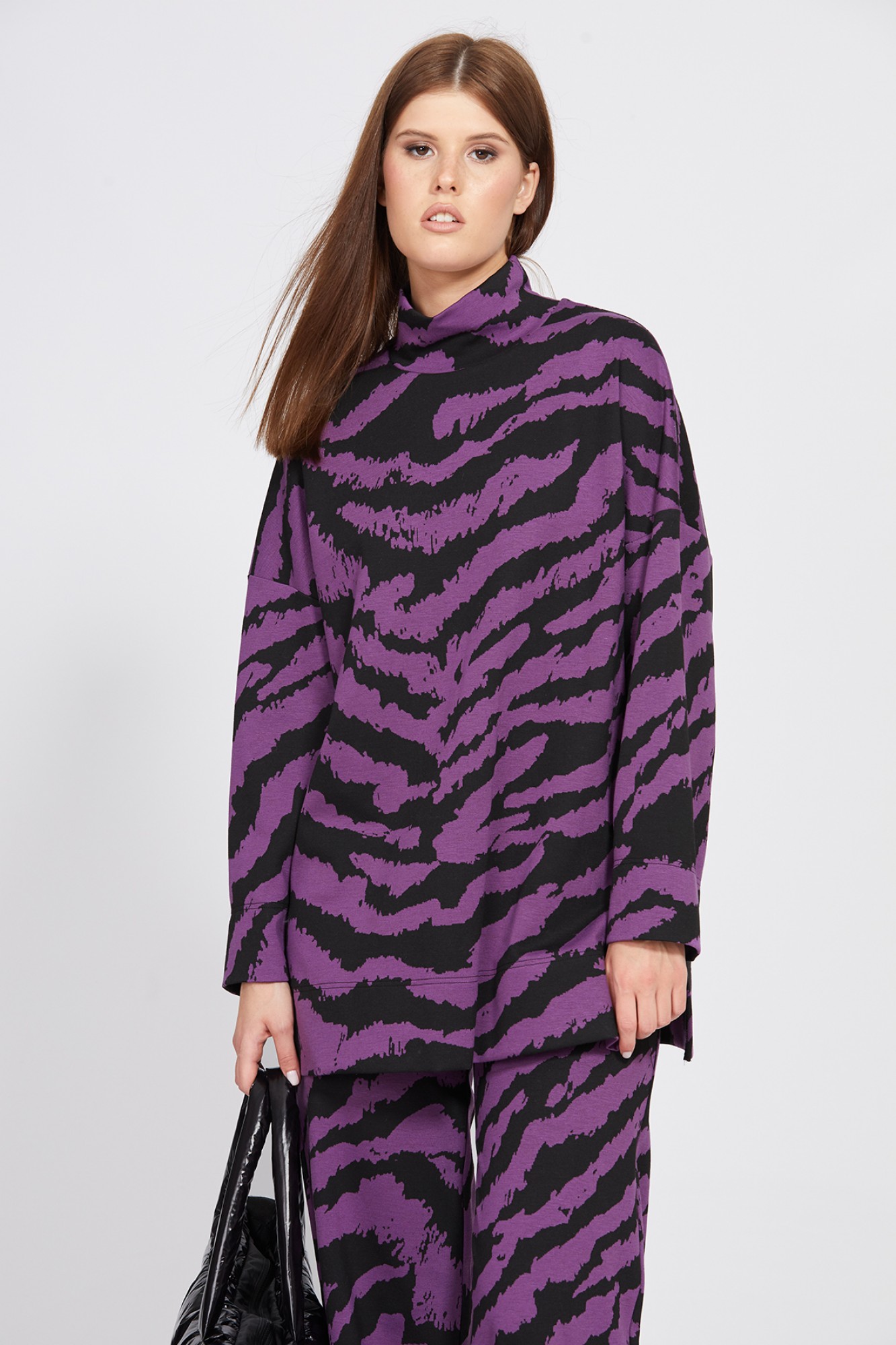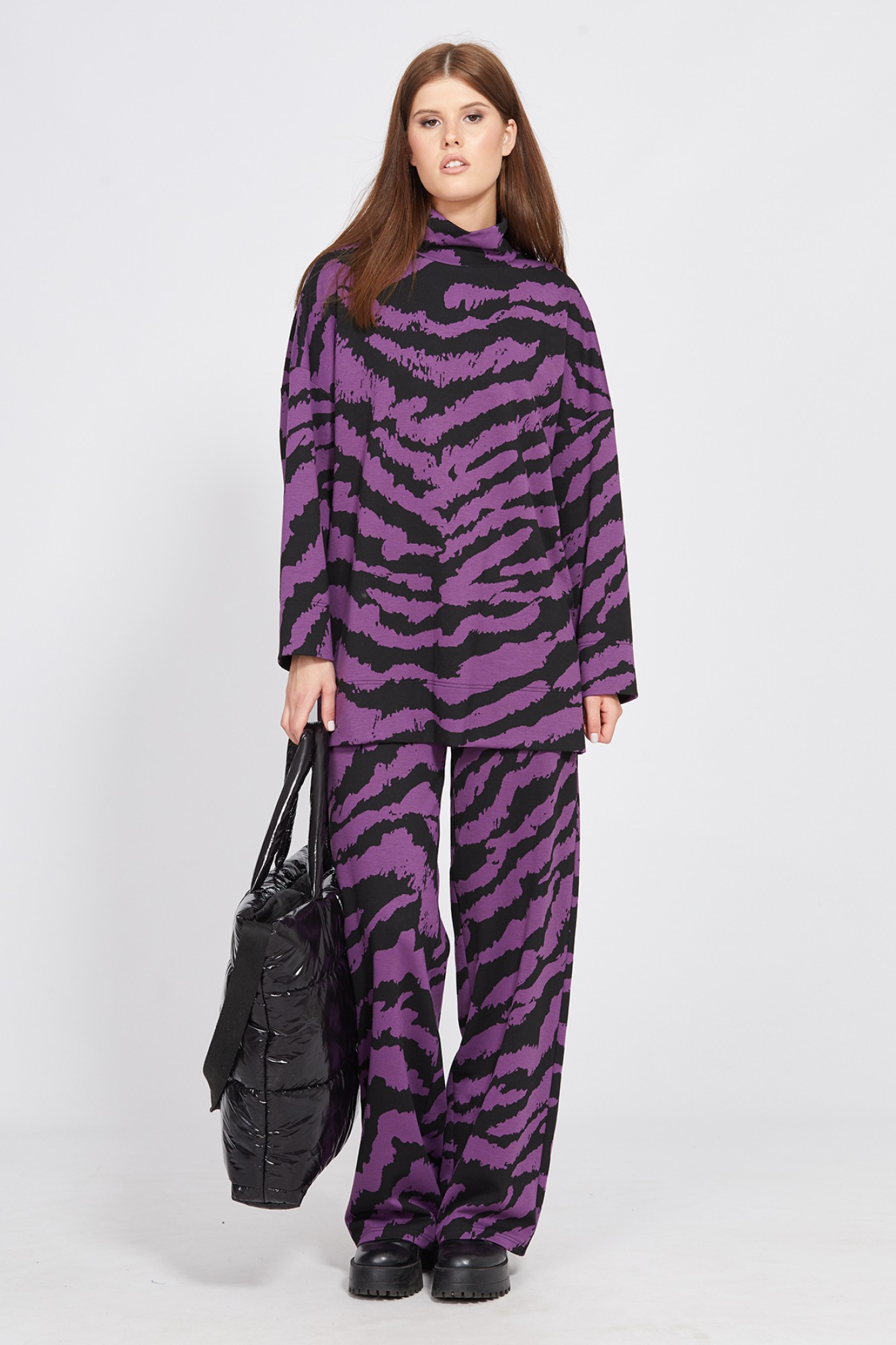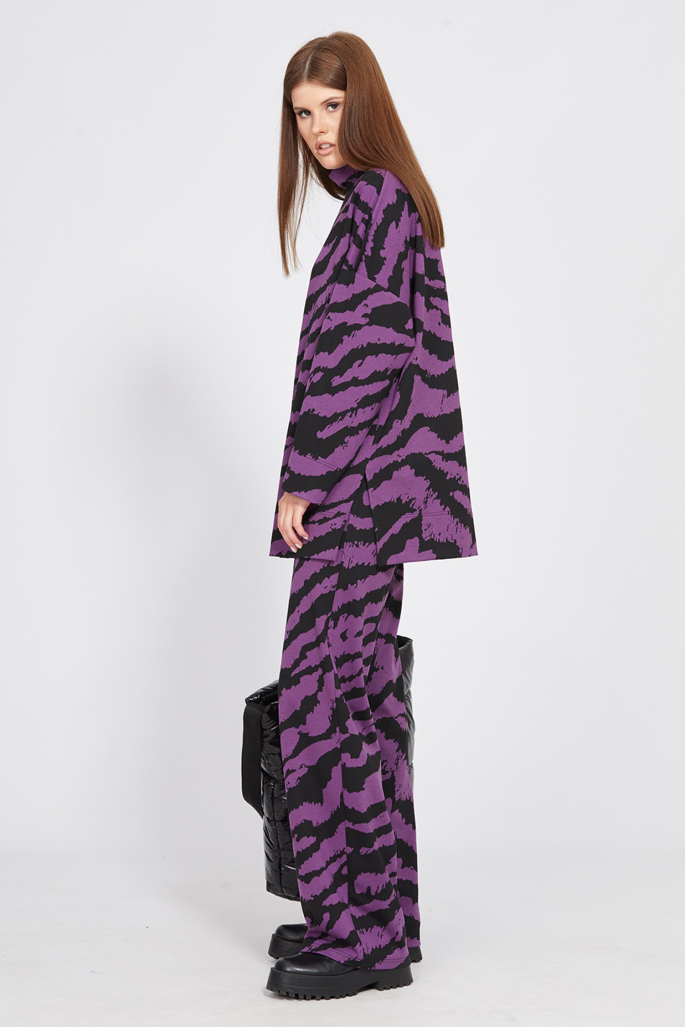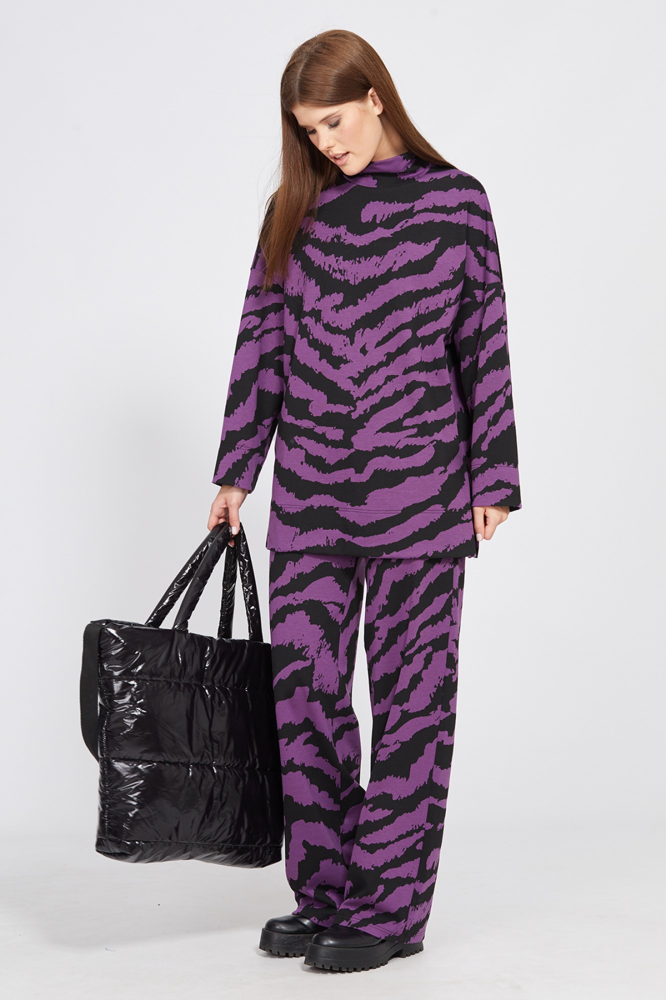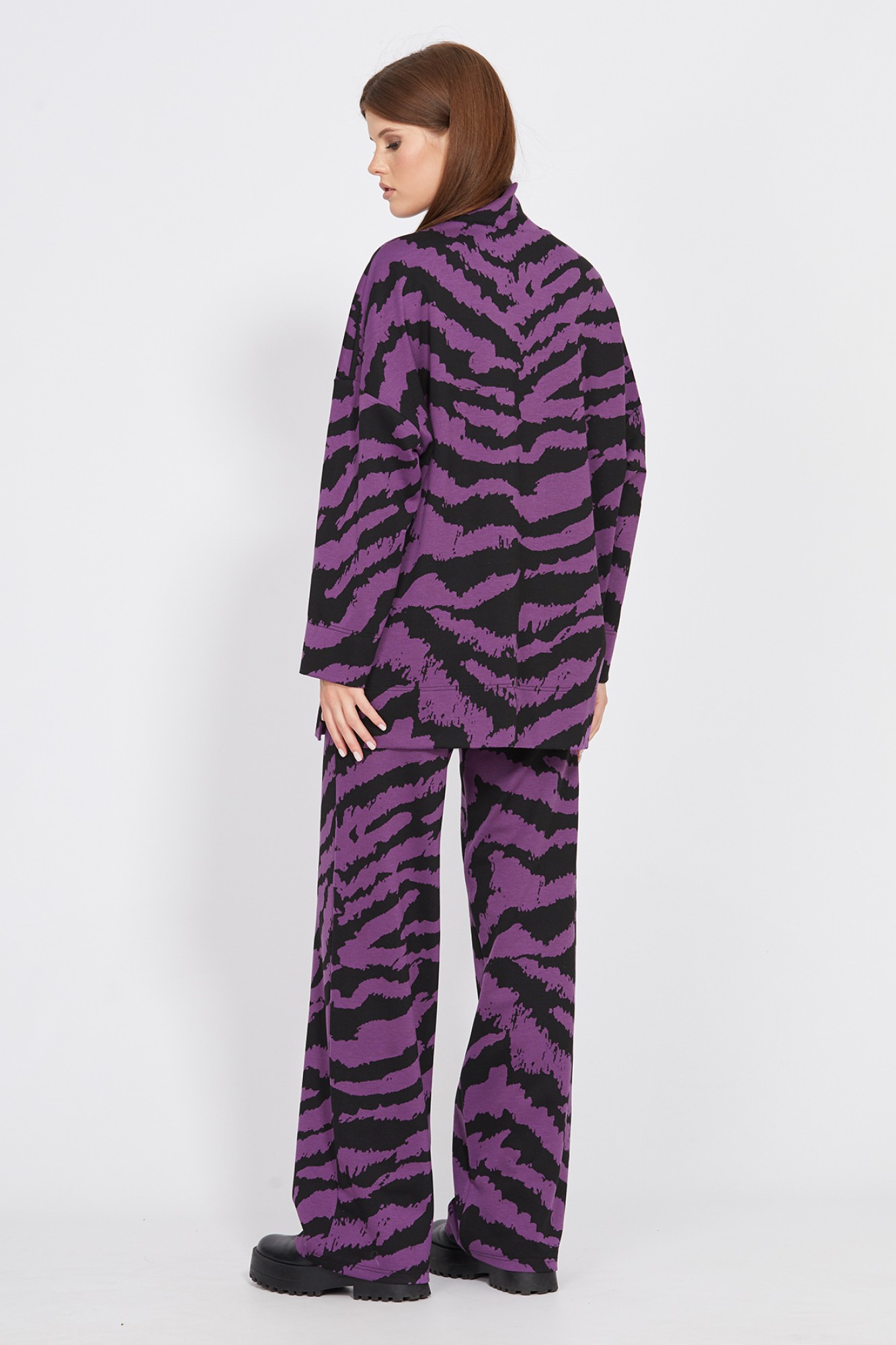 Комплект: джемпер + брюки. Комплект выполнен из трикотажного полотна с анималистичным принтом. Джемпер прямого силуэта, длиной ниже линии бедра. Перед и спинка цельные. Воротник-стойка. Рукав рубашечного покроя, одношовный. Низ рукава и джемпера обработан широкой подгибкой. В боковых швах разрезы. Брюки прямого силуэта, длиной в пол. Брюки на притачном поясе с эластичной тесьмой.