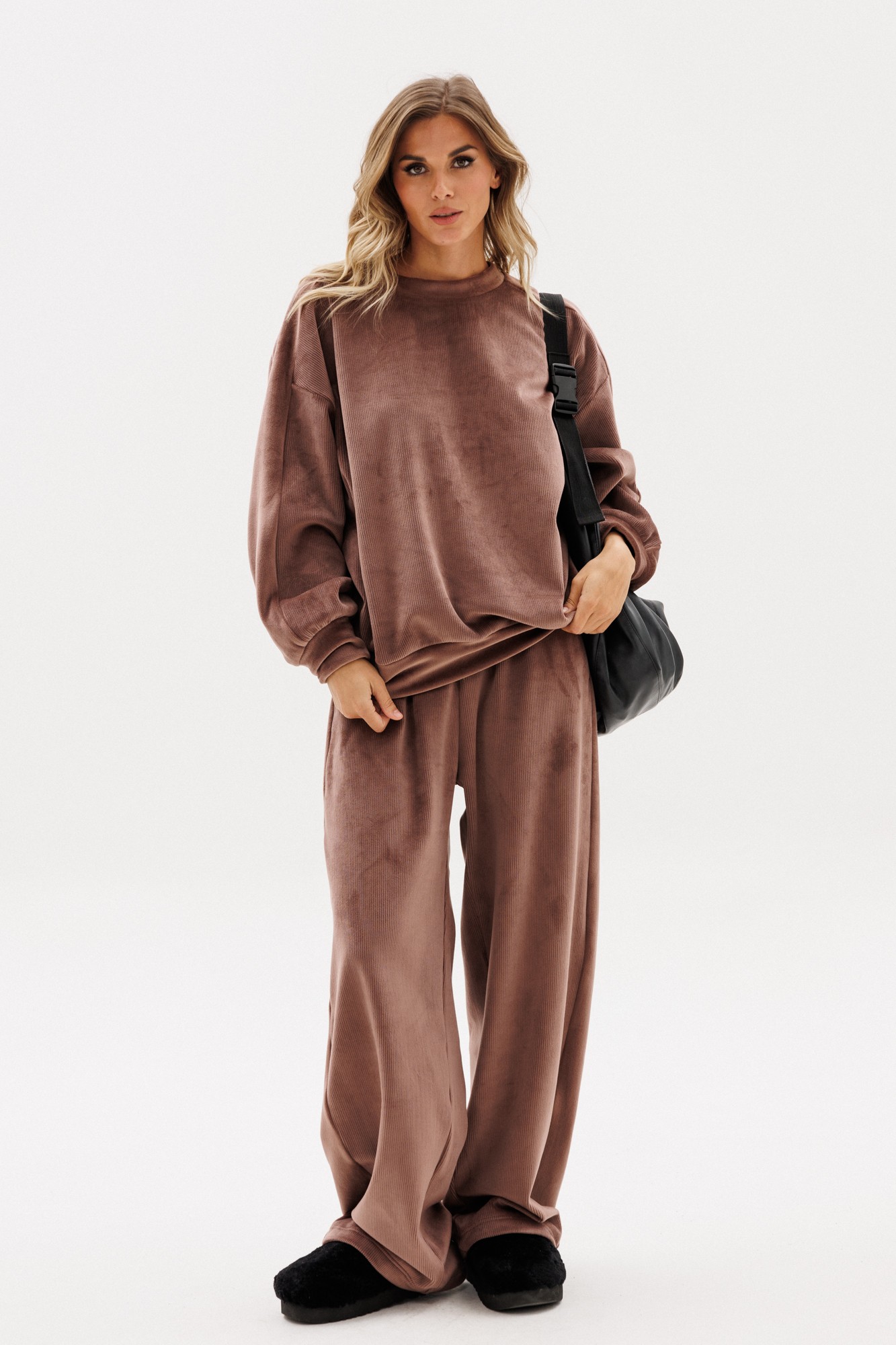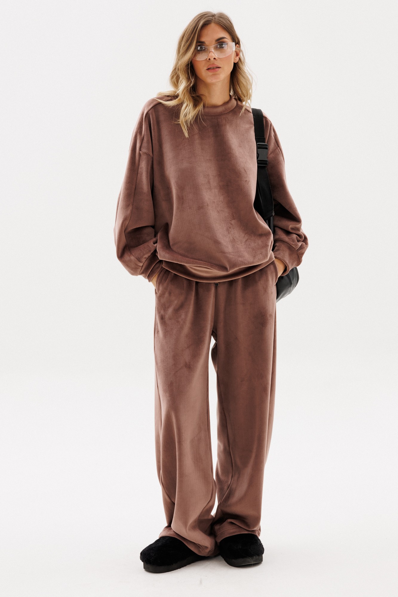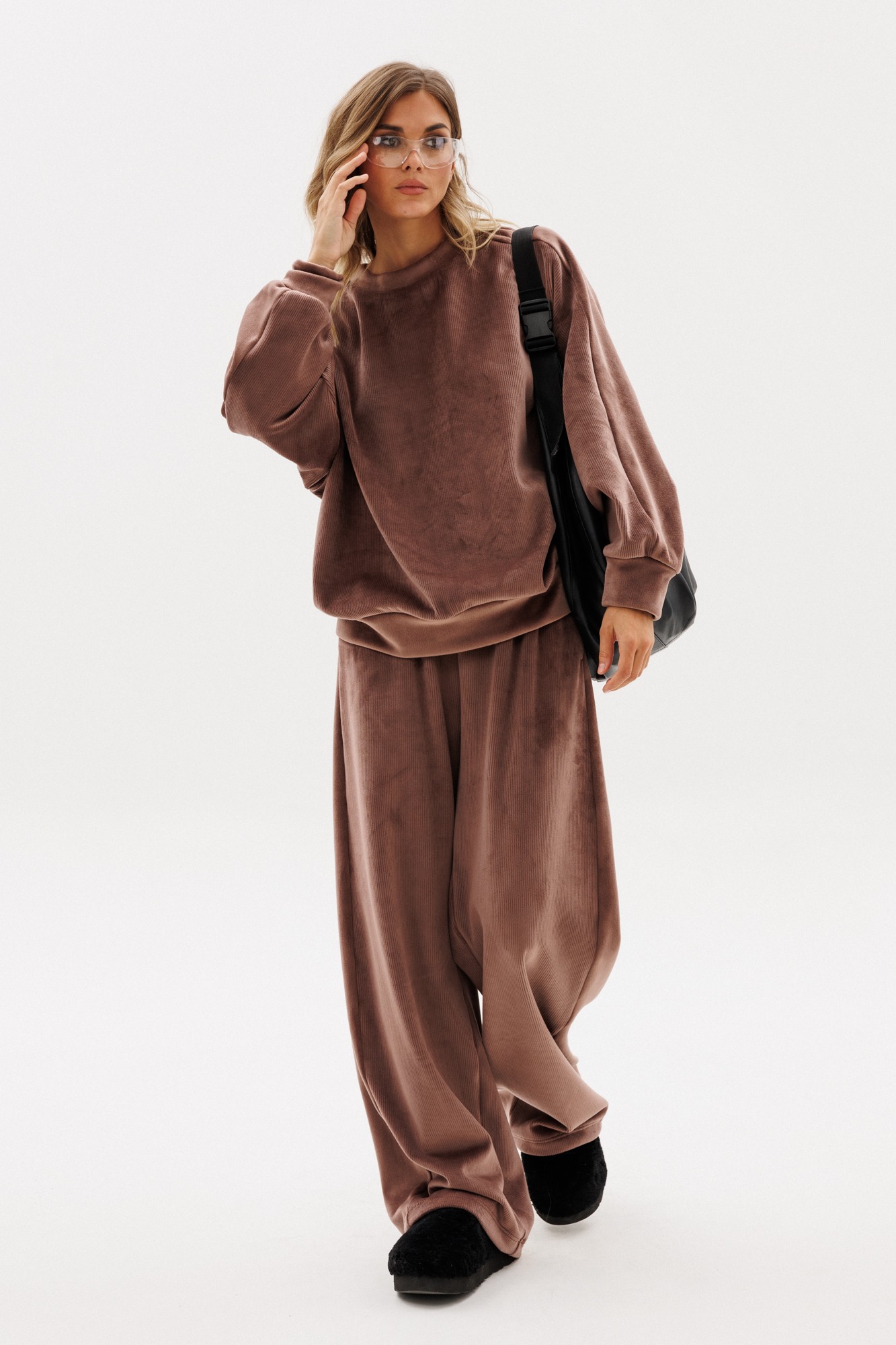 Комплект: джемпер+брюки. Комплект выполнен из двустороннего велюра в мелкий рубчик. Джемпер О-образного силуэта, покроя ""oversize"", длиной до линии бедер. Перед и спинка цельные. Горловина округлой формы, обработана бейкой. Плечевой шов удлинен. Рукав рубашечного покроя, одношовный. Низ рукава на манжете. Верхняя часть рукава переходит в кокетку переда т спинки и доходит до горловины. По низу джемпера обработан пояс. Пояс, манжеты, верхняя часть рукава и бейка горловины выполнены из основной, но без рубчика. Брюки на притачном поясе с эластичной тесьмой, прямого силуэта, длиной в пол, покроя ""oversize"". Боковой шов заменен лампасом. В швах лампаса карманы. Сзади накладные карманы. В пояс протянут шнур с наконечниками. По низу брюк втянута эластичная тесьма с фиксаторами. Лампасы и пояс выполнены из основной ткани, но без рубчика.