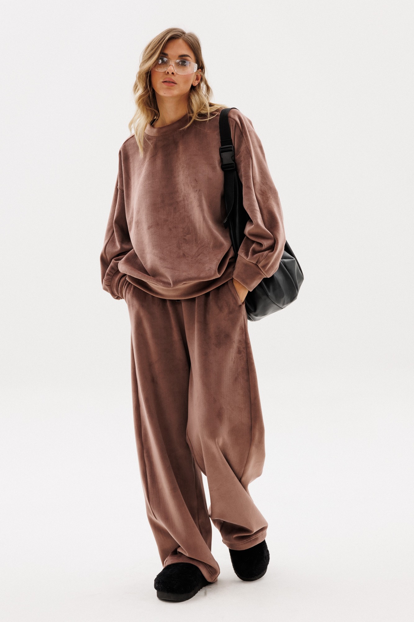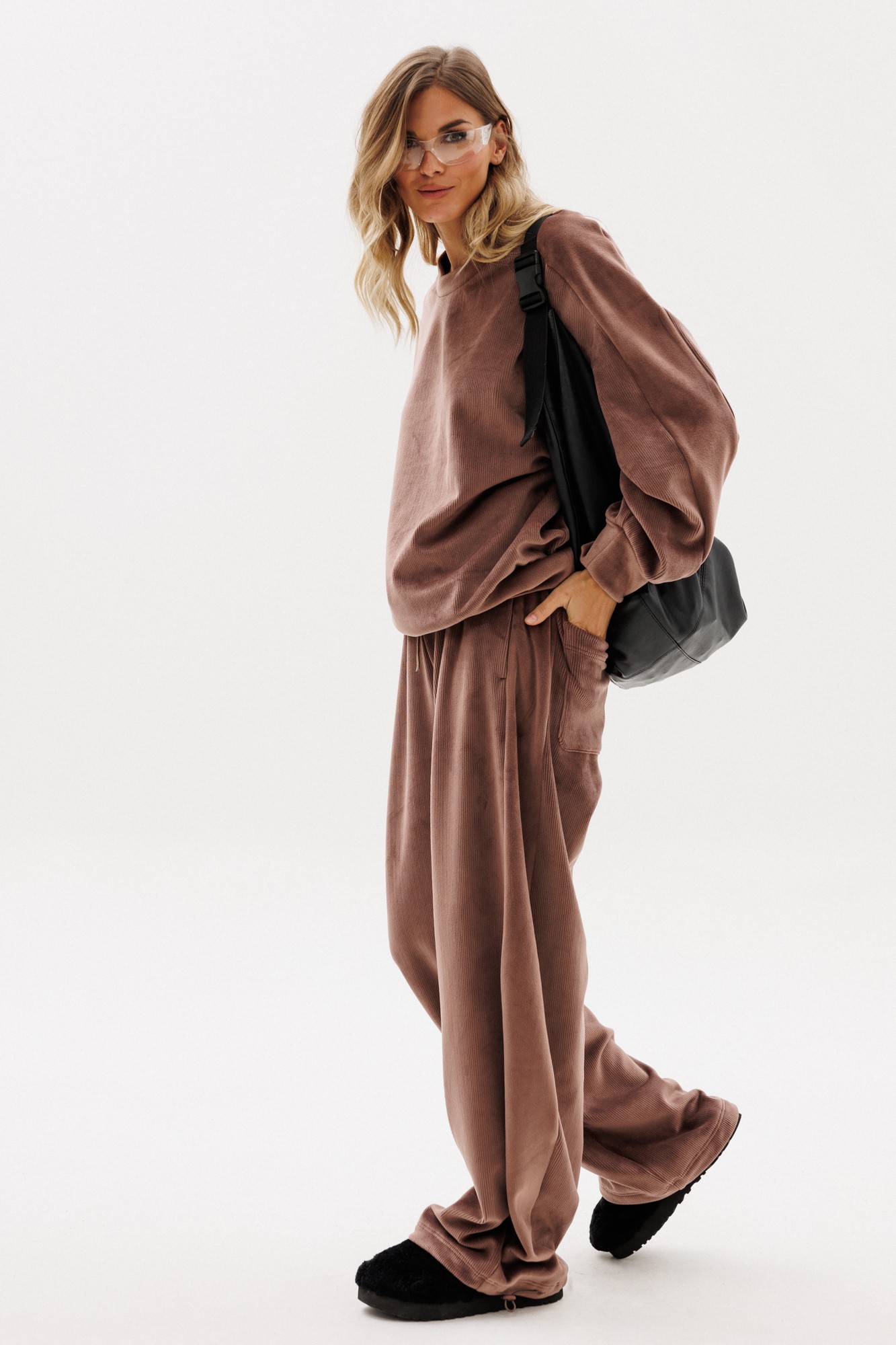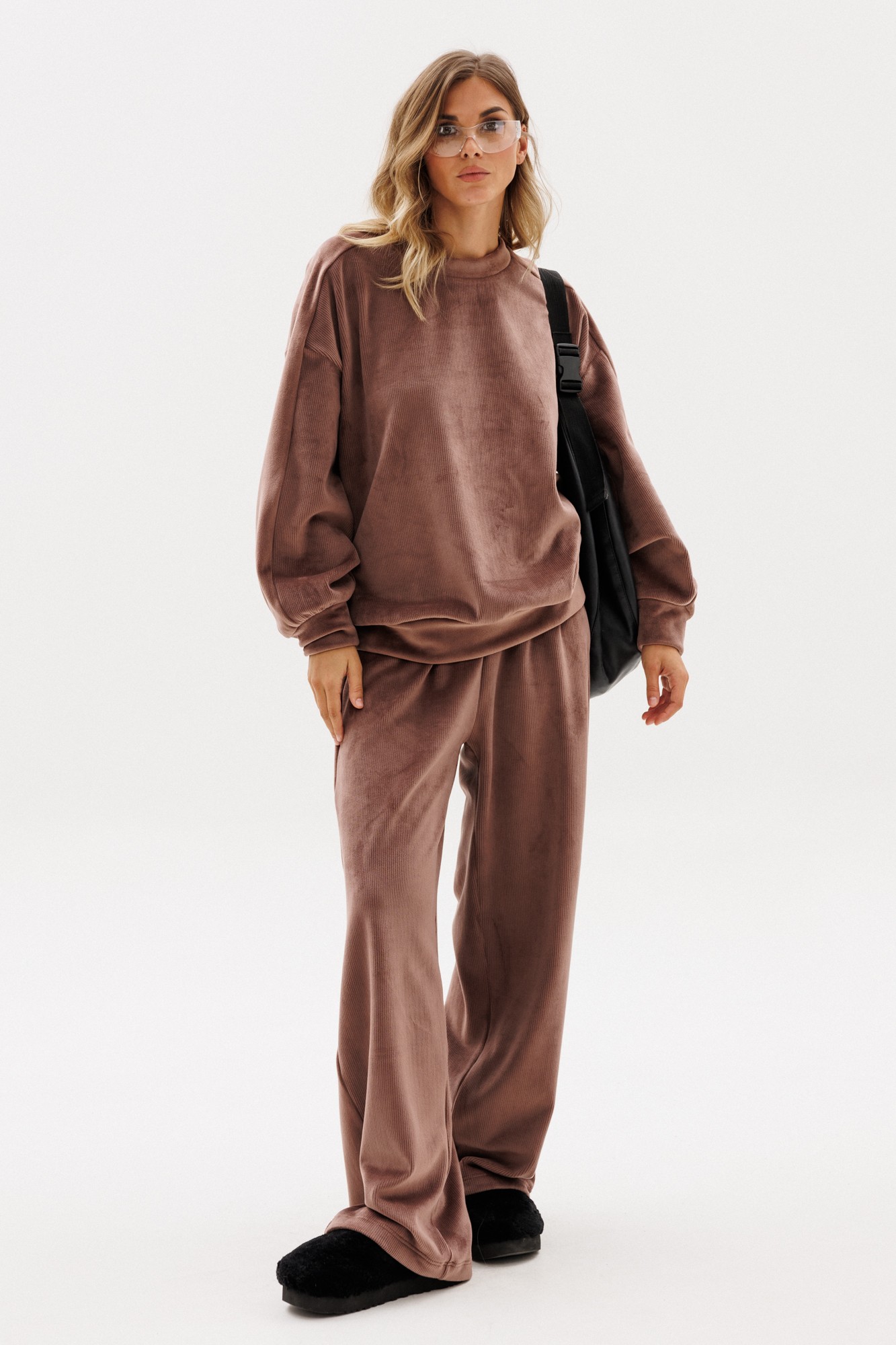Комплект: джемпер+брюки. Комплект выполнен из двустороннего велюра в мелкий рубчик. Джемпер О-образного силуэта, покроя ""oversize"", длиной до линии бедер. Перед и спинка цельные. Горловина округлой формы, обработана бейкой. Плечевой шов удлинен. Рукав рубашечного покроя, одношовный. Низ рукава на манжете. Верхняя часть рукава переходит в кокетку переда т спинки и доходит до горловины. По низу джемпера обработан пояс. Пояс, манжеты, верхняя часть рукава и бейка горловины выполнены из основной, но без рубчика. Брюки на притачном поясе с эластичной тесьмой, прямого силуэта, длиной в пол, покроя ""oversize"". Боковой шов заменен лампасом. В швах лампаса карманы. Сзади накладные карманы. В пояс протянут шнур с наконечниками. По низу брюк втянута эластичная тесьма с фиксаторами. Лампасы и пояс выполнены из основной ткани, но без рубчика.