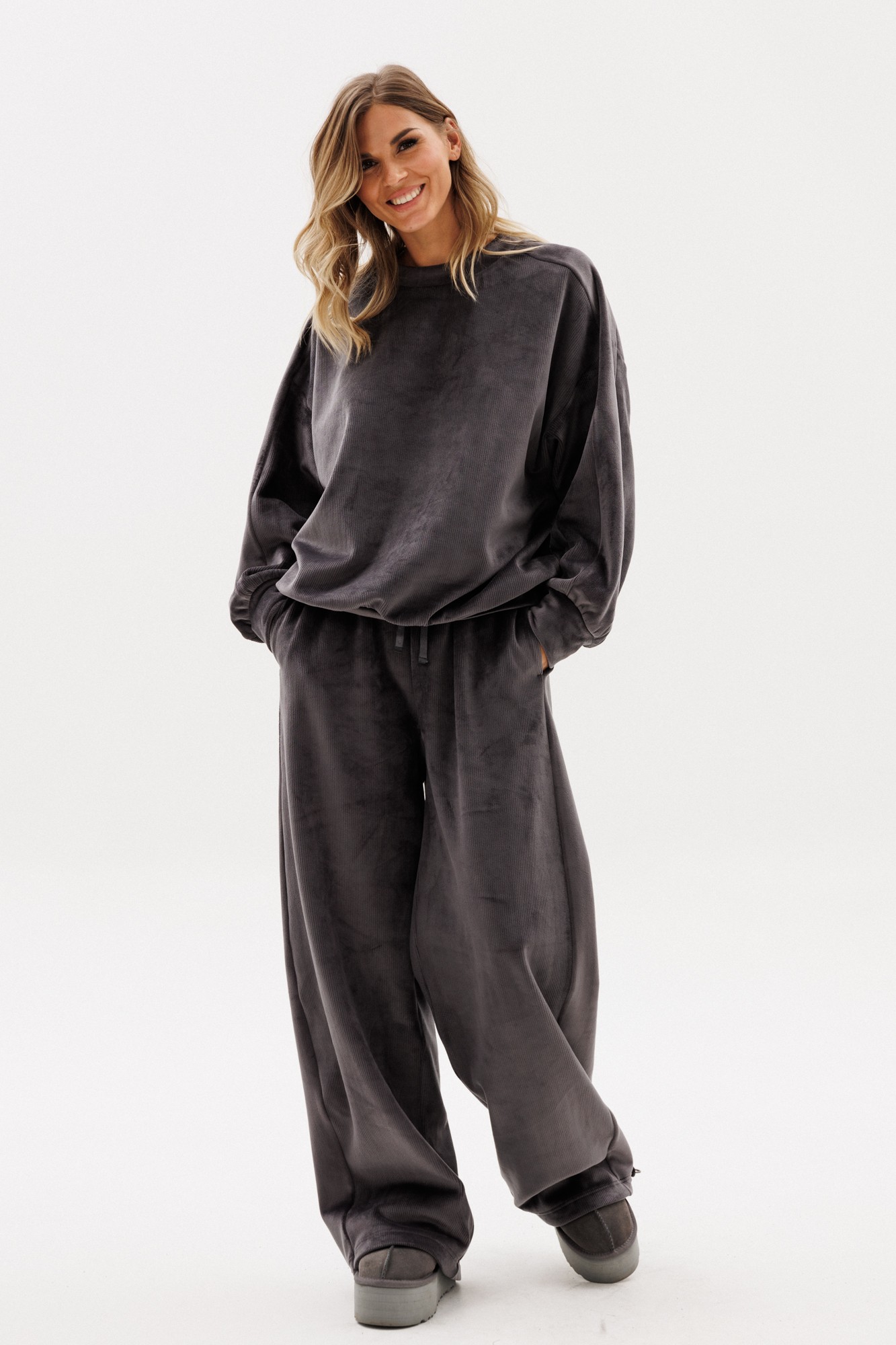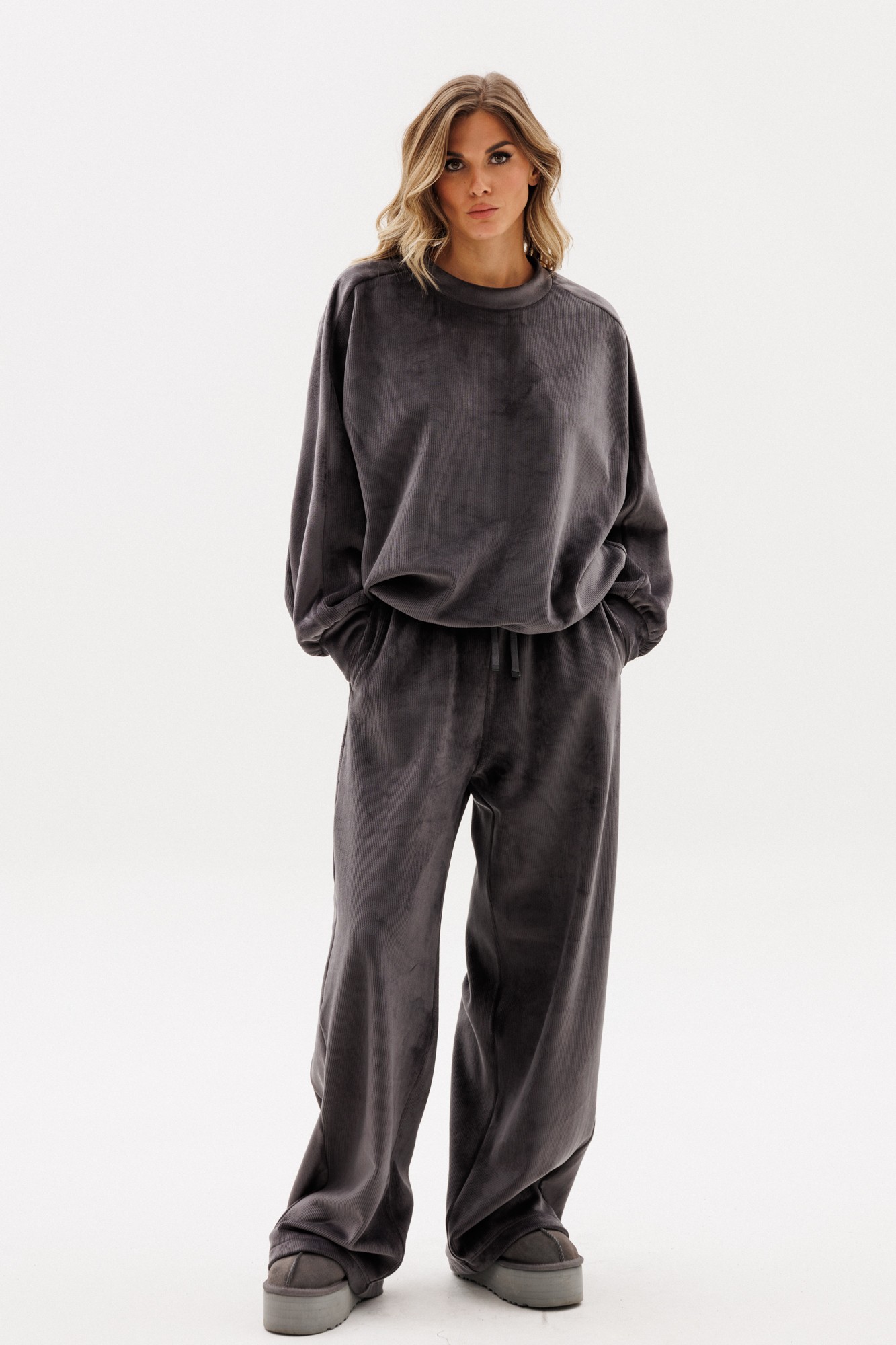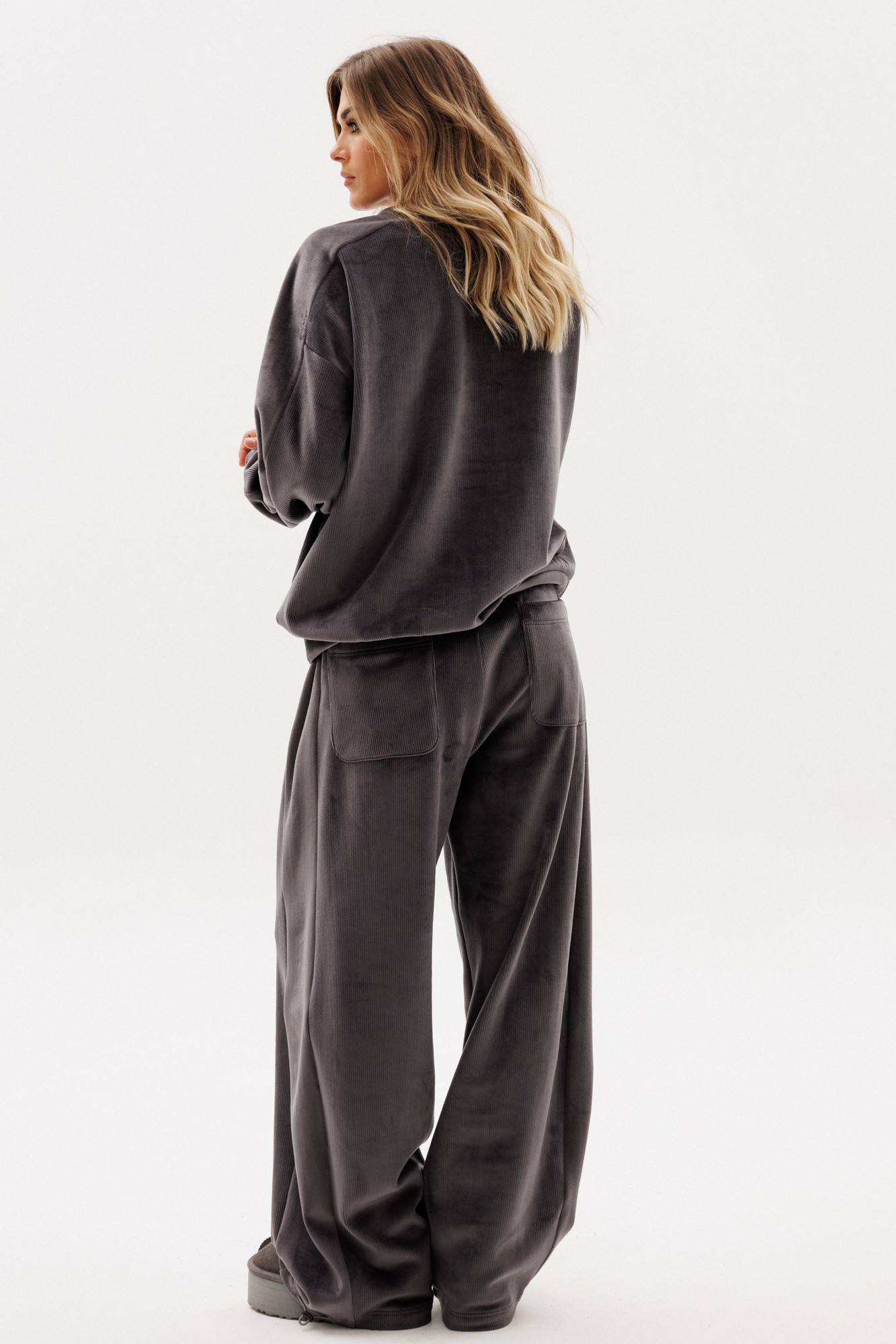 Комплект: джемпер+брюки. Комплект выполнен из двустороннего велюра в мелкий рубчик. Джемпер О-образного силуэта, покроя ""oversize"", длиной до линии бедер. Перед и спинка цельные. Горловина округлой формы, обработана бейкой. Плечевой шов удлинен. Рукав рубашечного покроя, одношовный. Низ рукава на манжете. Верхняя часть рукава переходит в кокетку переда т спинки и доходит до горловины. По низу джемпера обработан пояс. Пояс, манжеты, верхняя часть рукава и бейка горловины выполнены из основной, но без рубчика. Брюки на притачном поясе с эластичной тесьмой, прямого силуэта, длиной в пол, покроя ""oversize"". Боковой шов заменен лампасом. В швах лампаса карманы. Сзади накладные карманы. В пояс протянут шнур с наконечниками. По низу брюк втянута эластичная тесьма с фиксаторами. Лампасы и пояс выполнены из основной ткани, но без рубчика.