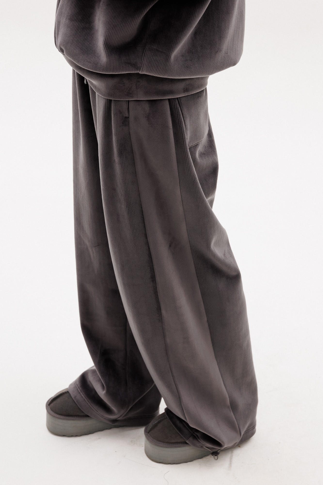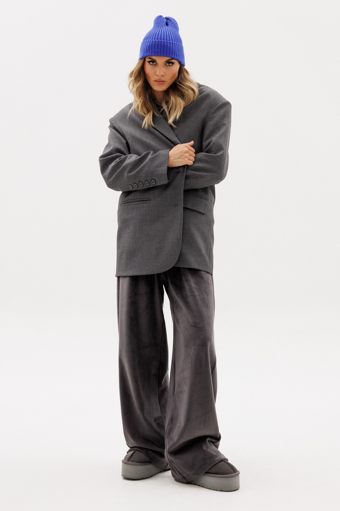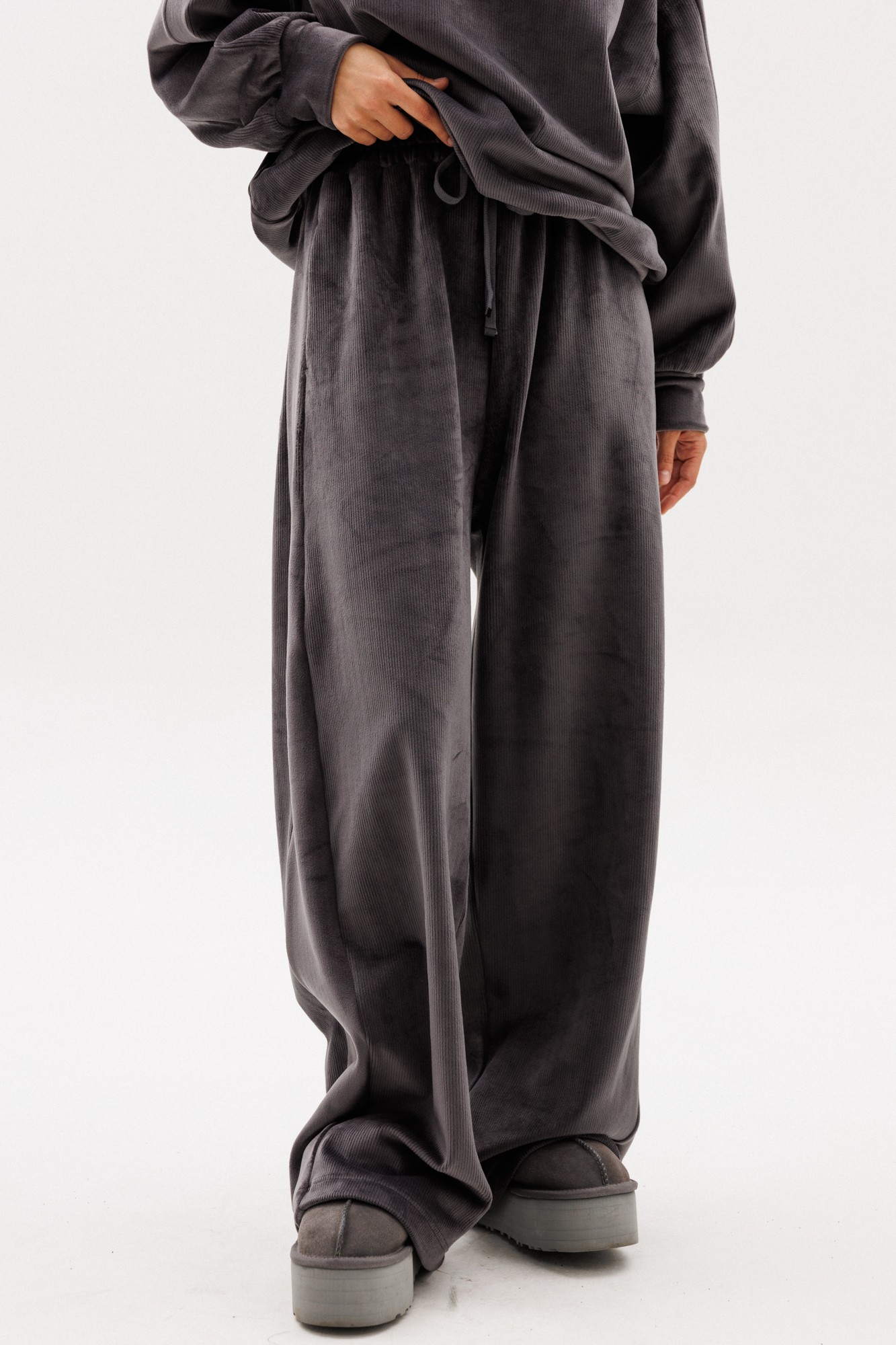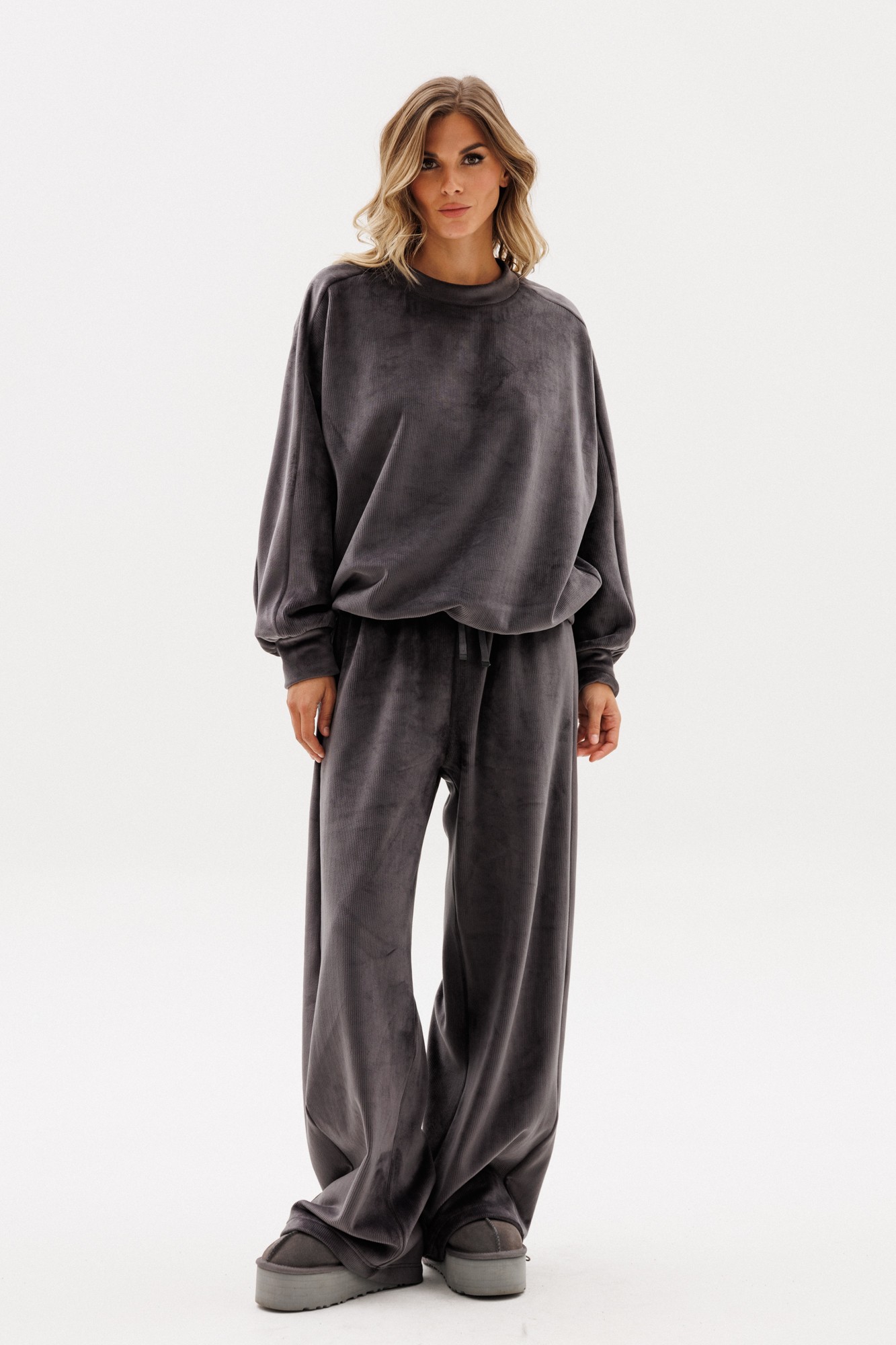 Комплект: джемпер+брюки. Комплект выполнен из двустороннего велюра в мелкий рубчик. Джемпер О-образного силуэта, покроя ""oversize"", длиной до линии бедер. Перед и спинка цельные. Горловина округлой формы, обработана бейкой. Плечевой шов удлинен. Рукав рубашечного покроя, одношовный. Низ рукава на манжете. Верхняя часть рукава переходит в кокетку переда т спинки и доходит до горловины. По низу джемпера обработан пояс. Пояс, манжеты, верхняя часть рукава и бейка горловины выполнены из основной, но без рубчика. Брюки на притачном поясе с эластичной тесьмой, прямого силуэта, длиной в пол, покроя ""oversize"". Боковой шов заменен лампасом. В швах лампаса карманы. Сзади накладные карманы. В пояс протянут шнур с наконечниками. По низу брюк втянута эластичная тесьма с фиксаторами. Лампасы и пояс выполнены из основной ткани, но без рубчика.