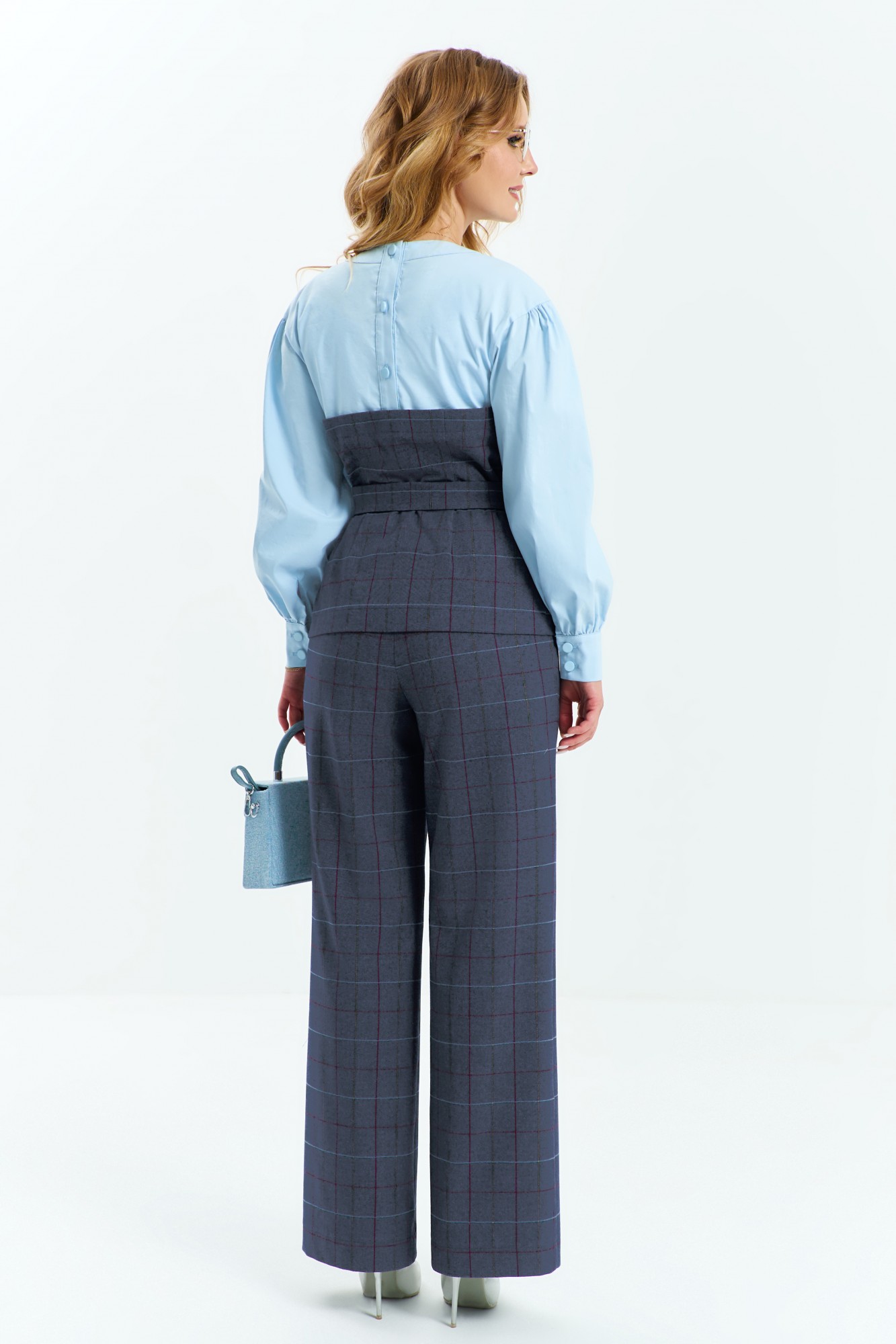 Костюм женский двухпредметный выполнен из сочетания хлопковой и костюмной ткани, состоит из блузона и брюк. Блузон с имитацией ассиметричного корсета, горловина- округлая, рукав приспущенный втачной длинный с манжетой по низу. Спинка разрезная с застежкой перли-пуговицы. Брюки с завышенной посадкой, на притачном поясе с резинкой в боковых швах расположены карманы. застежка молния на гульфике.