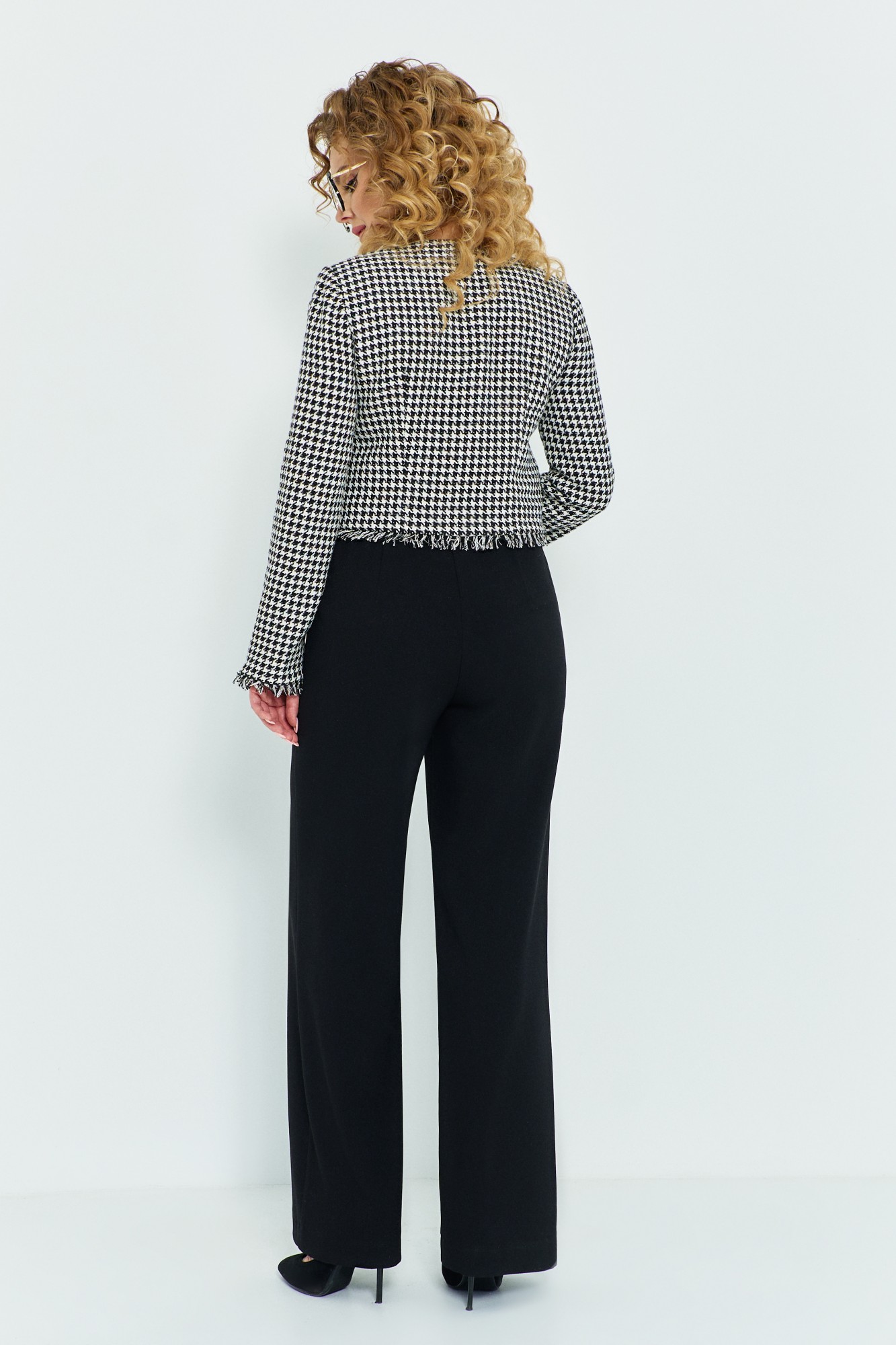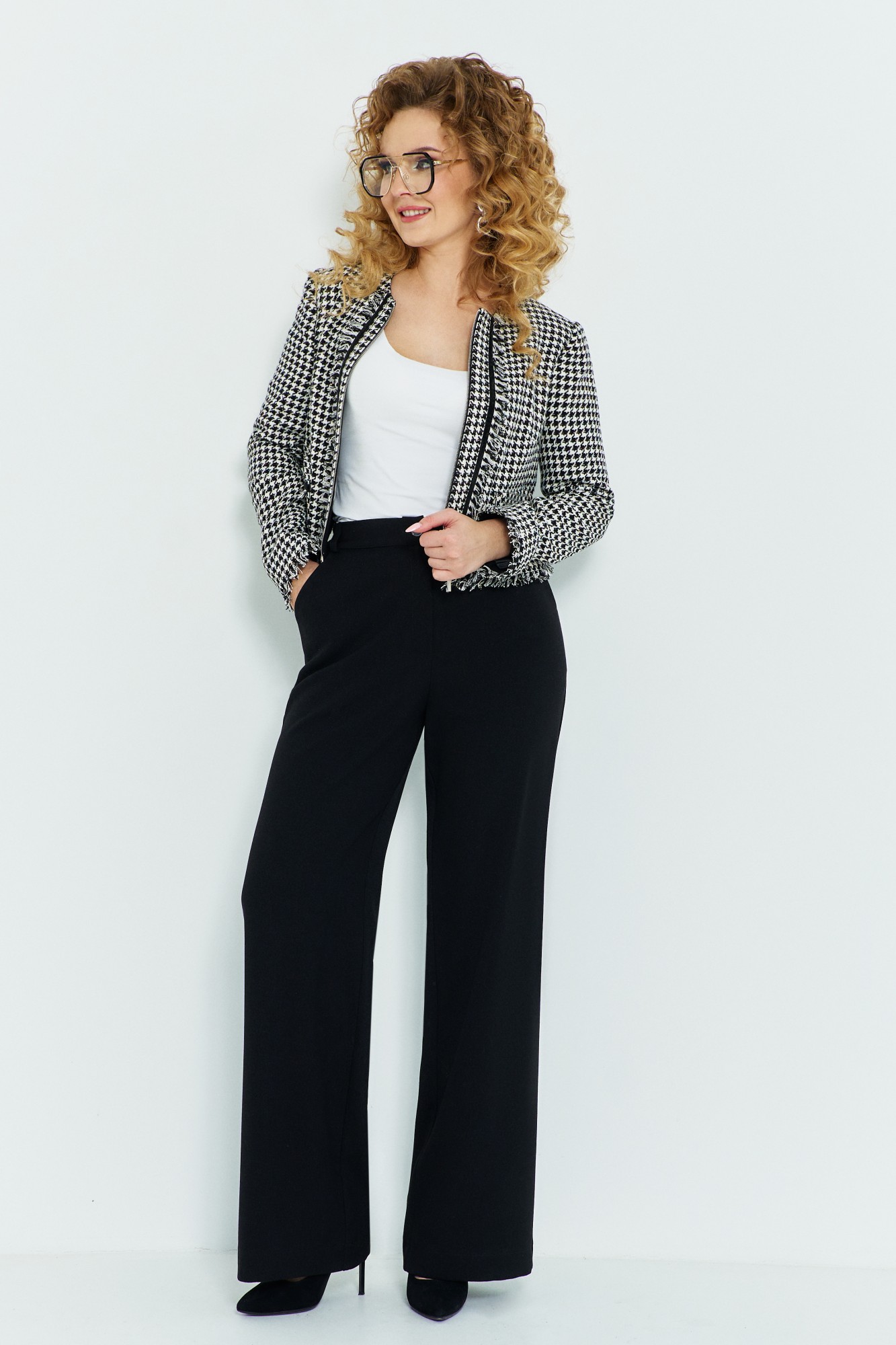 Костюм брючный женский состоит из жакета и брюк, жакет укороченный, свободного кроя, по полочке жакета расположены накладные карманы и декоративные элементы вдоль молнии. Горловина округлая, рукав втачной длинный. Застёжка - молния. Жакет на подкладке. Брюки классические с завышенной посадкой. на притачном поясе с резинкой, в боковых швах расположены функциональные карманы, застежка молния на гульфике.
