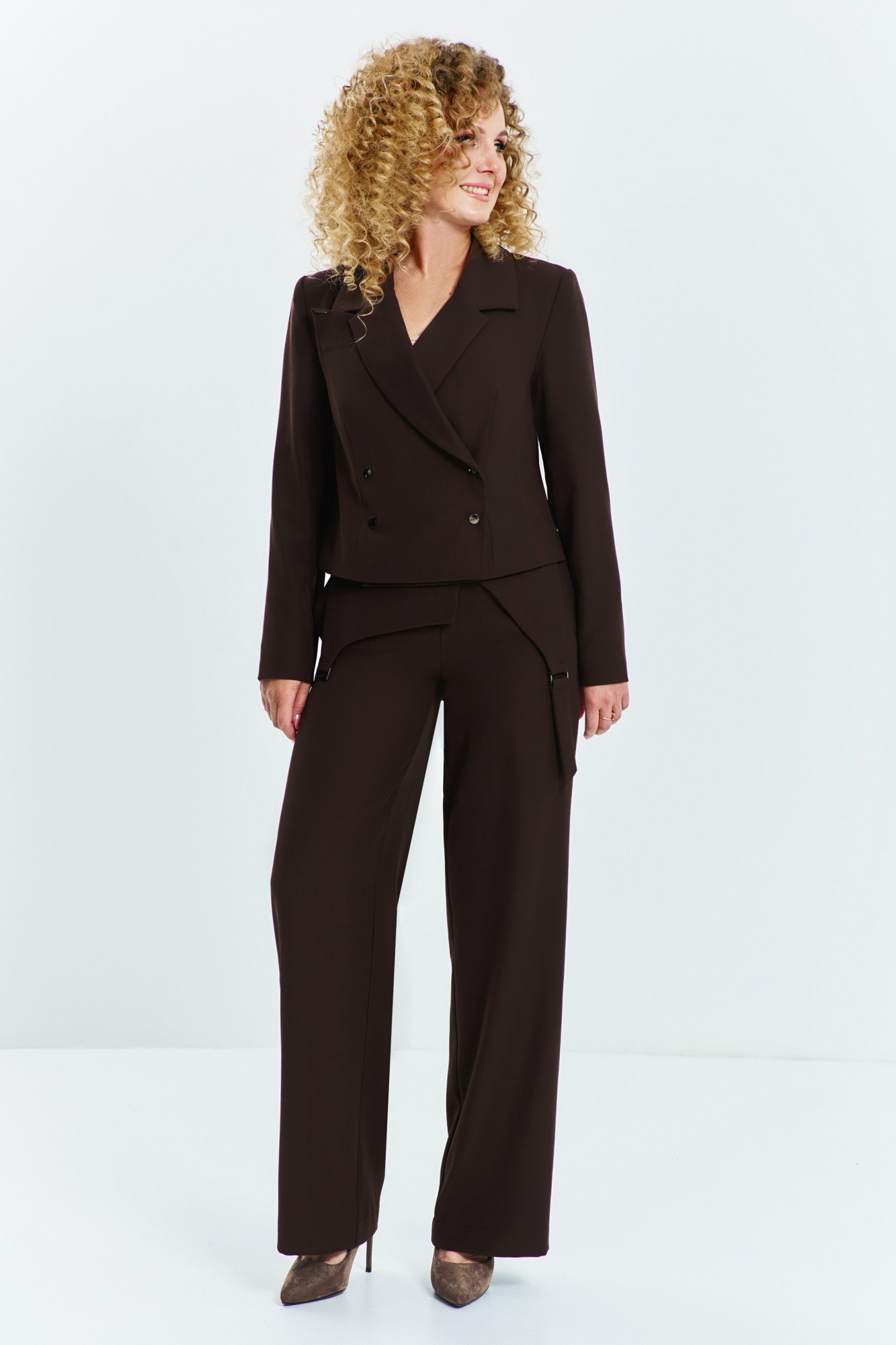 Костюм женский, состоит из жакета, брюк и баски. Жакет прямого кроя, укороченный двубортный, воротник отложной с лацканам. Спинка разрезная с декоративными элементами. Жакет на подкладке, застежка-кнопки. Брюки классические средней посадки, прямого кроя на притачном поясе с резинкой, в боковых швах имеются карманы, застежка кнопки и молния на гульфике. Баска съемная декоративная, застегивается на кнопки, регулируется пряжкой на спинке.