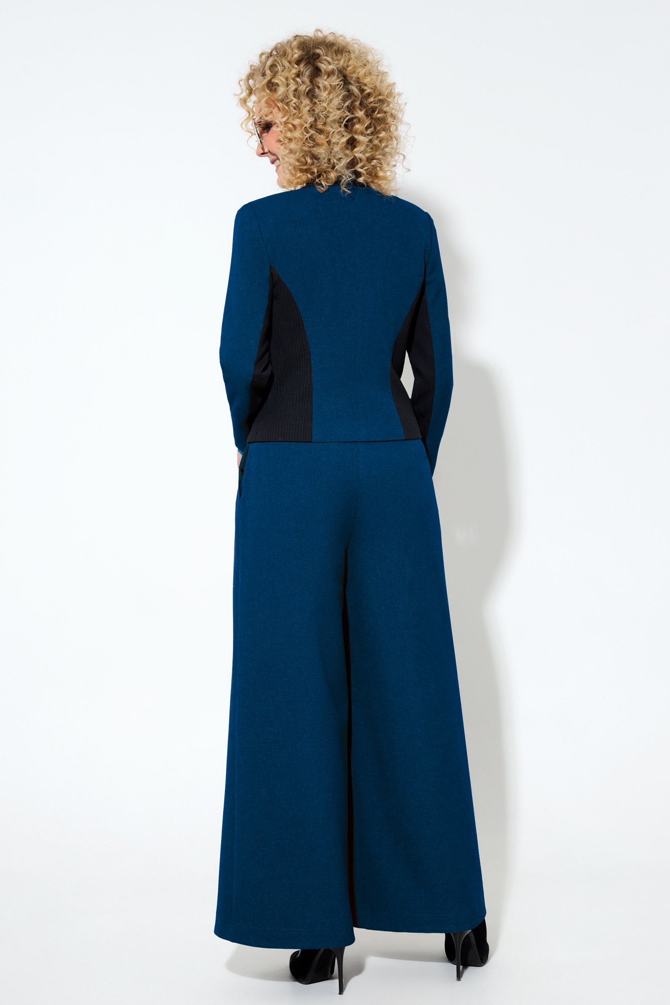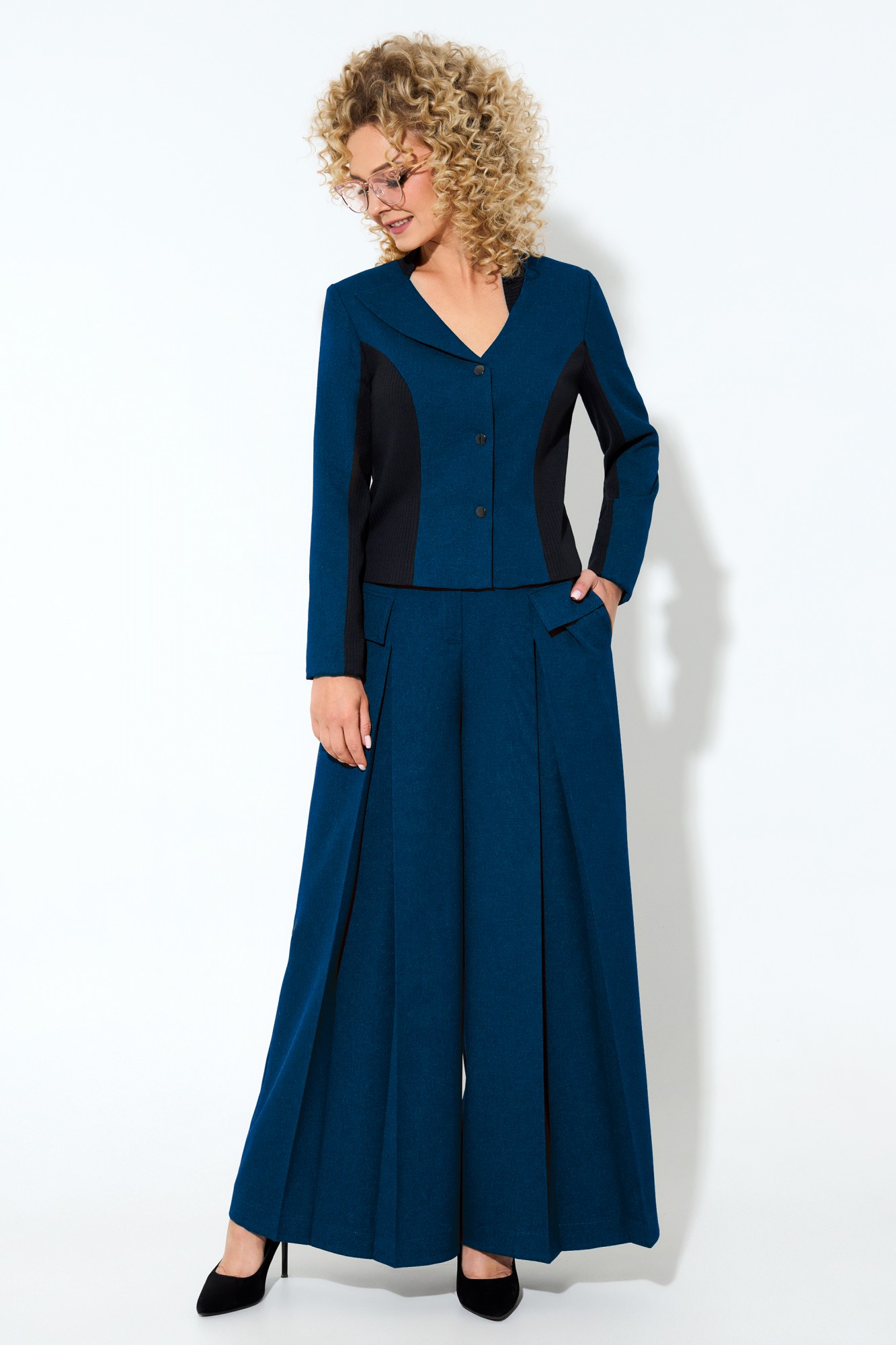 Костюм женский 2х-предметный выполнен из костюмной ткани в мелкий рубчик. В жакете отрезные бочки из трикотажного(вязаного) материала. Жакет полуприлегающего кроя , рукав-втачанный, длинный. Горловина V- образная с ассиметричной стойкой и лацканом. Застежка-кнопки. Брюки палаццо- со складками, средней посадки на притачном поясе с резинкой. застежка молния на гульфике в боковых швах брюк имеются небольшие карманы (вход в карман 11см).