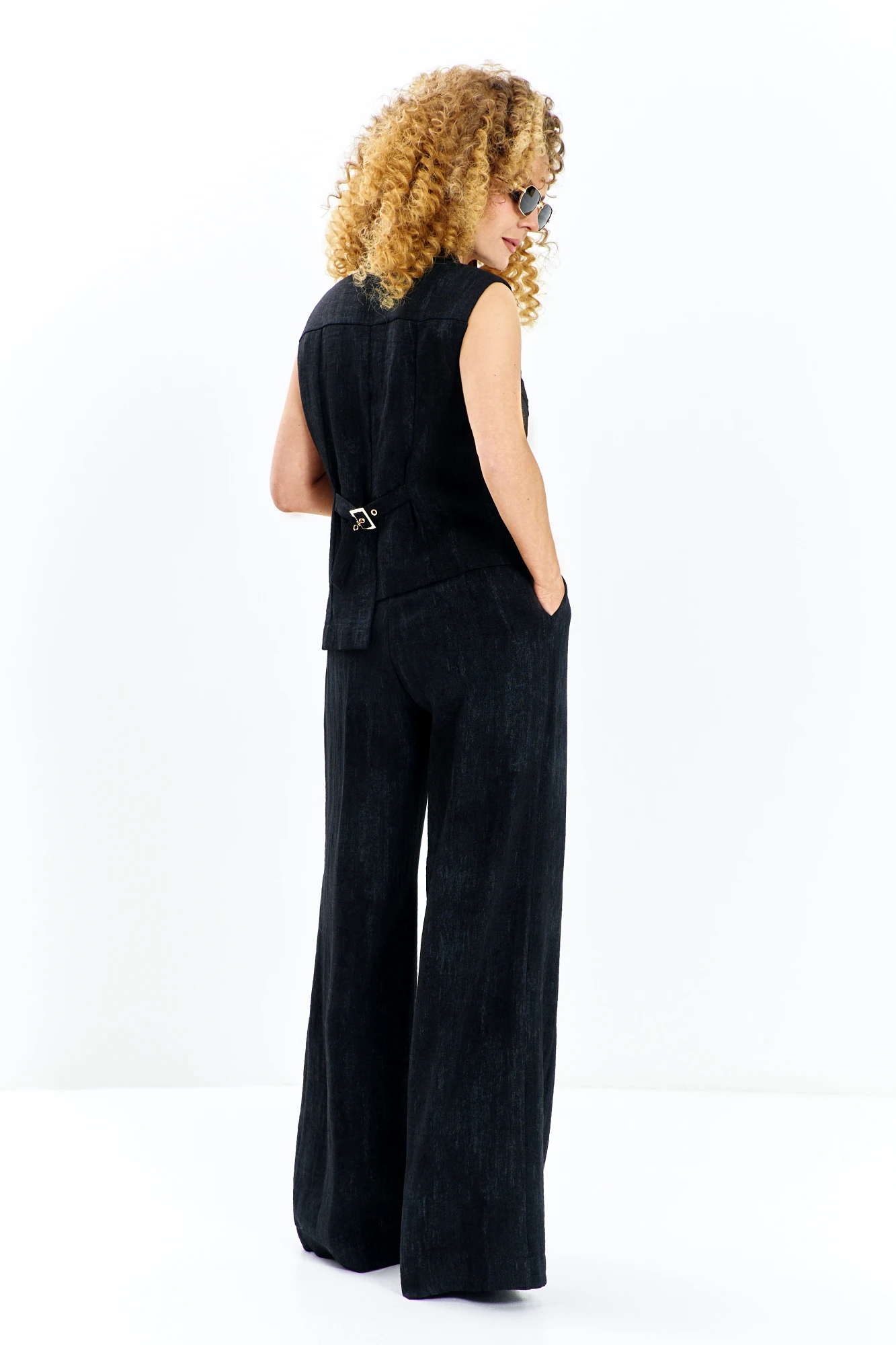 Строгий полуприталенный жилет с V-образным вырезом и небольшим отложным воротником акцентируют внимание на хрупкости плеч и линии шеи. по полчкам жилета расположена накладные декоративные элементы из основеной ткани в линии талии, усложняющий внешний вид изделия. Особый шарм модели придают акцентные золотые литеных — они служат деликатным ювелирным украшением, не перегружая образ.