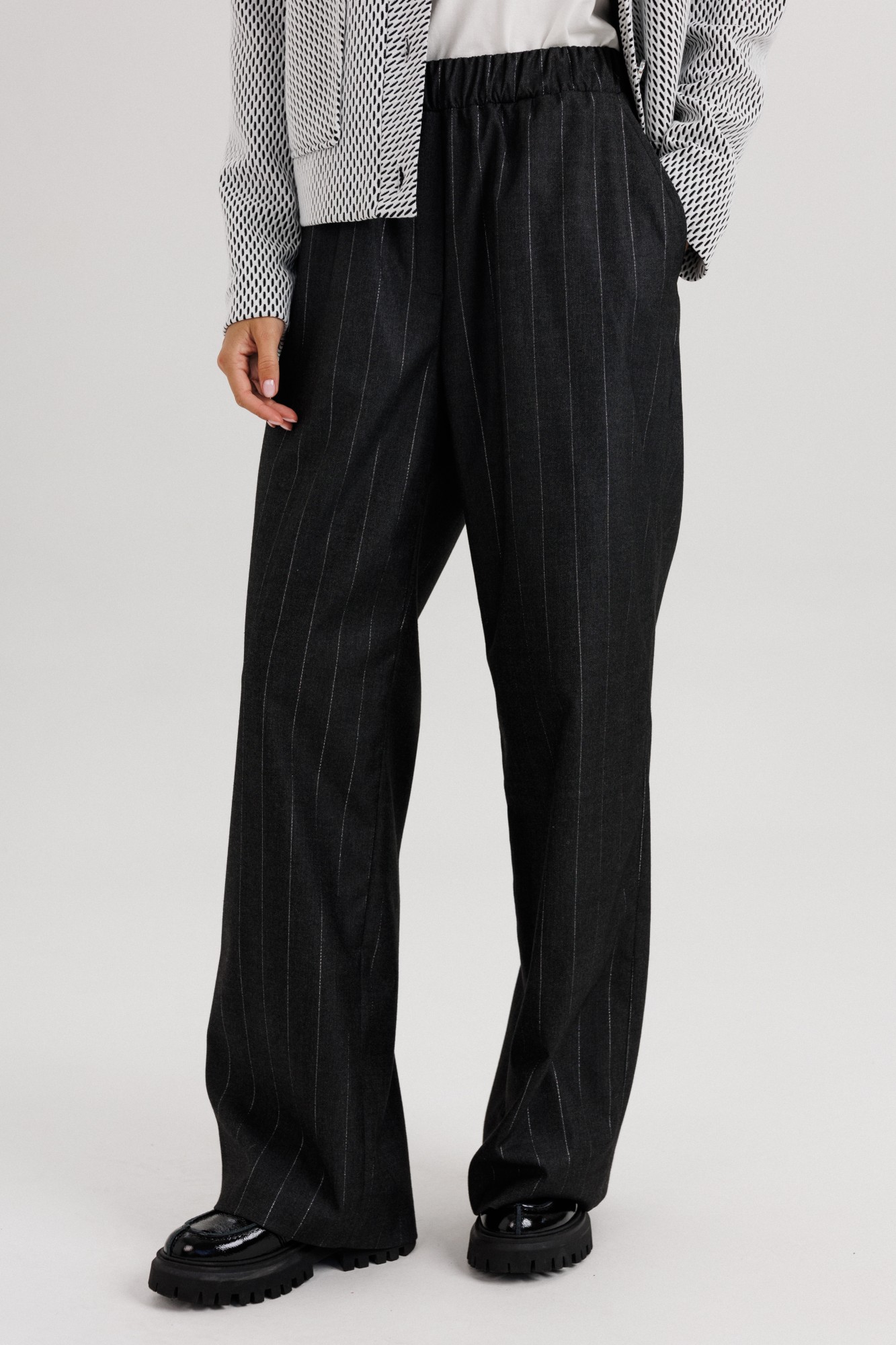 Современный женский костюм в стиле smart casual сочетает элегантность классики и комфорт повседневного образа. Комплект состоит из жакета прямого кроя с крупными пуговицами и брюк в тонкую вертикальную полоску. Контраст текстур придаёт образу динамичность и стиль. Жакет укороченной длины выполнен из лёгкой ткани с графическим узором, имеет отложной воротник и аккуратную застёжку на пуговицы. Брюки прямого силуэта со стрелками и комфортной посадкой по талии визуально вытягивают силуэт и добавляют стройности. Костюм универсален — идеально подходит для офиса, деловых встреч и городских выходов. Его можно сочетать с лофферами, туфлями на каблуке или кроссовками для более расслабленного стиля. Особенности модели: Комплект: жакет + брюки. Стильный контрастный дизайн. Прямой силуэт и длина брюк миди. Классическая полоска — тренд сезона 2025. Удобная посадка и лаконичный крой.