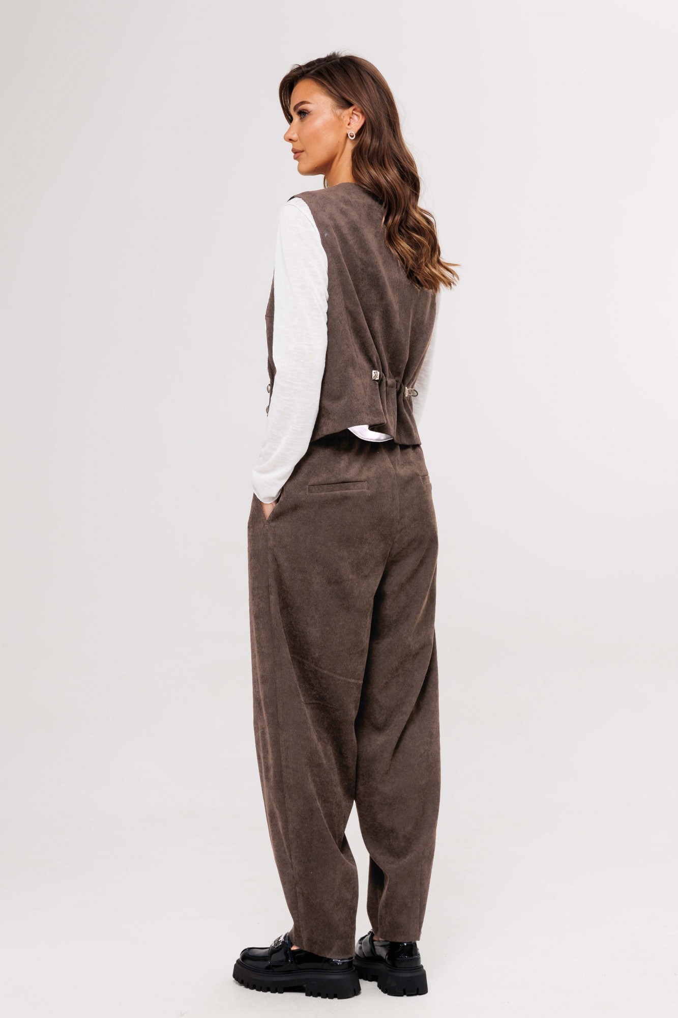 Костюм с жилетом - прекрасное решение для смелых экспериментов. Жилет полуприлегающего силуэта с асимметричной застёжкой, фигурной линией низа и регулирующийся кулисе по спинке. Полочки с отрезным бочком и нагрудными вытачками, спинки - с центральным швом, отрезным бочком и регулирующийся кулисой с фиксаторами. Брюки "баррел" на притачном поясе со шлёвками (эластичном в области спинки), с наклонными карманами , мягкими складками защипами по верху брюк и вытачками по низу. Джемпер трикотажный, с длинным рукавом, полуприлегающего силуэта.