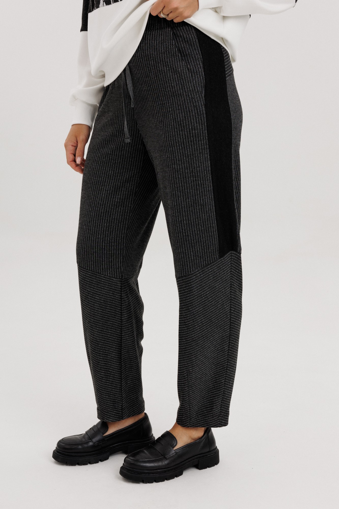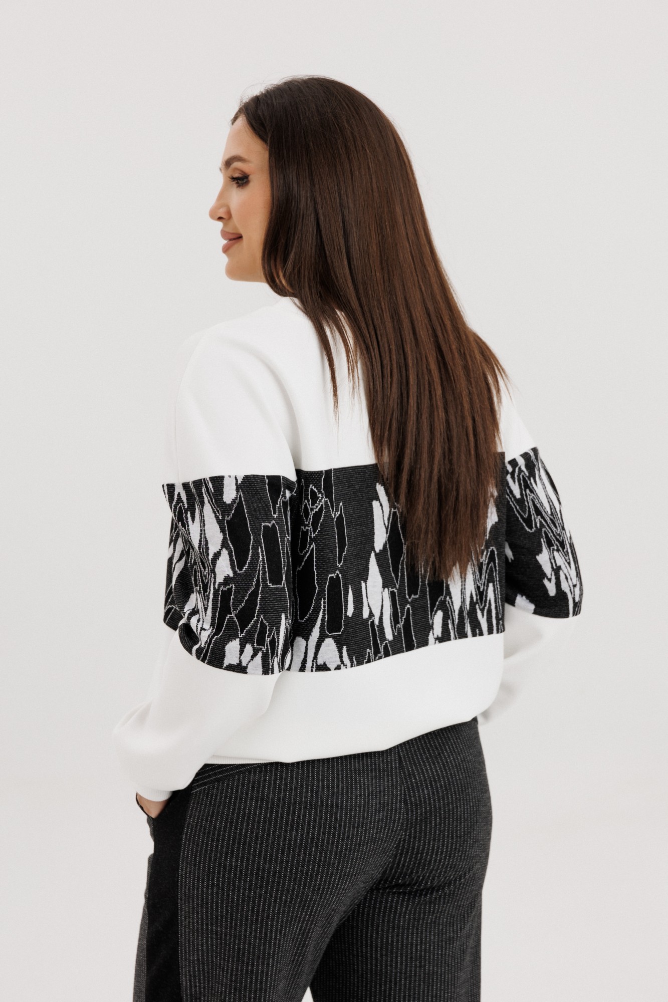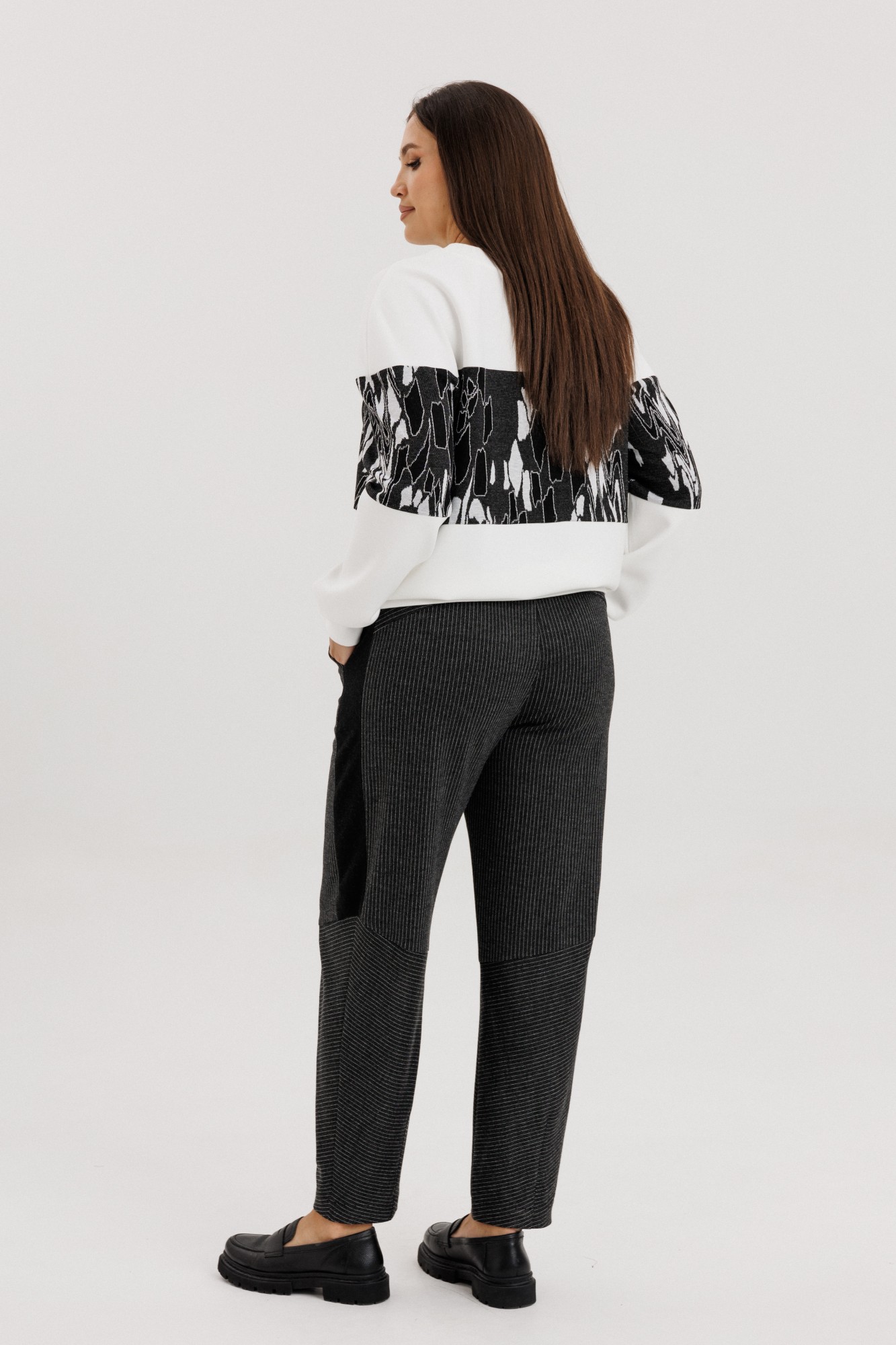 Стильный и удобный трикотажный комплект создан для современных женщин, которые ценят комфорт без потери стиля. Модель состоит из свитшота прямого кроя и брюк со вставками по бокам, выполненных из мягкого эластичного трикотажа. Свитшот украшен эффектным контрастным принтом в чёрно-белой гамме, придающим образу динамику и современное звучание. Брюки со средней посадкой и лёгким заужением к низу обеспечивают свободу движений и идеально сидят по фигуре. Комплект отлично подойдёт для повседневного гардероба, прогулок, путешествий и неформальных встреч. Легко комбинируется с кроссовками, лофферами или ботинками. Особенности модели: Комплект: свитшот + брюки. Эластичное трикотажное полотно высокого качества. Контрастный принт в актуальной графике. Комфортная посадка и мягкий крой. Универсальный стиль: casual, street, sport-chic.