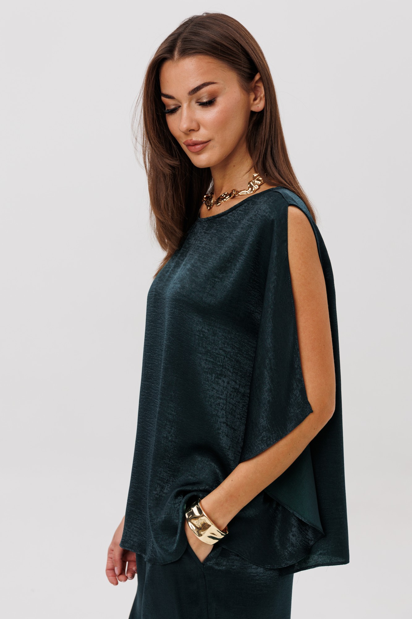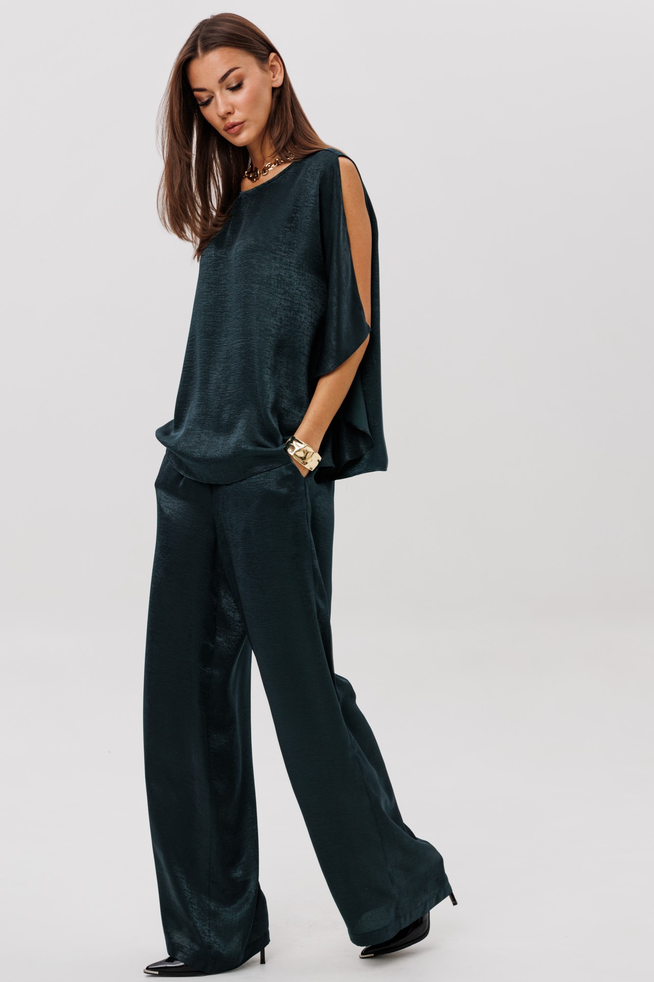 Роскошный брючный комплект из высококачественного атласа — это готовый образ для особых случаев и стильных выходов. Свободная блуза beautifully драпируется, мягко играет на свету и позволяет носить её как в расслабленном варианте, так и подчёркивая талию поясом. Широкие брюки на комфортной резинке создают эффект удлинённых ног и дарят полную свободу движений. Современная элегантность, которая всегда смотрится дорого и effortlessly chic.