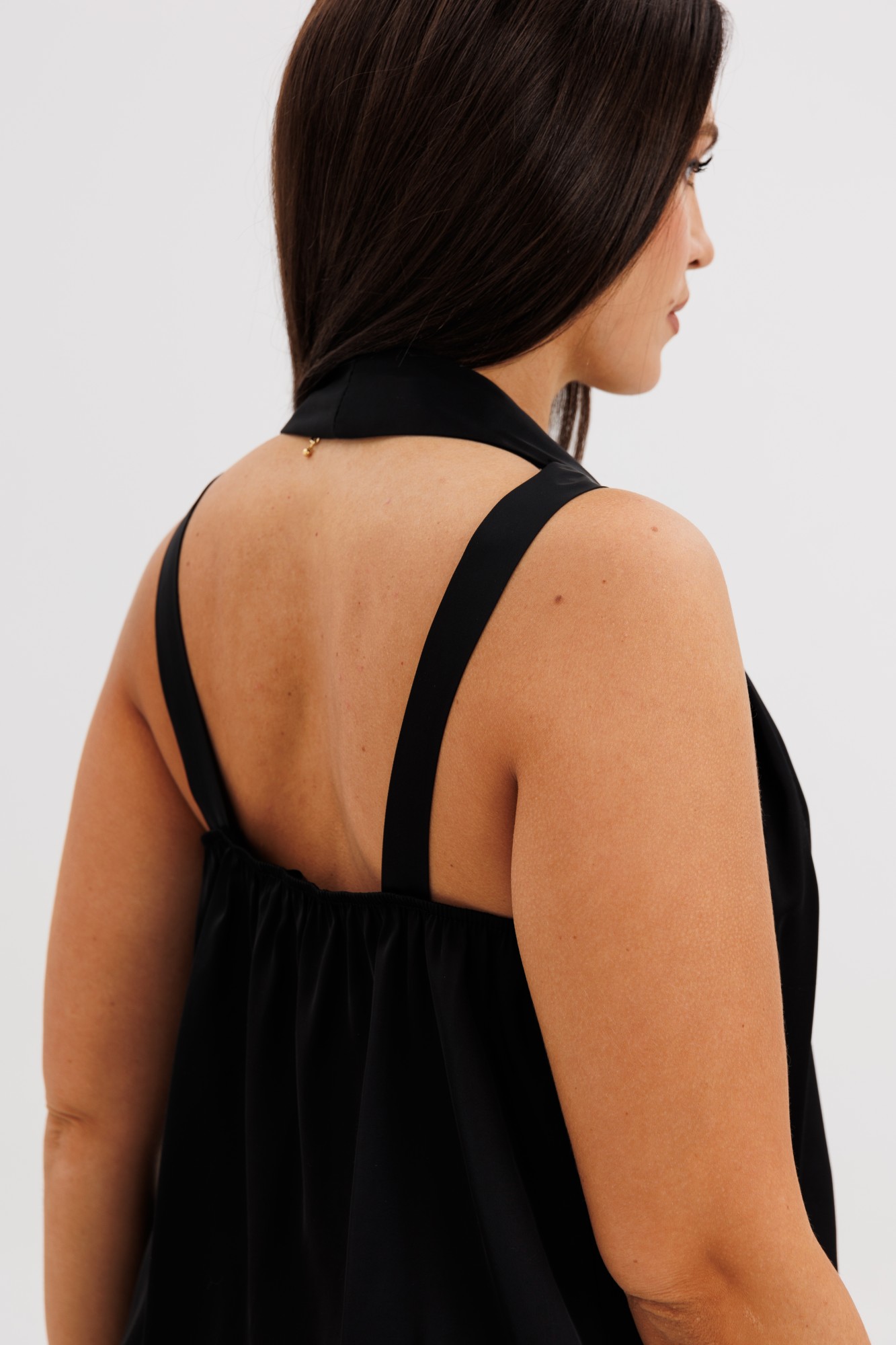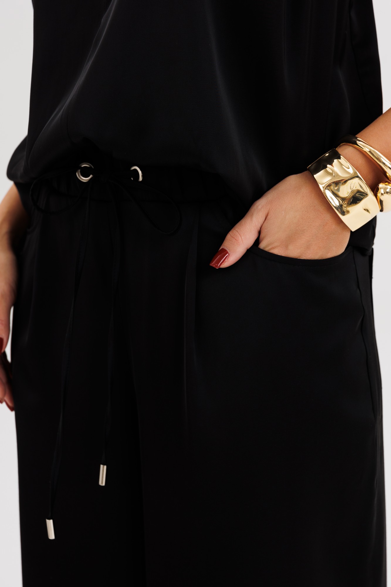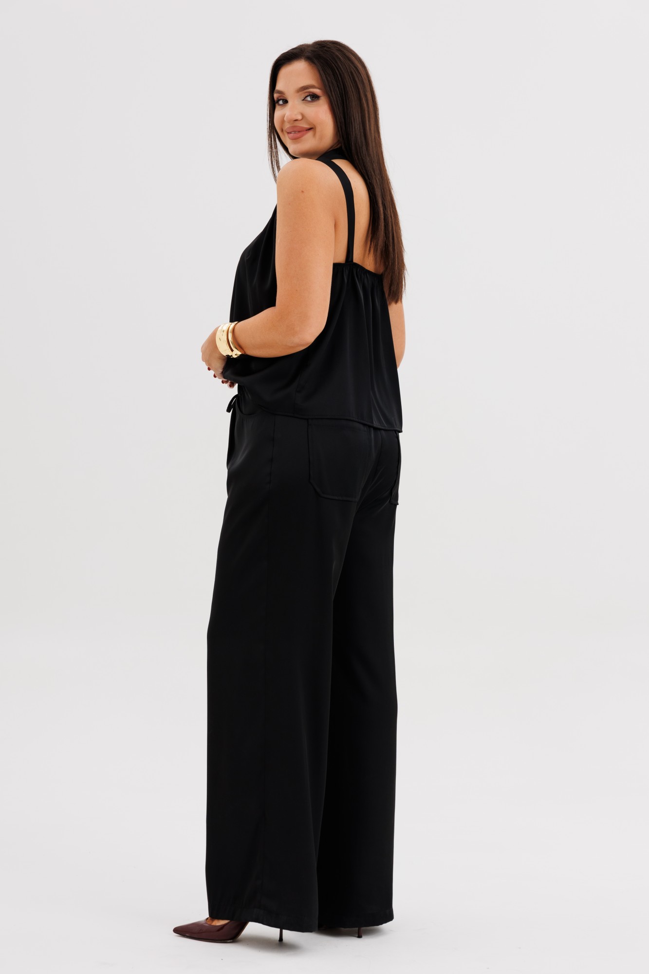 Элегантная брючная двойка, в которой комфорт гармонично сочетается с чувством стиля. Эффектный топ с V-образным вырезом и воротником-холтер мягко драпируется от линии плеч, создавая женственный силуэт и лёгкий акцент на зону декольте. Брюки свободного покроя на эластичном поясе со шнуром-завязкой и металлическими люверсами придают образу расслабленную изысканность и ощущение непринуждённого шика. Такой комплект — универсальное решение для современных женщин, которые ценят стиль, удобство и элегантность в каждом движении. Он будет уместен и в офисе с жакетом, и на вечернем выходе с яркими аксессуарами.