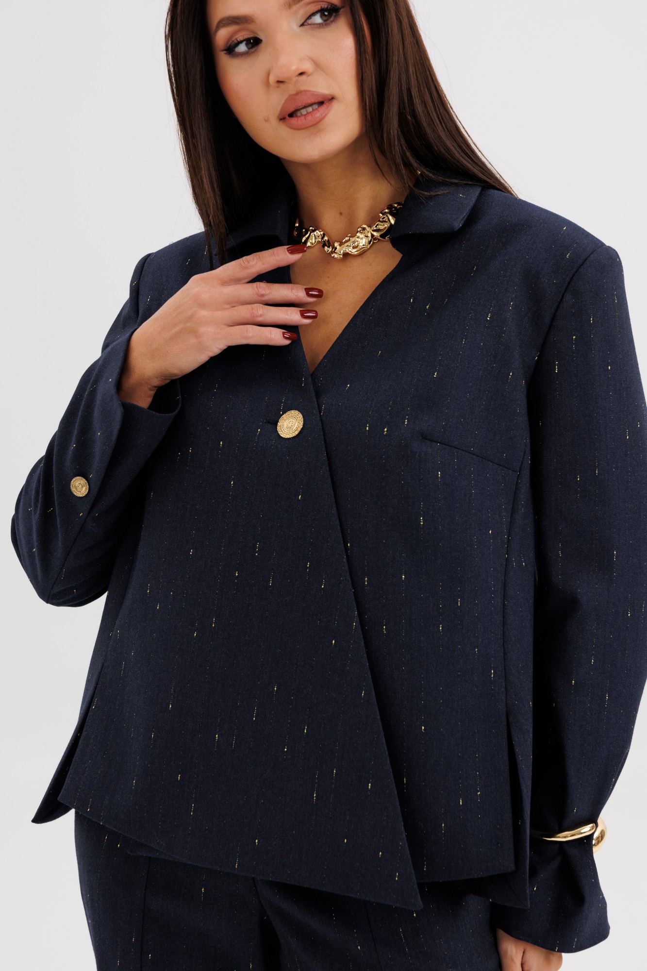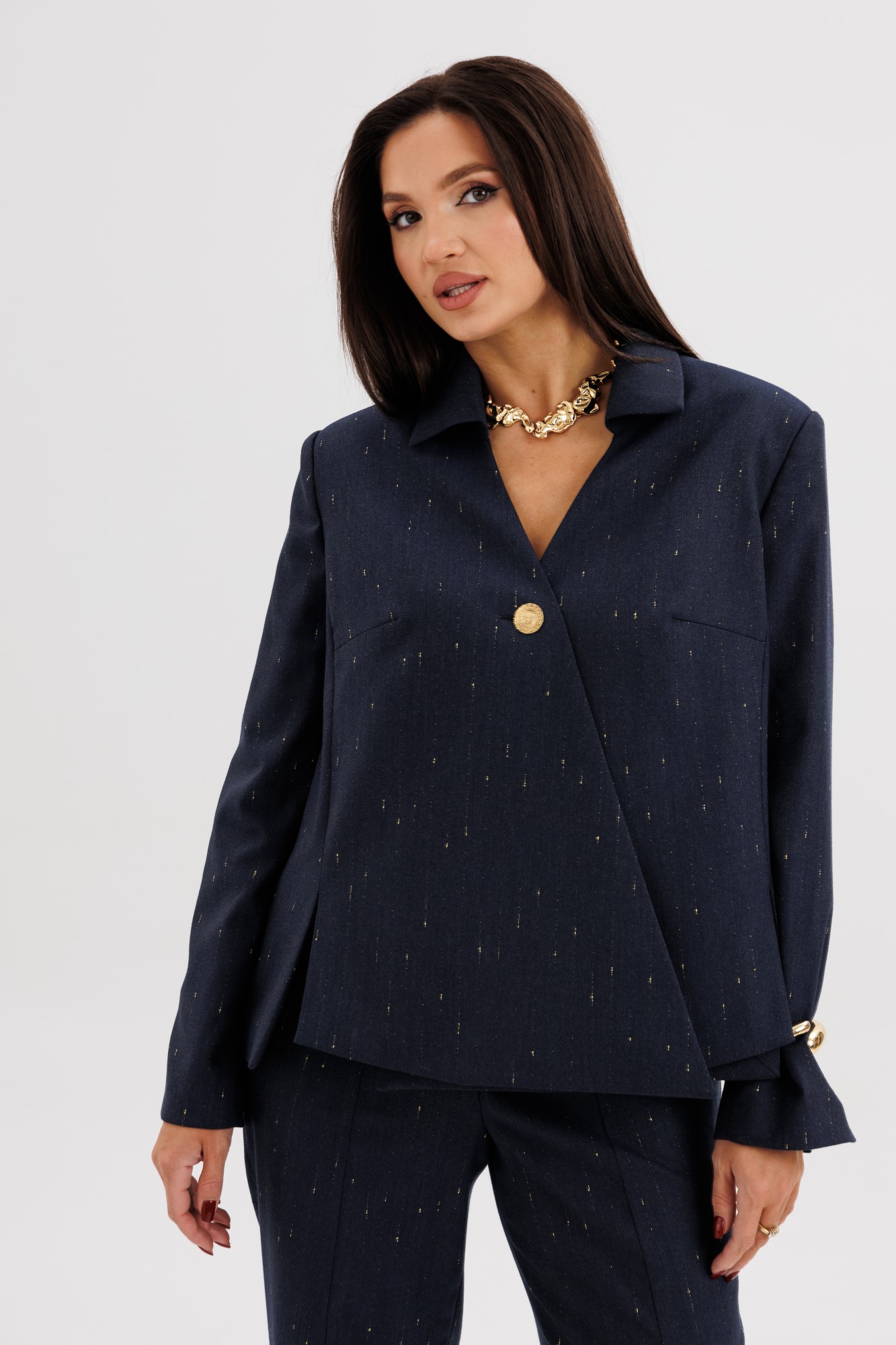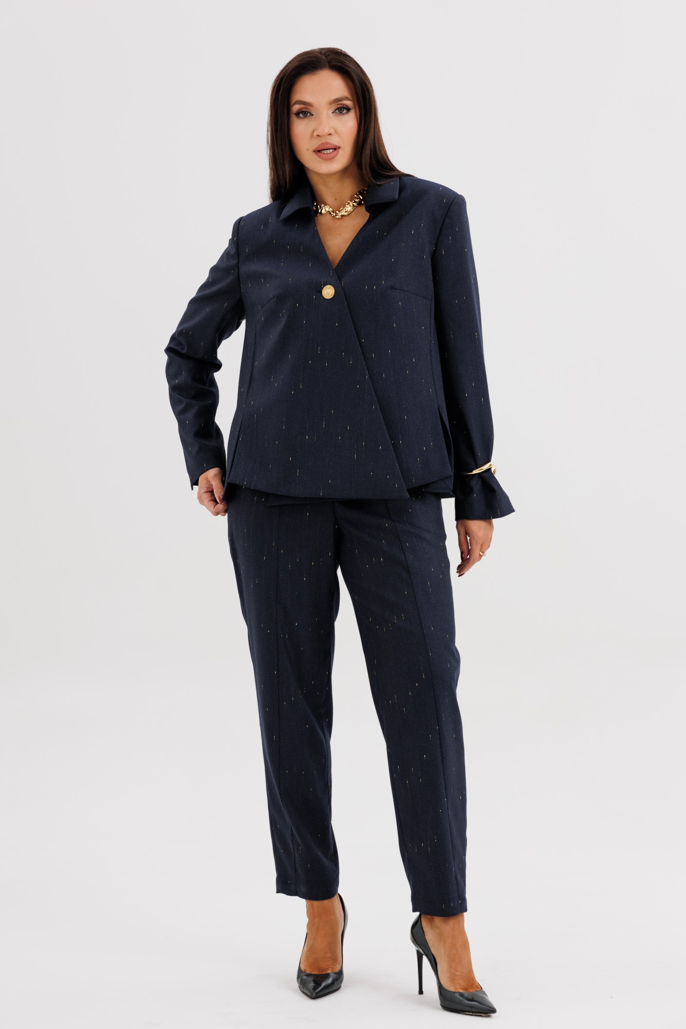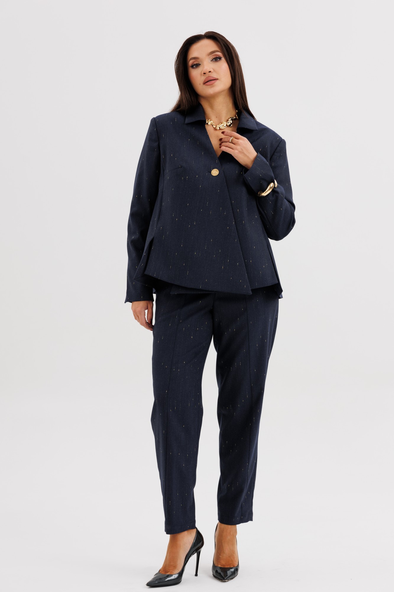 Элегантный брючный костюм из поливискозной ткани с лёгким вкраплением люрекса — выбор современных женщин, ценящих утончённый стиль и комфорт. Жакет прямого силуэта выполнен с необычной асимметричной линией борта, которая добавляет образу индивидуальности и лёгкий дизайнерский акцент. Застёжка на крупные декоративные пуговицы придаёт образу выразительность. Брюки со стрелками и аккуратной посадкой по фигуре визуально вытягивают силуэт, создавая гармоничные пропорции. Костюм идеально подойдёт для офисных будней, деловых встреч и стильных повседневных выходов. В нём каждая деталь работает на образ — от благородного оттенка ткани до мягкого блеска люрекса. Стиль, подчеркивающий характер и уверенность в себе.