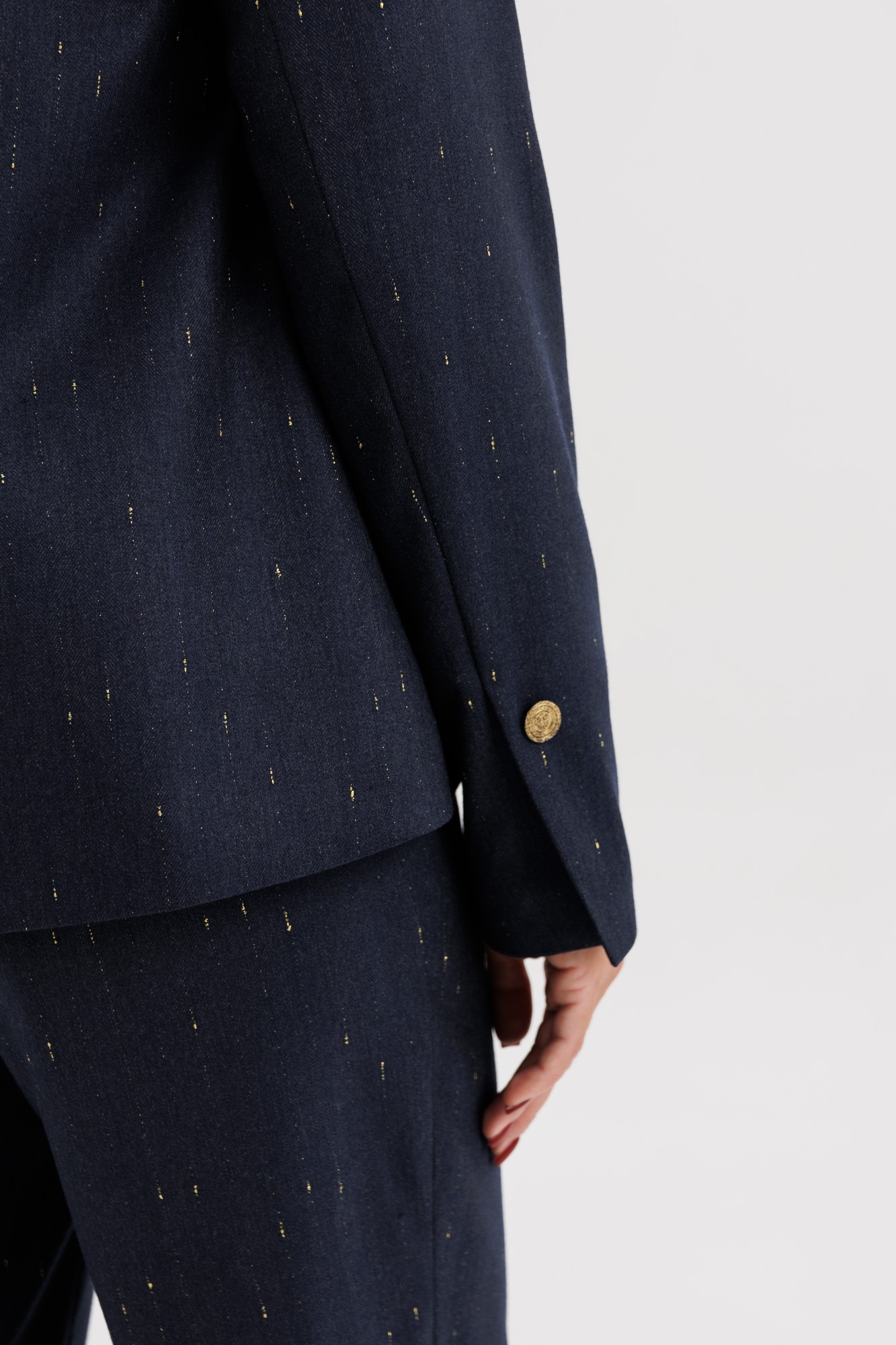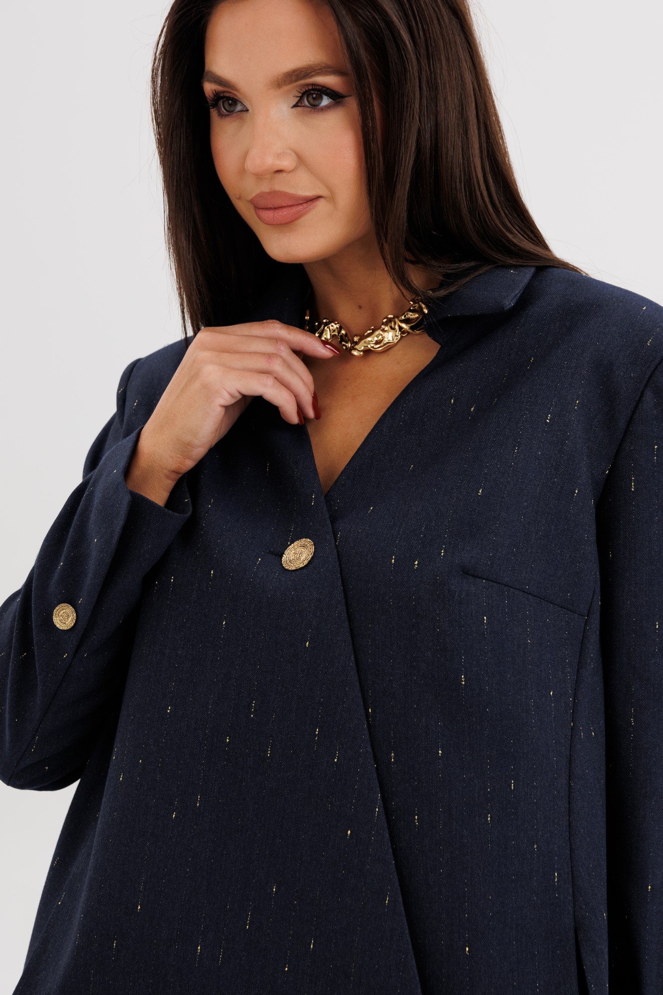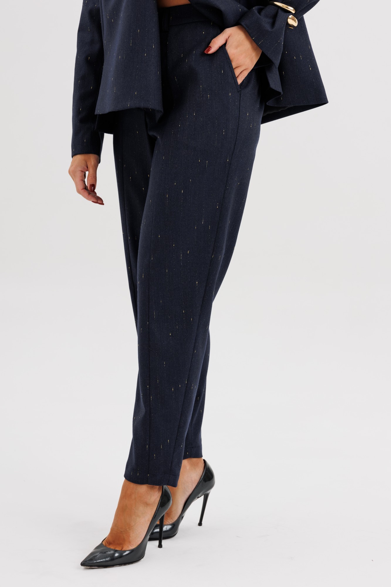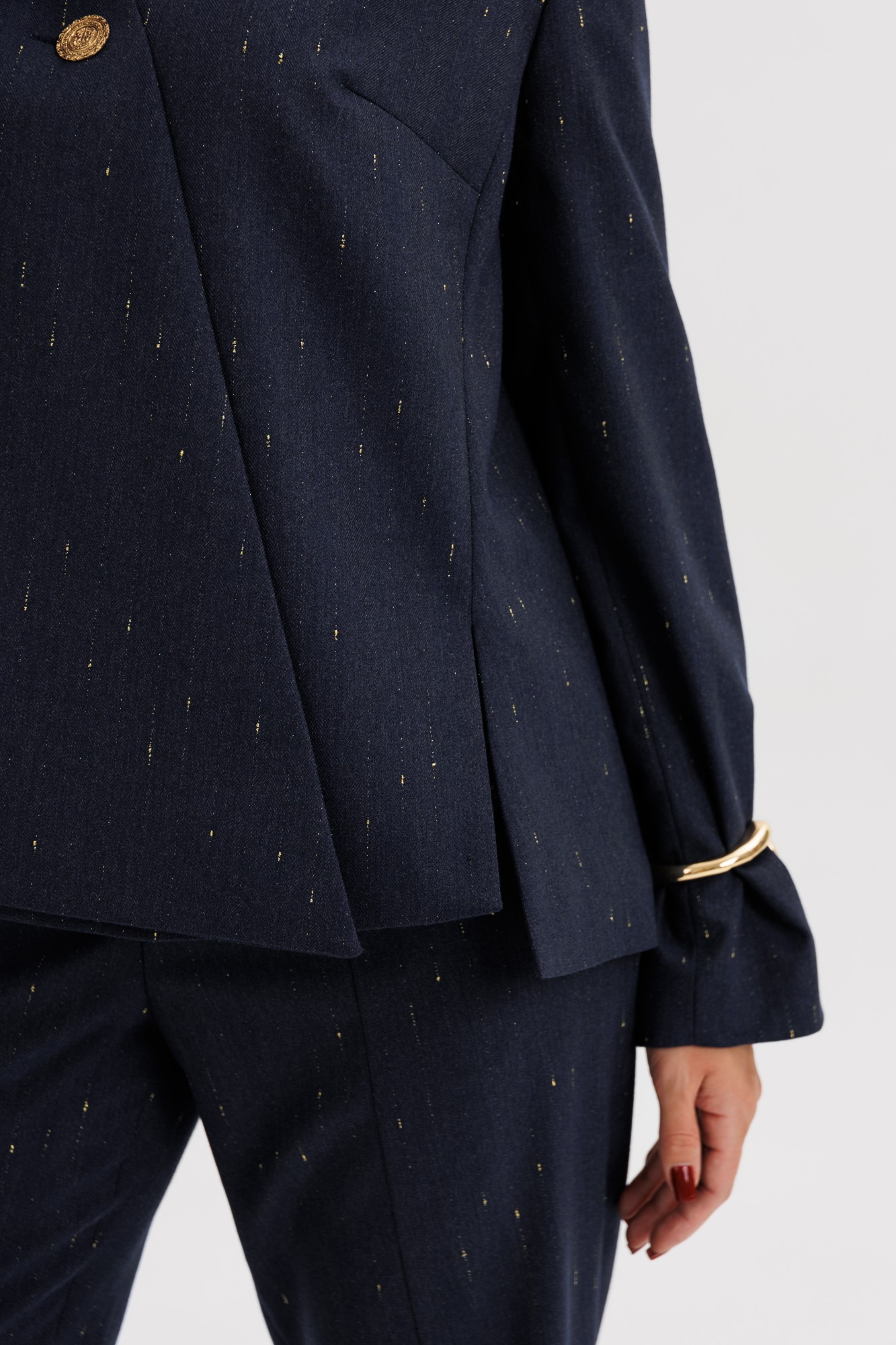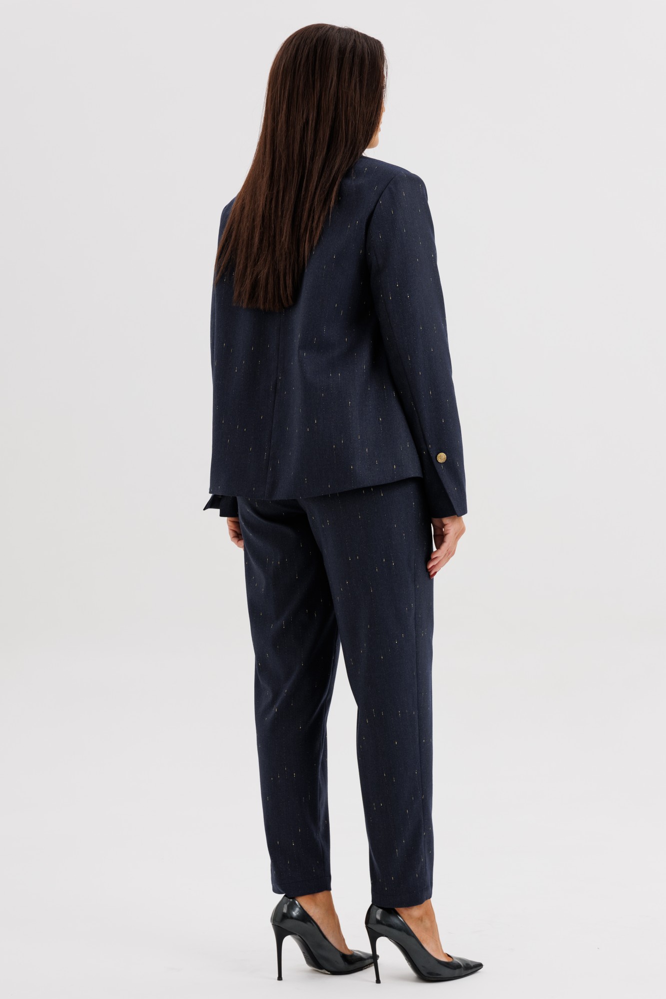 Элегантный брючный костюм из поливискозной ткани с лёгким вкраплением люрекса — выбор современных женщин, ценящих утончённый стиль и комфорт. Жакет прямого силуэта выполнен с необычной асимметричной линией борта, которая добавляет образу индивидуальности и лёгкий дизайнерский акцент. Застёжка на крупные декоративные пуговицы придаёт образу выразительность. Брюки со стрелками и аккуратной посадкой по фигуре визуально вытягивают силуэт, создавая гармоничные пропорции. Костюм идеально подойдёт для офисных будней, деловых встреч и стильных повседневных выходов. В нём каждая деталь работает на образ — от благородного оттенка ткани до мягкого блеска люрекса. Стиль, подчеркивающий характер и уверенность в себе.