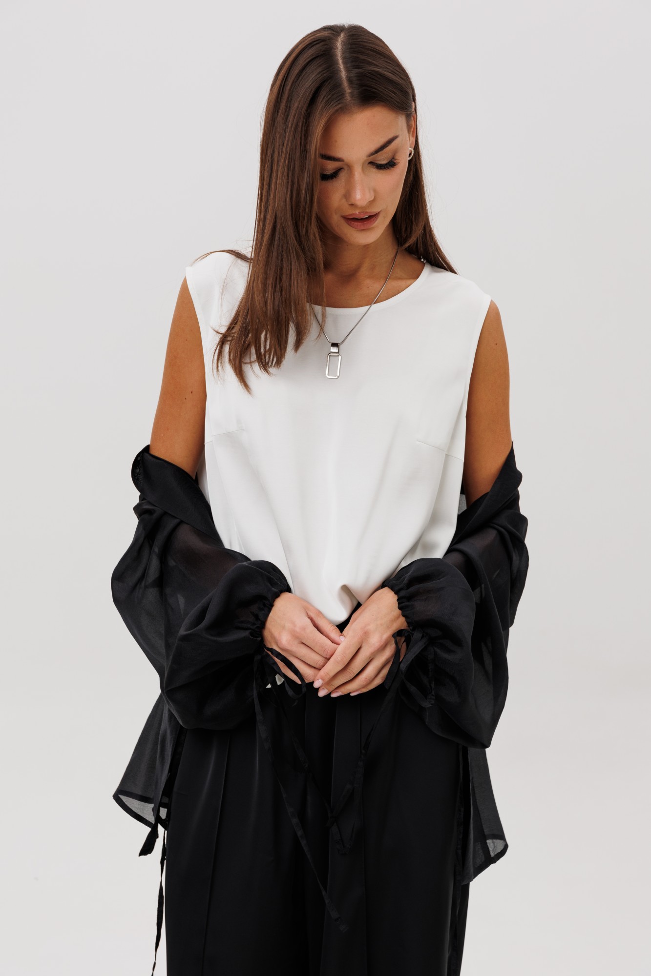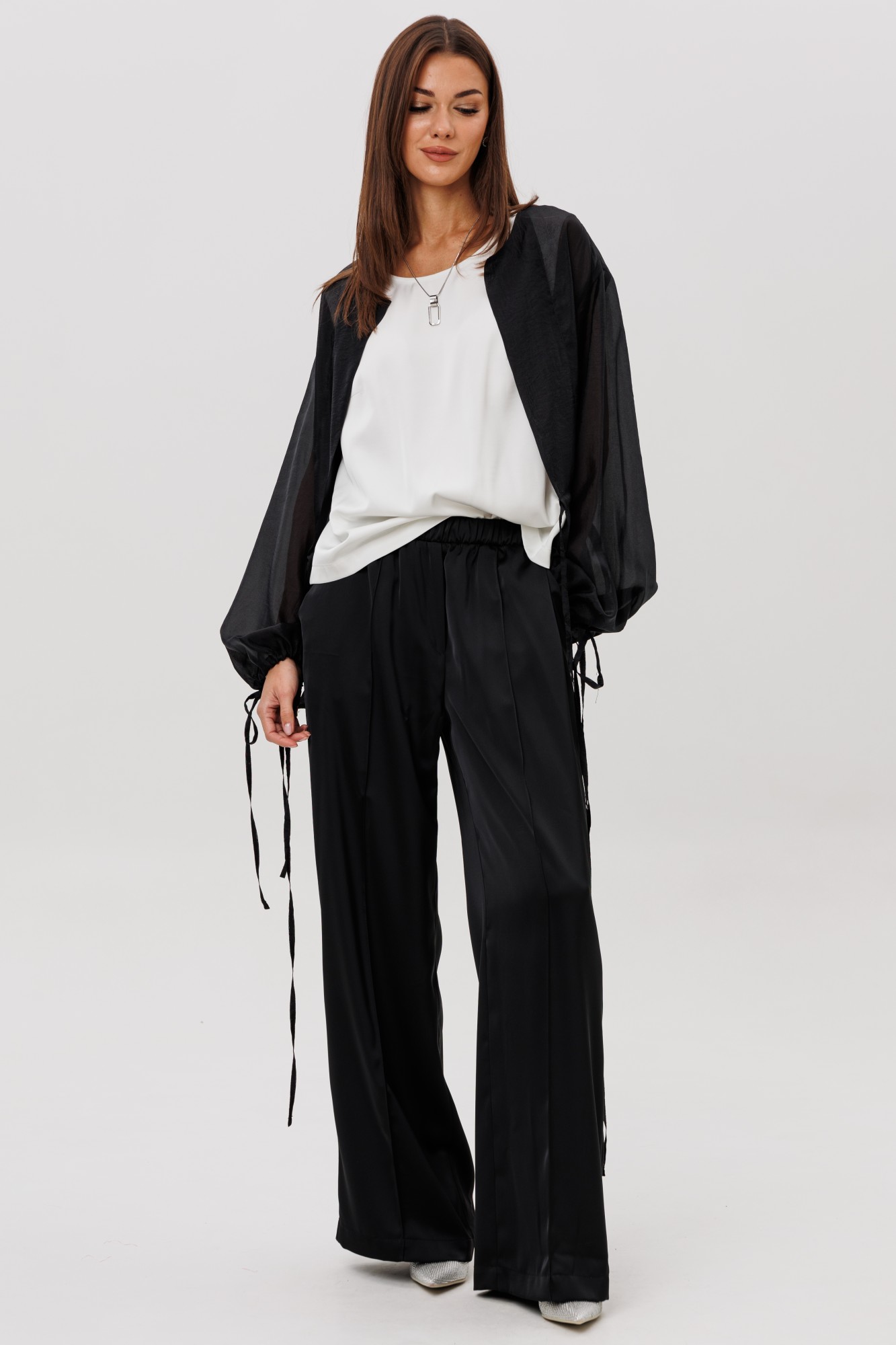 Эффектный ансамбль-тройка, в котором каждая деталь работает на утончённый и современный образ. Полупрозрачный блузон из воздушной вискозной органзы создаёт легкую дымку и добавляет образу благородной загадочности, а акцентные завязки подчёркивают талию и делают силуэт более выразительным. Контрастный атласный топ вносит нотку сияния и гармонично освежает тёмную гамму комплекта. Широкие атласные брюки со стрелкой и комфортным эластичным поясом добавляют образу сдержанной элегантности и подчёркивают его продуманную роскошность. Такой комплект смотрится нарядно, современно и effortlessly chic — идеальный выбор для тех, кто любит сочетание лёгкости, динамики и безупречного стиля.
