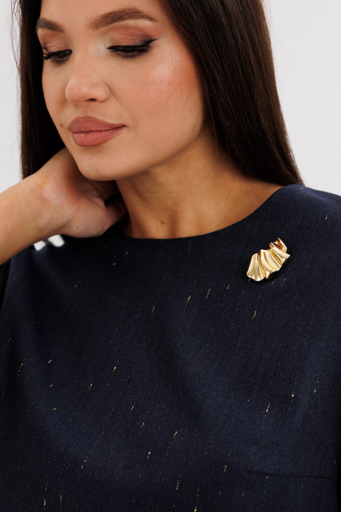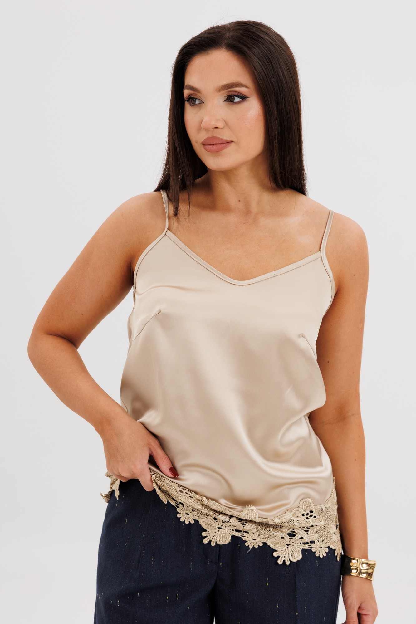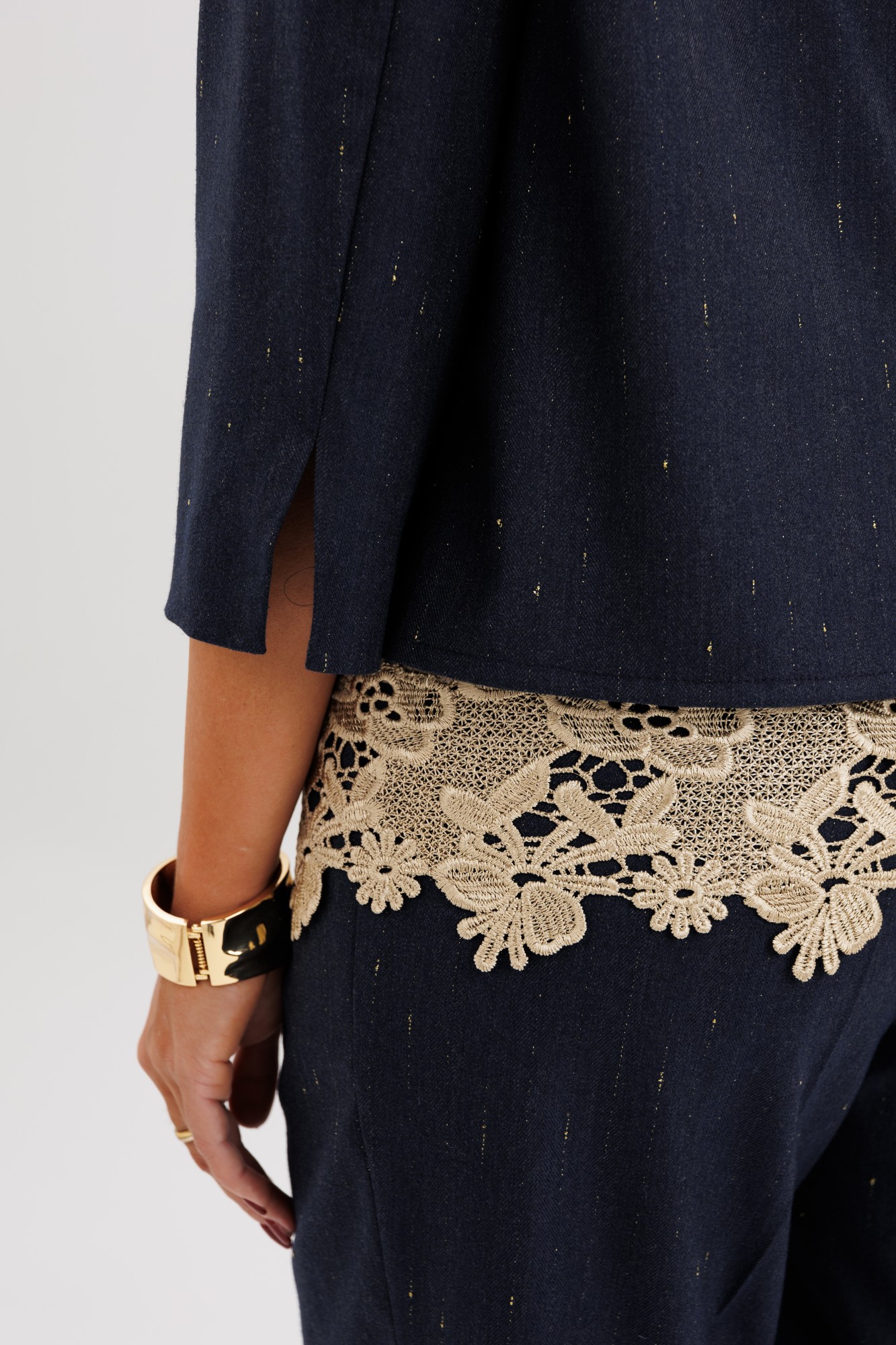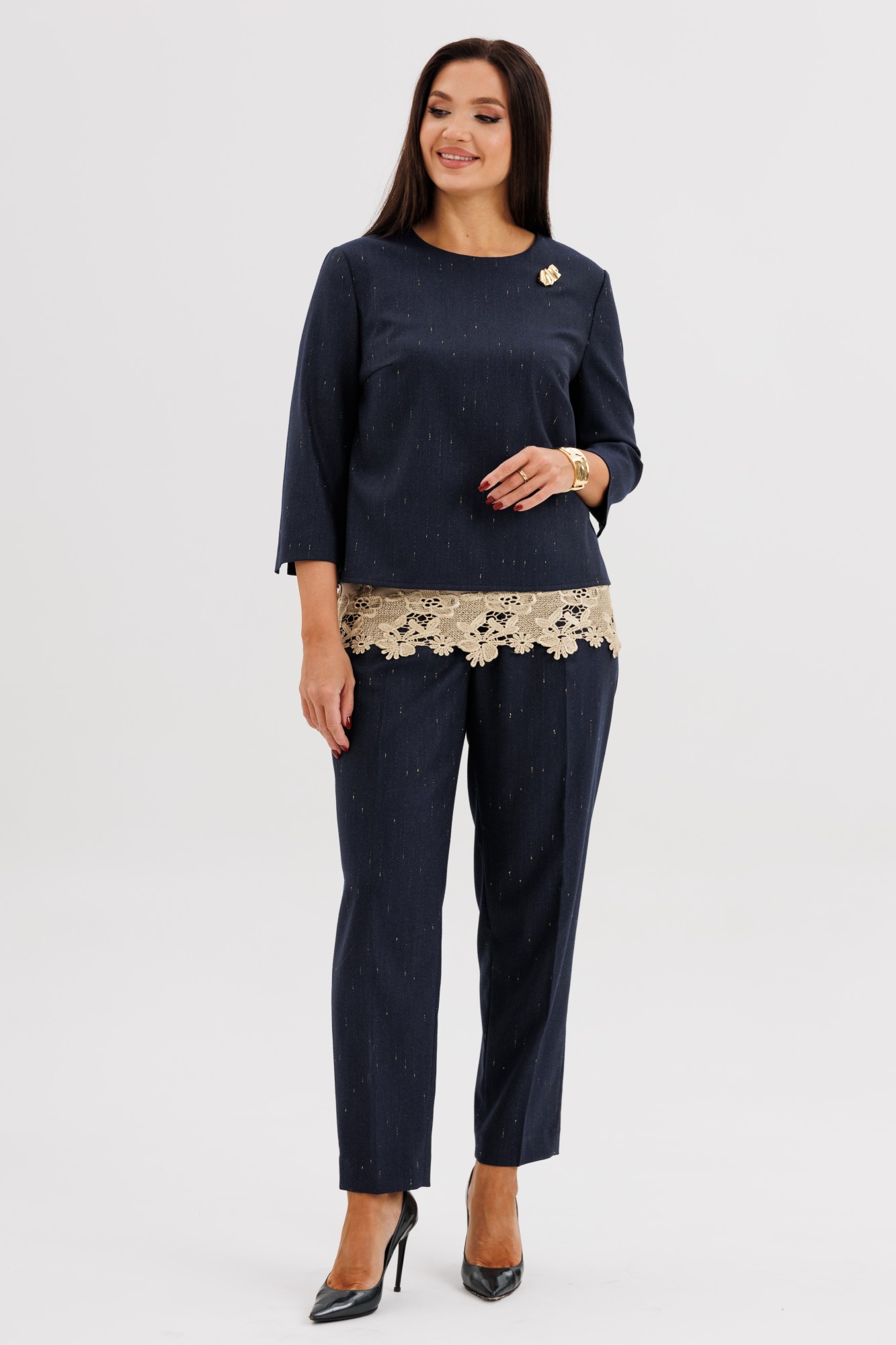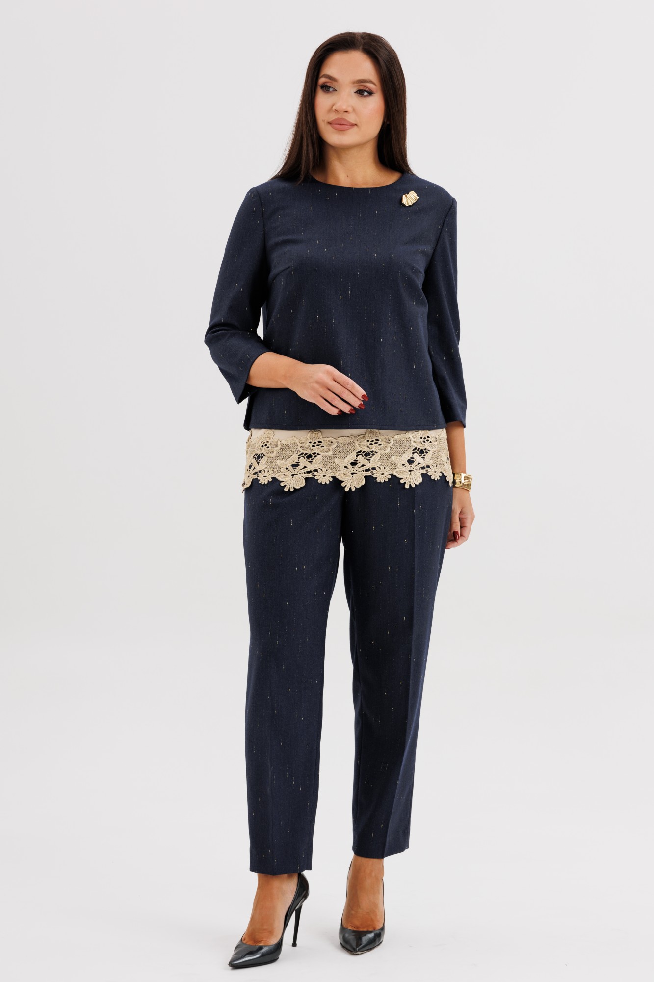 Утончённый и женственный костюм, созданный для особых случаев и стильных будней. Мягкое мерцание люрексовой нити в поливискозной ткани придаёт образу изысканное сияние, а продуманный крой обеспечивает идеальную посадку и комфорт. Главный акцент комплекта — нижний атласный топ с роскошной кружевной отделкой, создающий эффект многослойности и добавляющий наряду нотку романтичности. Верхняя блуза с рукавом ¾ лаконична и элегантна, а прямые брюки визуально вытягивают силуэт, делая образ стройнее и гармоничнее. Такой ансамбль станет отличным выбором для торжеств, встреч и особых случаев, когда хочется подчеркнуть вкус и женственность. Современная классика в лучших традициях элегантного стиля.
