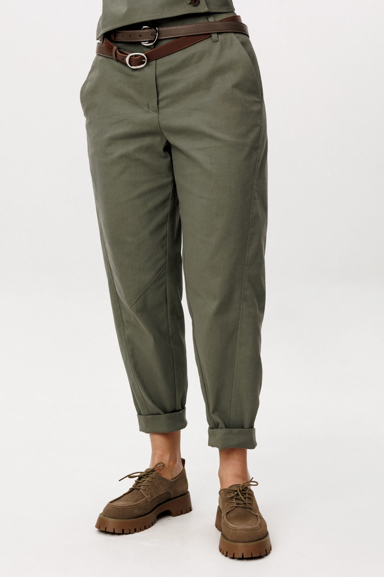 Современная брючная тройка, сочетающая продуманный крой и комфорт повседневного гардероба. Модель выполнена в стиле casual и подходит для динамичного городского ритма, сохраняя аккуратный и собранный внешний вид. Жакет отличается двубортной косой застёжкой, которая легко трансформируется в отложной лацкан. Лацкан фиксируется к полочке с помощью пуговиц, что позволяет менять характер образа — от более строгого к расслабленному. Жилет с асимметричной застёжкой и неровной линией низа добавляет образу архитектурность и подчёркивает дизайнерский подход. Брюки сложного кроя выполнены с цельнокроеным поясом спереди и притачным эластичным поясом на спинке, обеспечивающим комфортную посадку. Слегка зауженный книзу силуэт и наклонные боковые карманы формируют современную линию и визуально вытягивают фигуру. Костюм легко адаптируется под разные стилистические сценарии — от повседневных городских образов до smart casual, сочетаясь как с обувью на плоском ходу, так и с более акцентной парой. Ремень в комплект не входит!