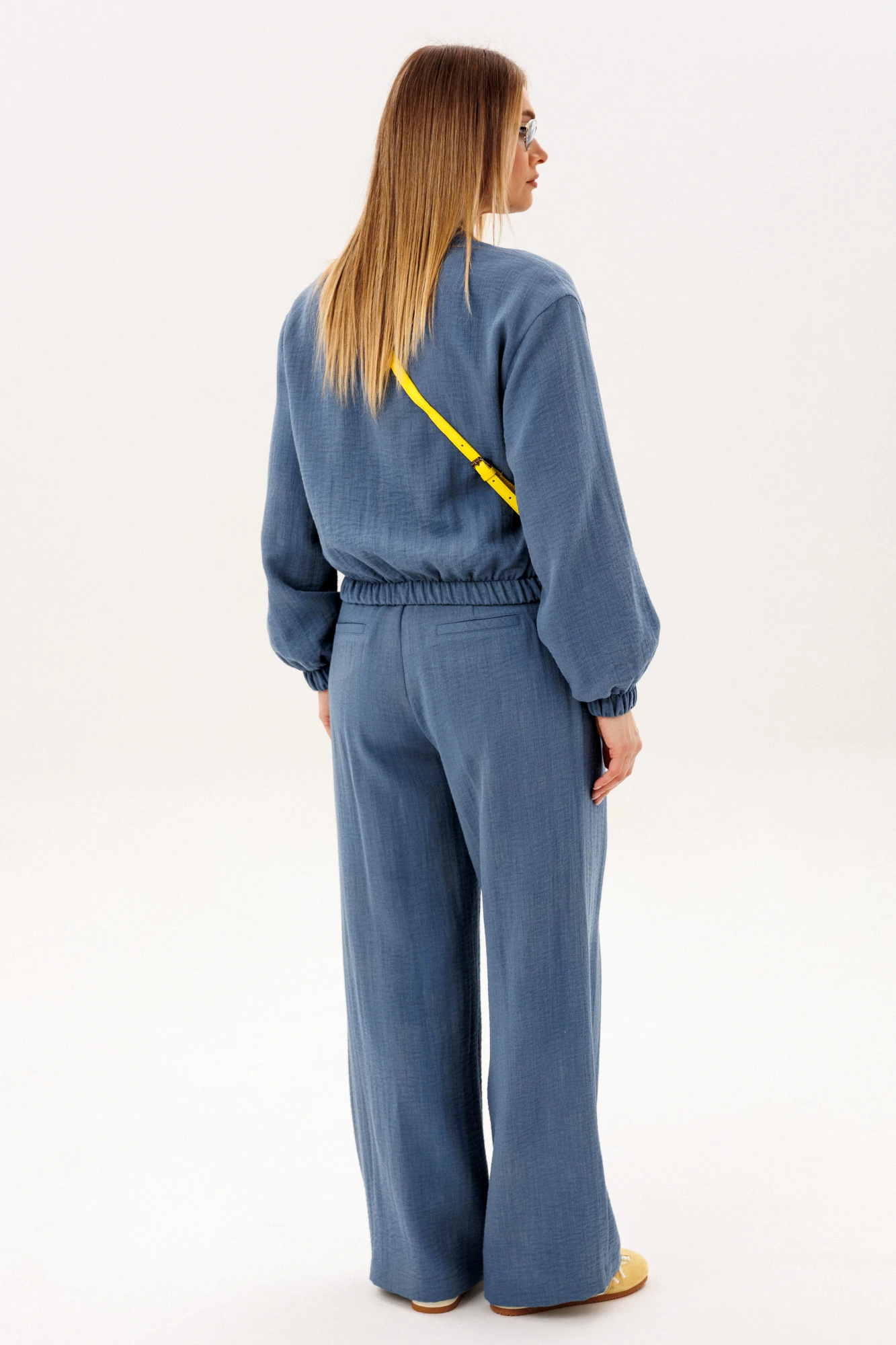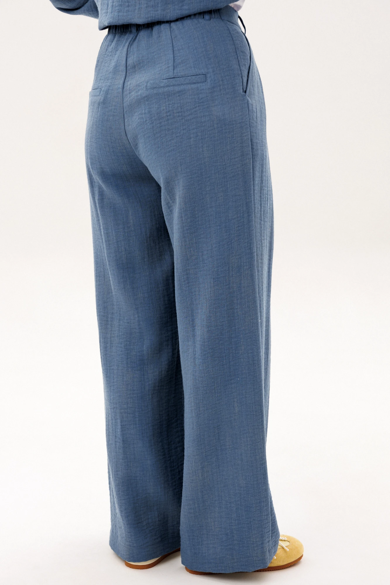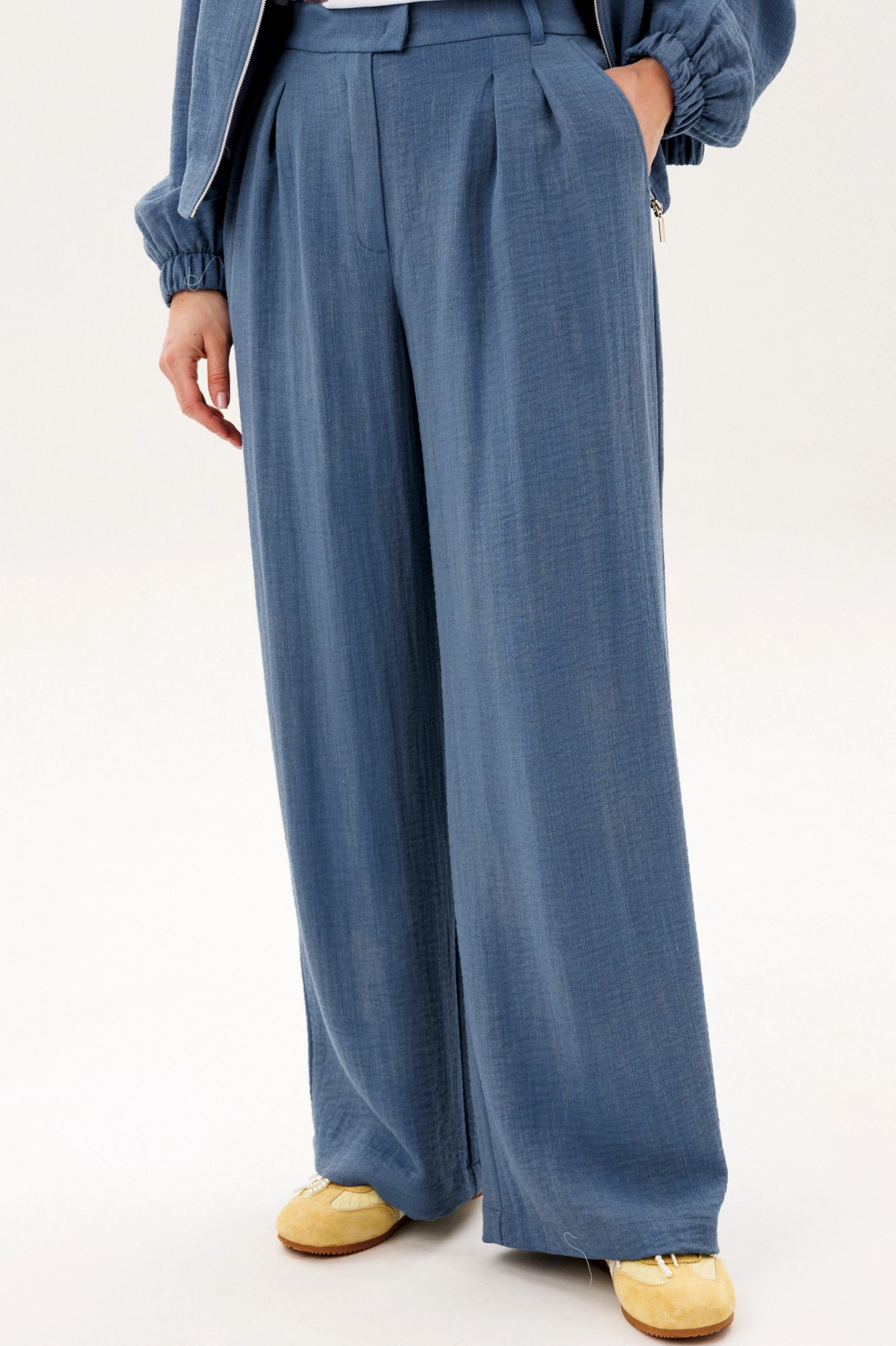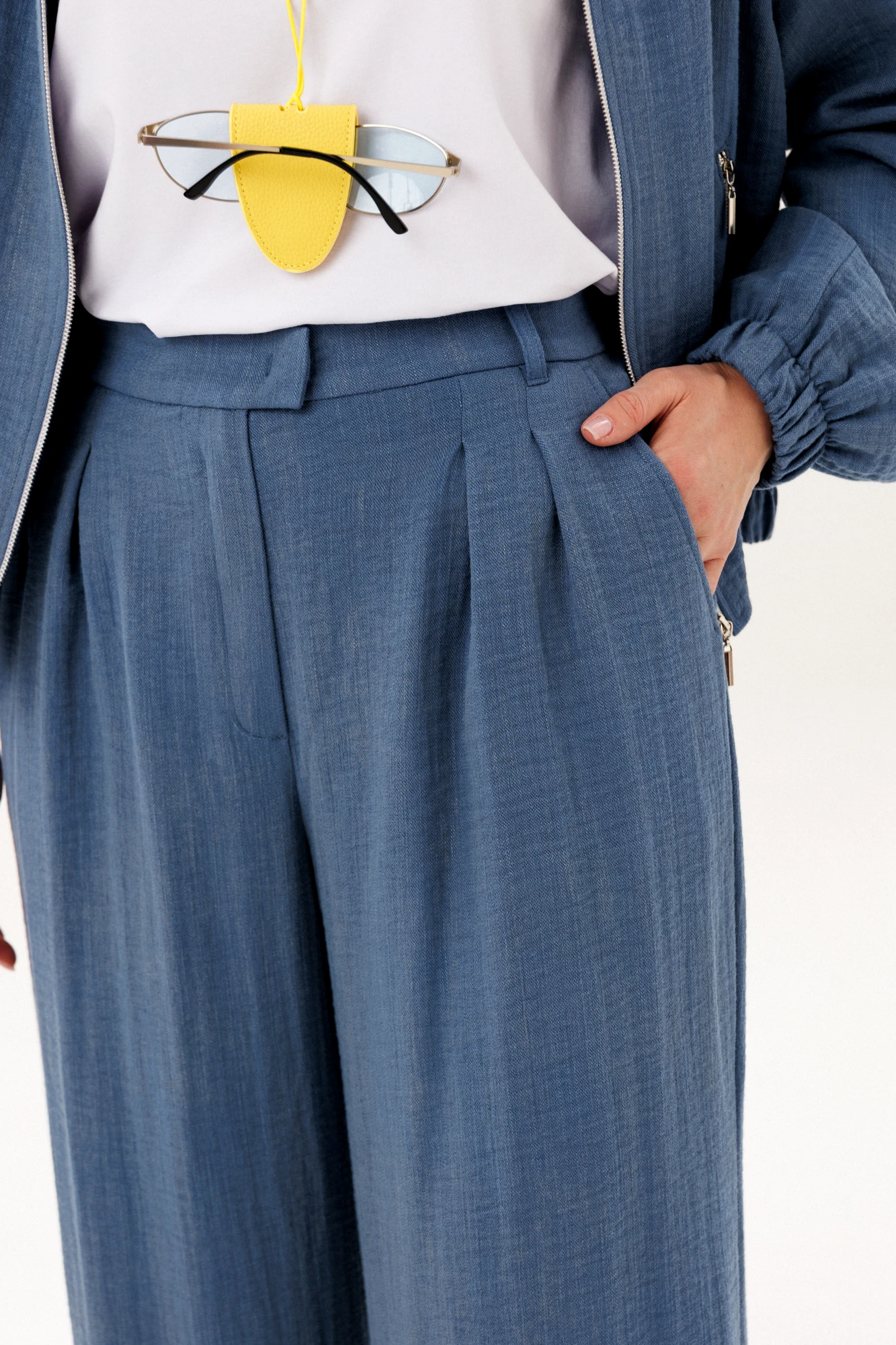 Стильный брючный комплект в благородном голубом оттенке — универсальное решение для современного гардероба. Лаконичный дизайн и свободный крой создают лёгкий, элегантный образ, который идеально подходит для повседневной жизни и городских прогулок. Комплект состоит из: Лёгкого жакета свободного кроя с мягкой линией плеч и эластичными манжетами. Широких брюк с высокой посадкой и аккуратными складками спереди. Жакет придаёт образу расслабленную элегантность и комфорт, а широкие брюки визуально вытягивают силуэт и обеспечивают свободу движений. Продуманный крой делает модель удобной и универсальной для разных типов фигуры. Изделие выполнено из приятного к телу материала, который хорошо держит форму, оставаясь лёгким и комфортным в течение всего дня. Преимущества модели: актуальный свободный силуэт, стильные широкие брюки, комфортная посадка, универсальный дизайн для повседневных образов. Комплект легко комбинируется с базовыми топами, футболками и различной обувью — от кроссовок до элегантных туфель. Это идеальный выбор для тех, кто ценит комфорт, современный стиль и практичность в одежде.