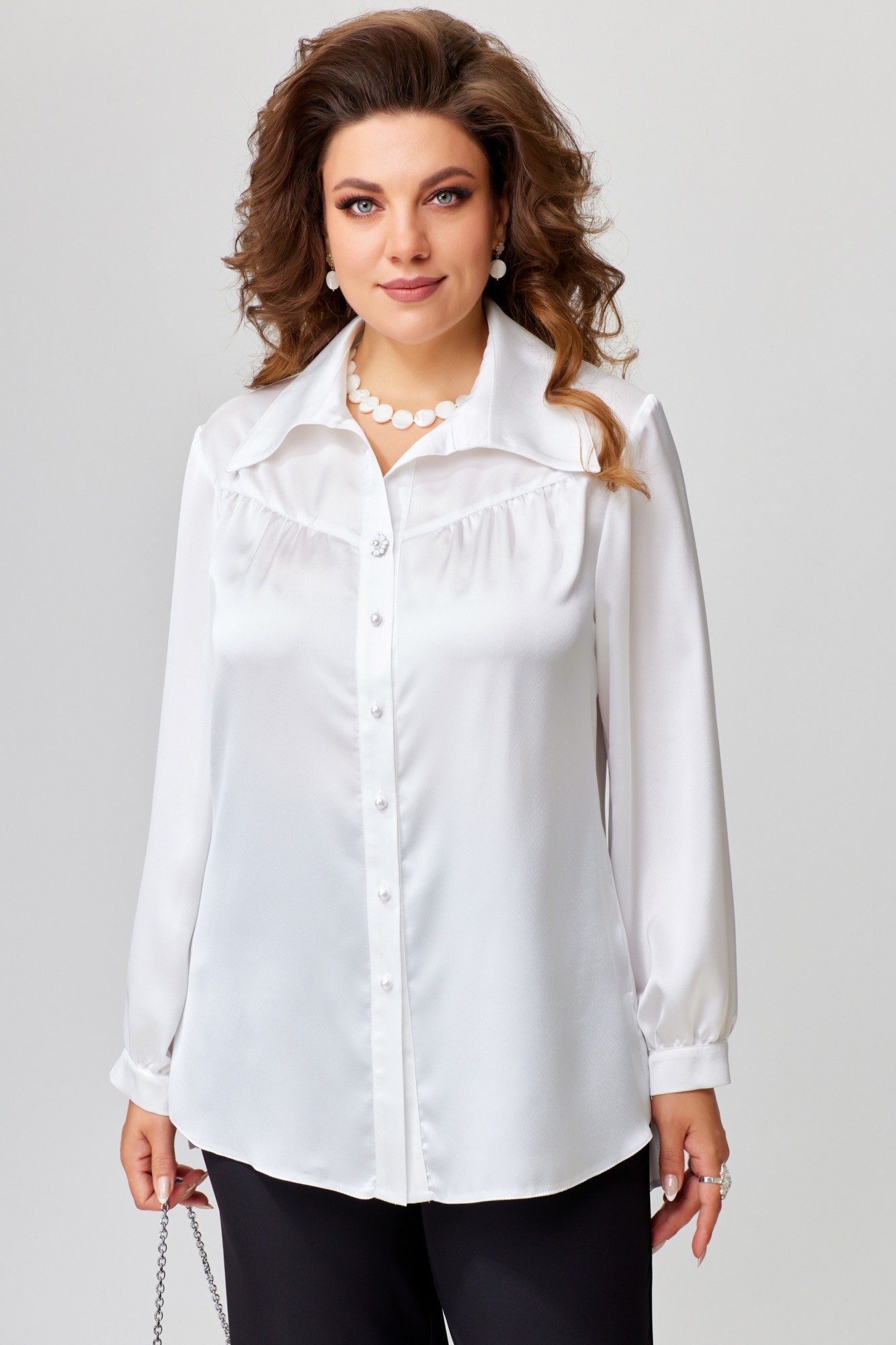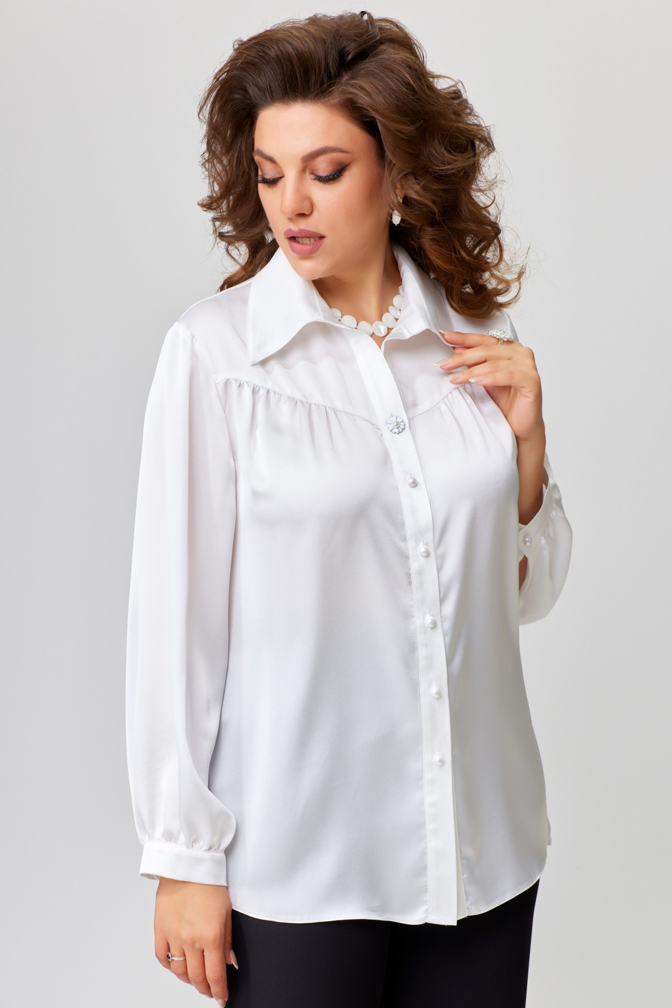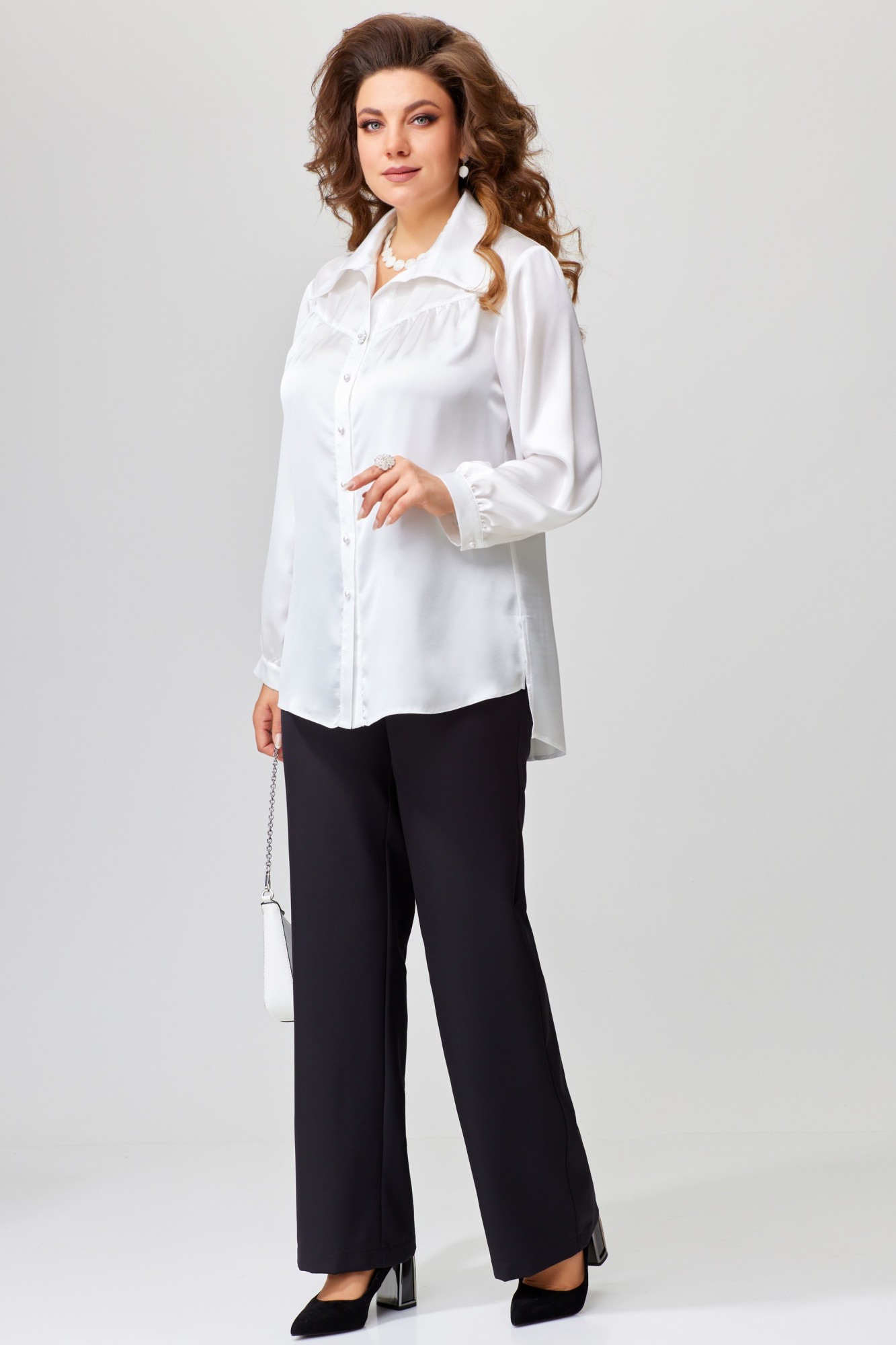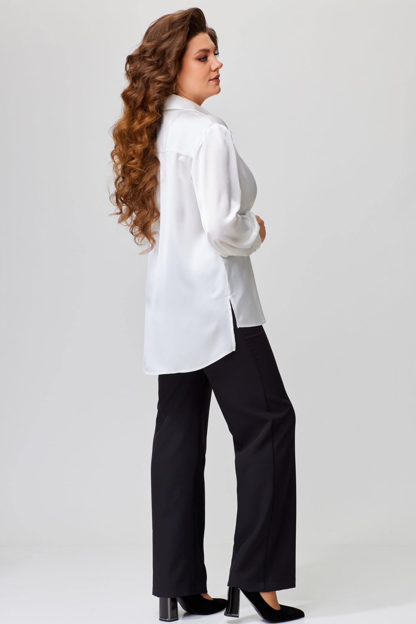 Женский комплект двойка ХАРИСА состоит из блузки и брюк, выполнен из текстильной ткани. Блузка проямого силуэта. Воротник отложной рубашечного типа на стойке, застежка на петли и пуговицы, планка отрезная. По спинке блузки кокетка, рукав в блузке втачной, по низку рукава манжет с застежкой на петлю и пуговицы. По полочке сборка и отрезная кокетка. Низ изделия обработан швом в подгибку с открытым срезом. В боковых швах блузки - разрезы. Брюки прямого силуэта с застежкой на молнию и пуговицу. По переду брюк карманы, верх брюк обработан поясом, по спинке резинка. Низ брюк обработан в подгибку.