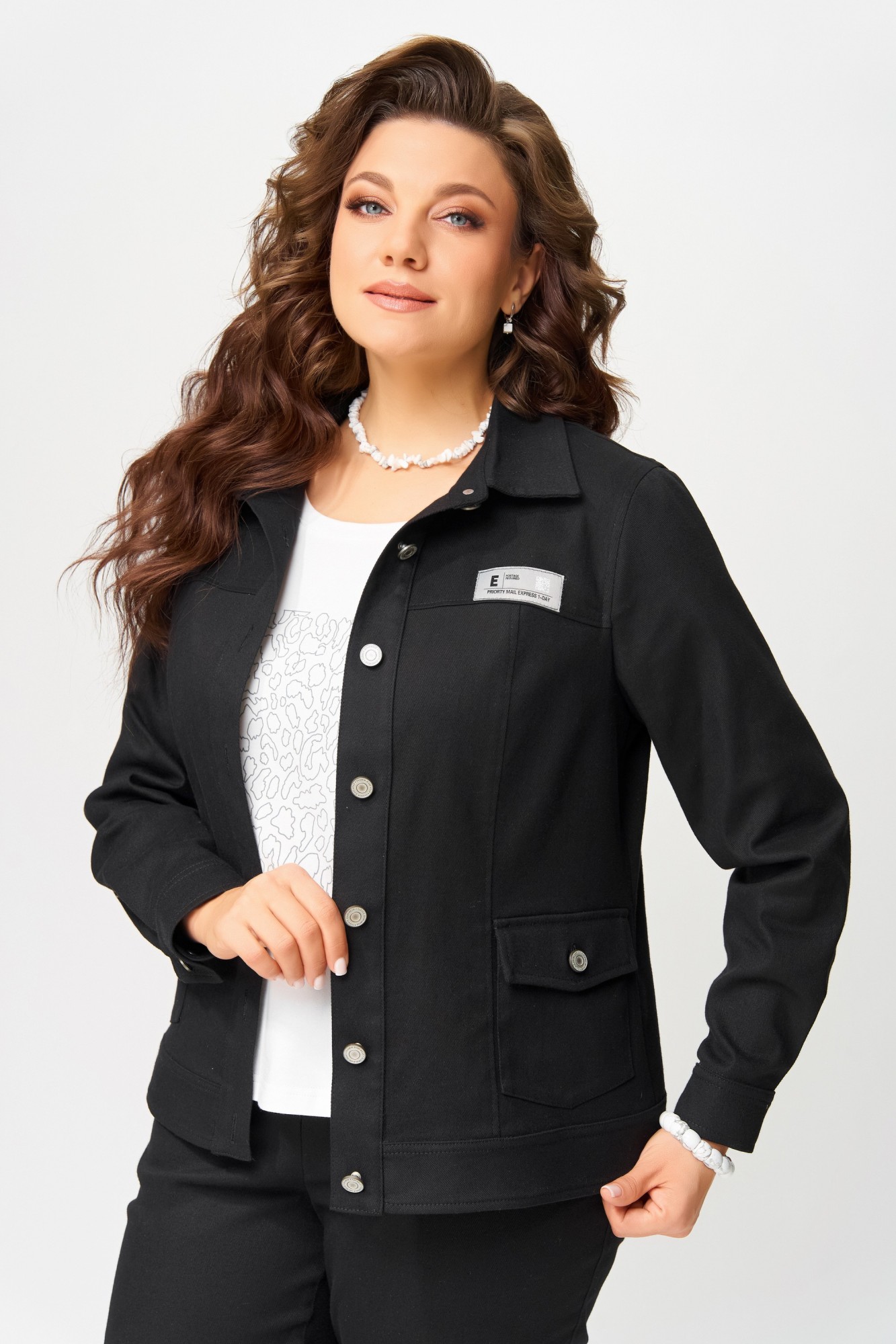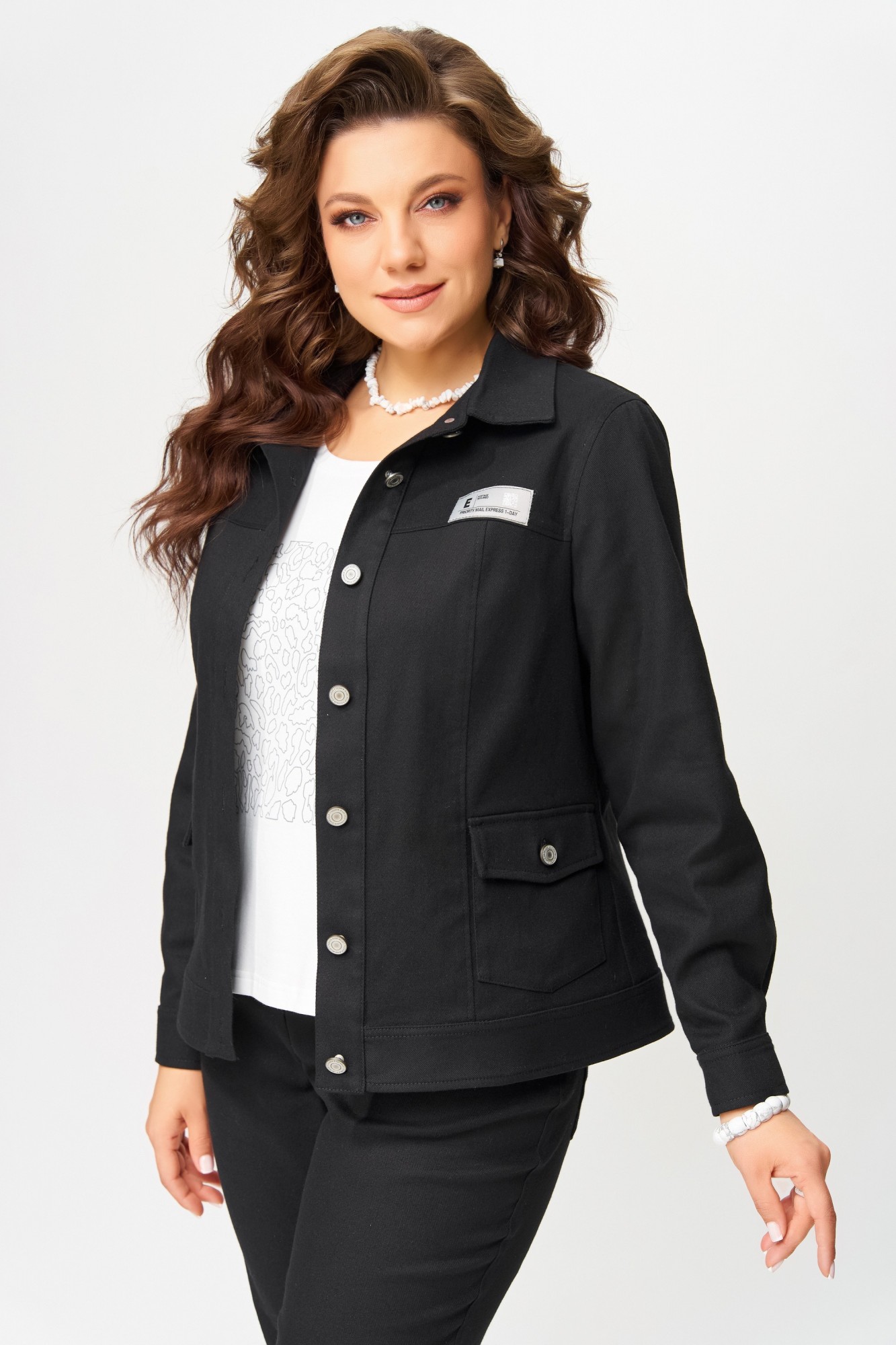 Бомбер — как архитектура мегаполиса, строгий и выверенный, но с характером. Полуприлегающий силуэт подчеркивает линию плеч и талию, создавая образ собранный, но не скованный. Хлопковая джинсовая ткань без подкладки — легкая, дышащая, с естественной текстурой, словно отражение городской среды. Однобортная застежка на петли и пуговицы — классика, переосмысленная в духе минимализма. Отрезная планка, кокетки и рельефы на полочке и спинке — это графика, вычерченная нитями, создающая объем и ритм. Накладные карманы с клапанами — функциональные акценты, а манжеты на рукавах с застежкой — штрих, завершающий композицию. Воротник рубашечного типа со стойкой добавляет интеллигентности, а декоративная нашивка на кокетке — индивидуальности, как подпись на холсте.