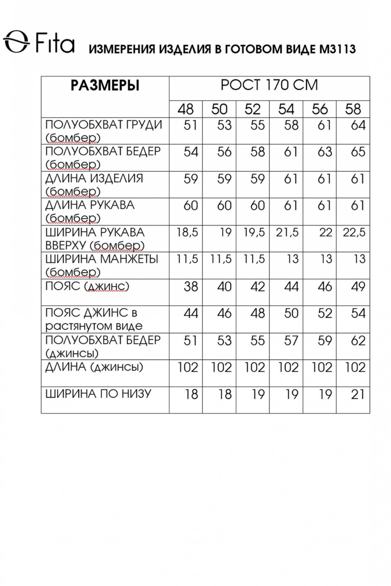 Таблица размеров
