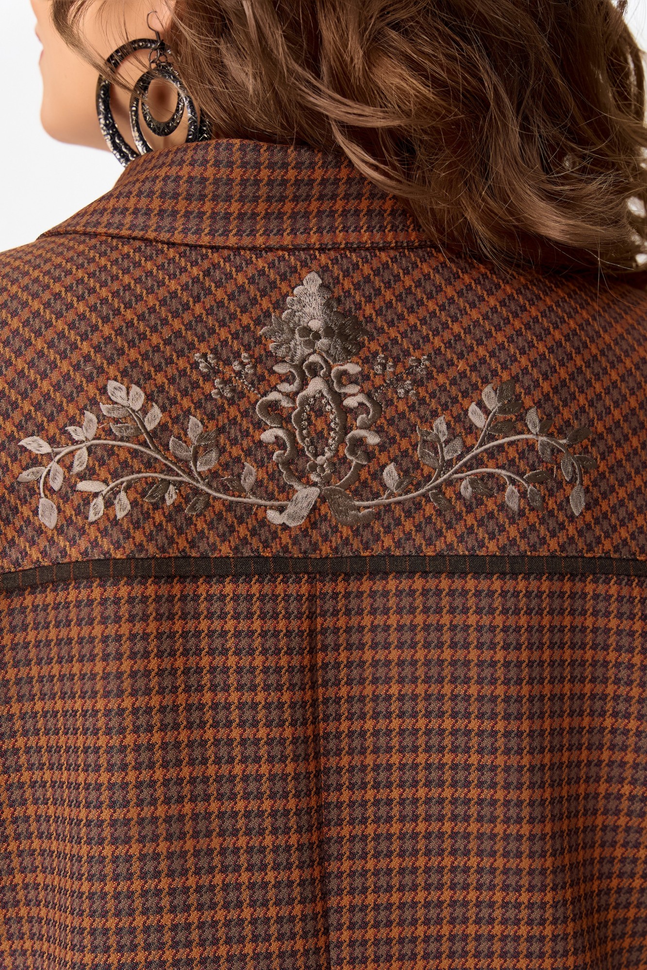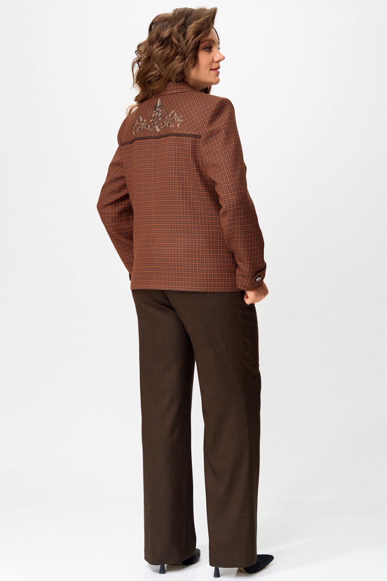 Жакет — как картина, написанная в клетку, где каждая линия — это штрих характера. Выполненный из текстильной ткани с подкладкой, он обнимает фигуру полуприлегающим силуэтом, подчеркивая осанку и уверенность. Однобортная застежка на петли и пуговицы — классическая, но с современным акцентом. Отложной воротник добавляет интеллигентности, а кокетка с декоративным кантом — изысканную графику, словно тонкая рамка на портрете. Нагрудная выточка и отрезной бочок формируют изящный рельеф, а накладные карманы с клапанами — функциональные и стильные, как детали винтажного чемодана. Спинка с кокеткой и средним швом — завершение композиции, где каждая строчка — как линия судьбы. Рукава — двухшовные, втачные, с декоративной патой на манжете — это штрих, который делает образ завершённым и продуманным.