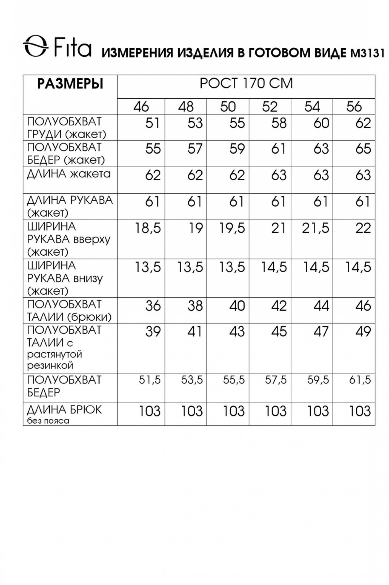 Таблица размеров