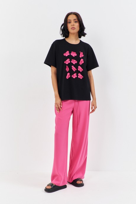 Комплект брюки с майкой. Майка свободного силуэта со спущенным рукавом. Характеристики: выполнена из трикотажного полотна в черном цвете, по переду розовые цветы-украшения, горловина обработана планкой, рукав укороченный. Брюки прямого силуэта. Выполнены из костюмно-плательной ткани в розовом цвете. Пояс брюк на резинке с завязками.