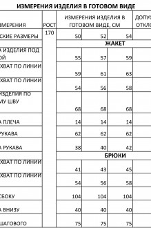 Классический двухпредметный комплект, состоящий из жакета и брюк. Жакет двубортный полуприлегающего силуэта на подкладке. Рукава двухшовные втачные, по переду функциональные карманы. Брюки зауженные к низу, пояс отрезной со шлевками, по бокам на резинке для лучшего прилегания. В боковых швах карманы, застежка на молнию и пуговицу.
