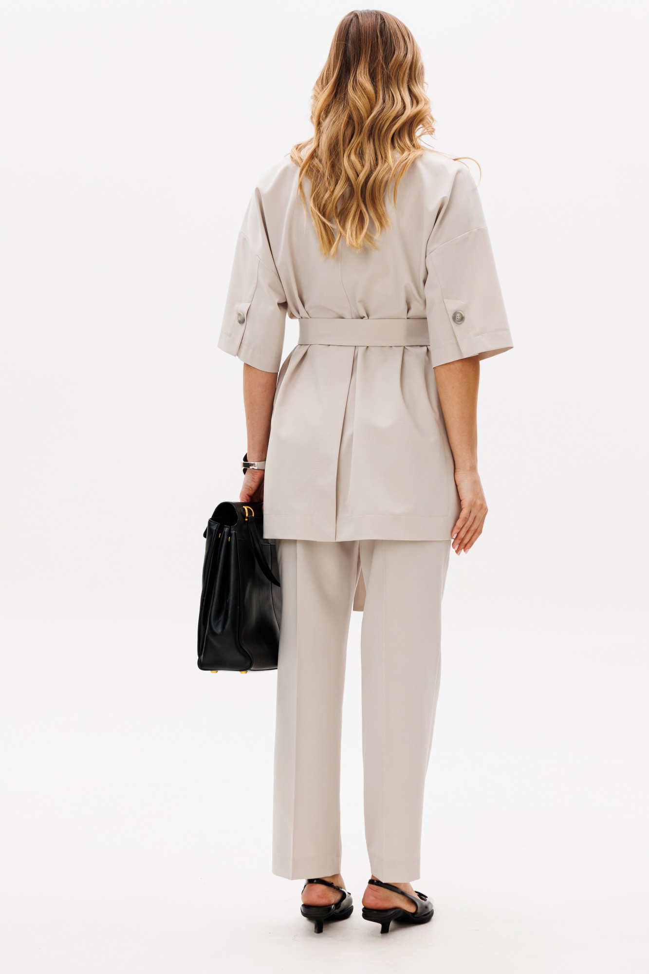 Костюм состоит из жакета и брюк выполненных из летней костюмной ткани. Жакет прямого силуэта с воротником пиджачного типа. Застежка однобортная на две петли и пуговицы. По переду клапан. Спинка со средним швом и шлицей. В боковых швах разрезы. Рукав втачной одношовный со шлицей и пуговицей. К жакету прилагается съёмный пояс из основной ткани с пластиковой пряжкой. Брюки зауженные книзу. Верх брюк на поясе со шлевками. В боковых частях пояса вставлена резинка. Застежка гульфик на молнии и пуговицей на поясе. В боковом шве карманы с наклонным входом. На брюках заутюжены стрелки.