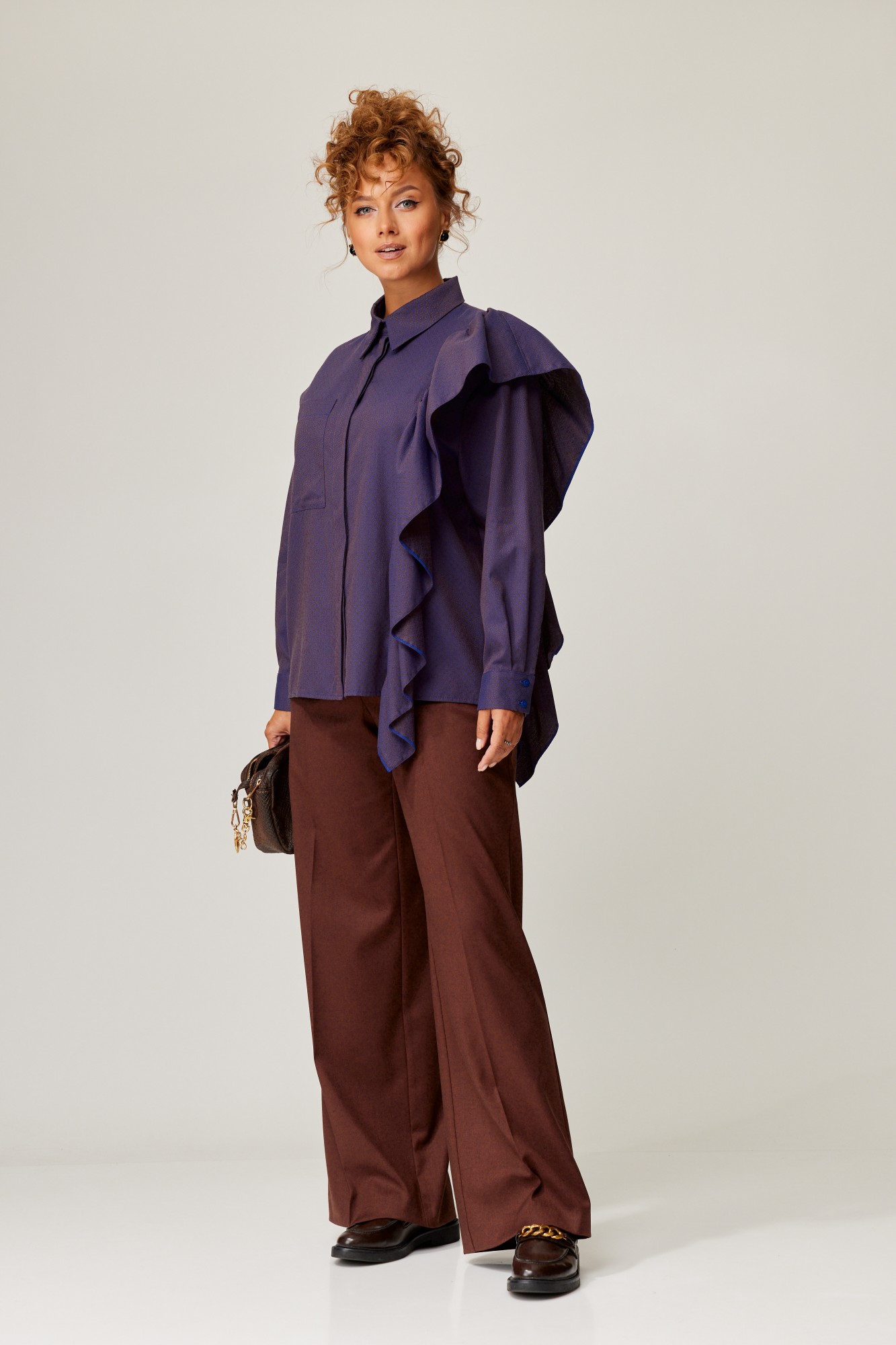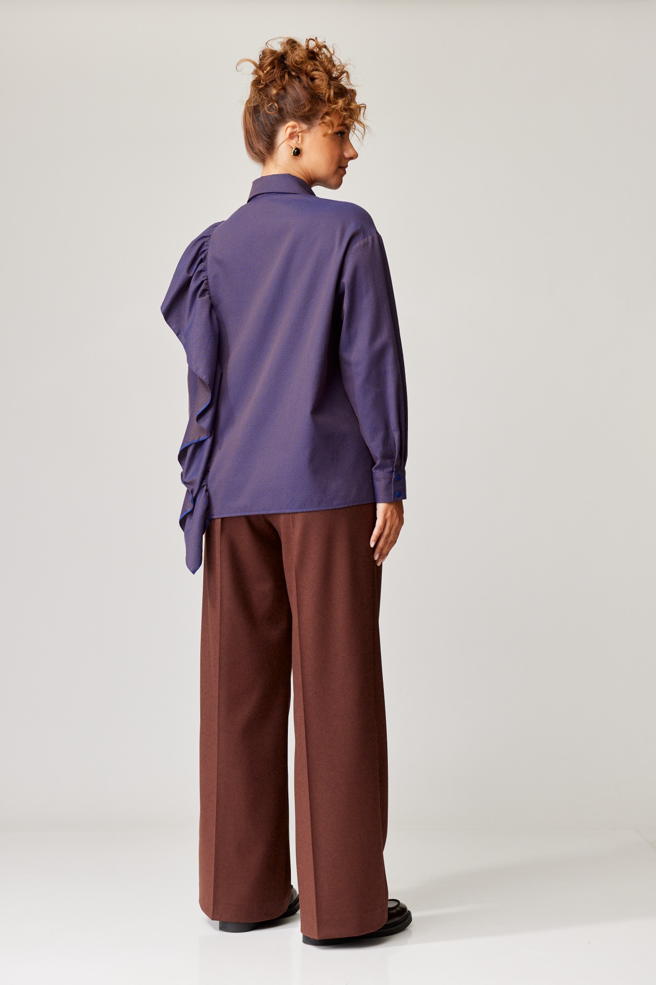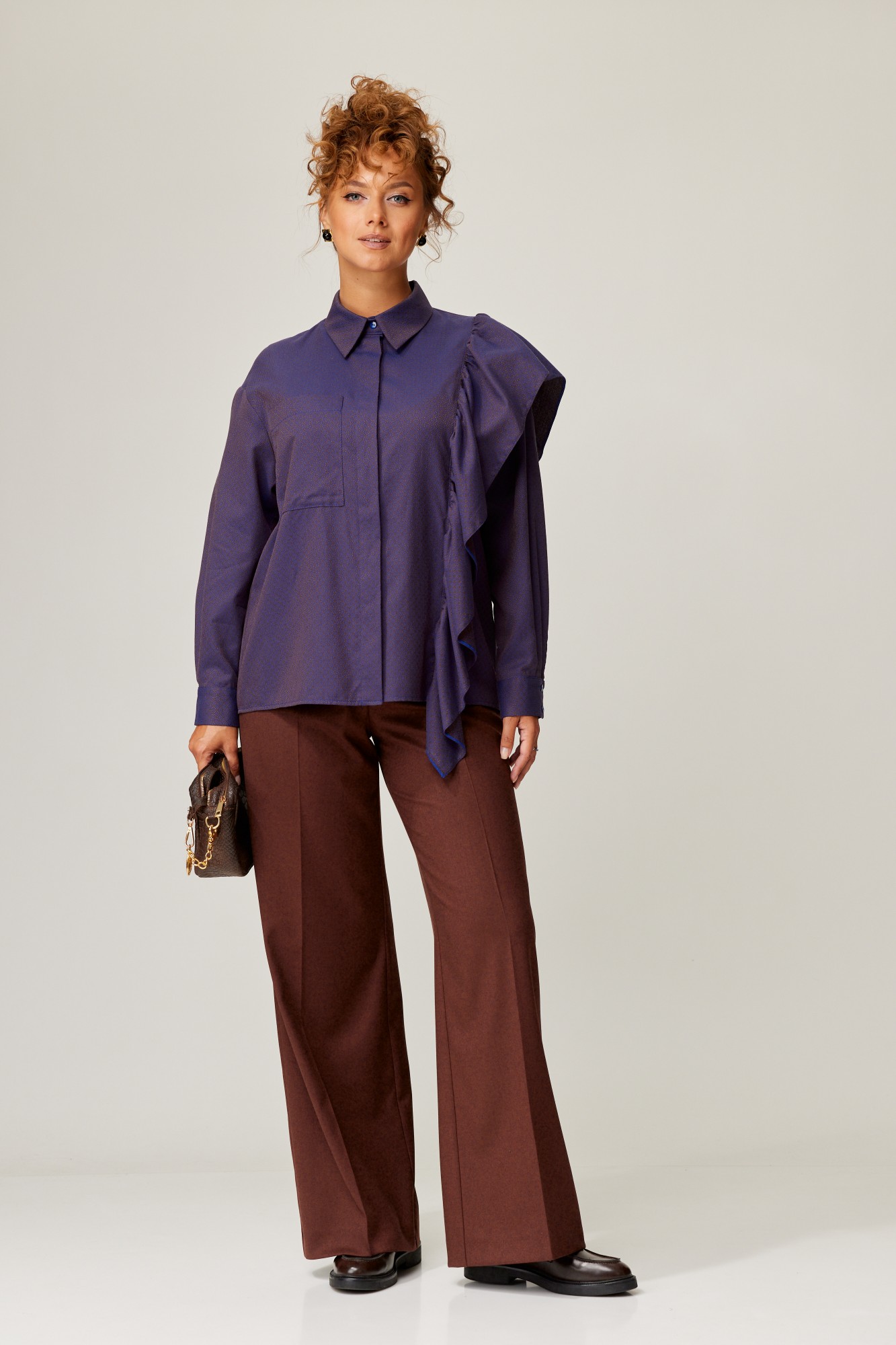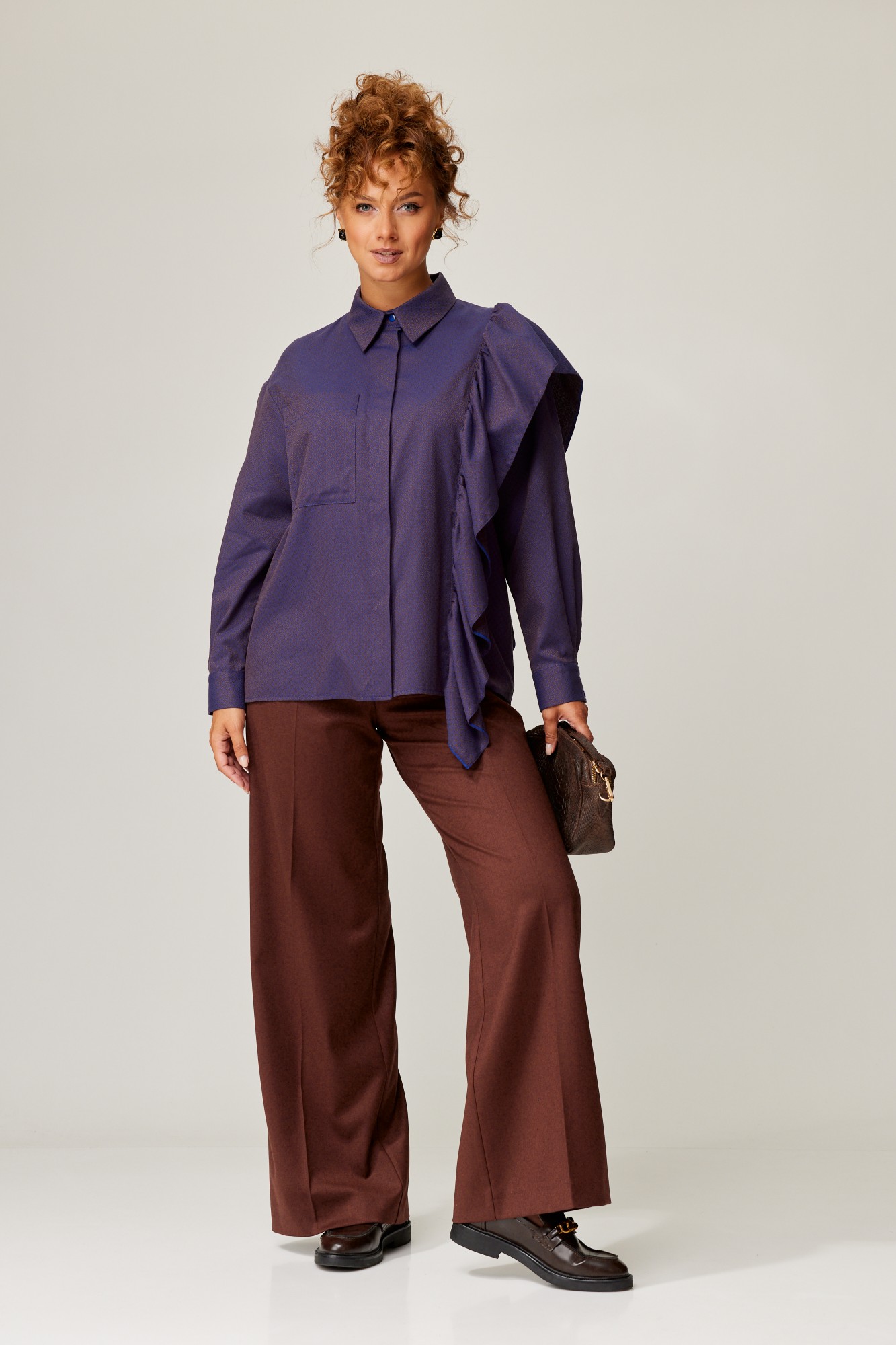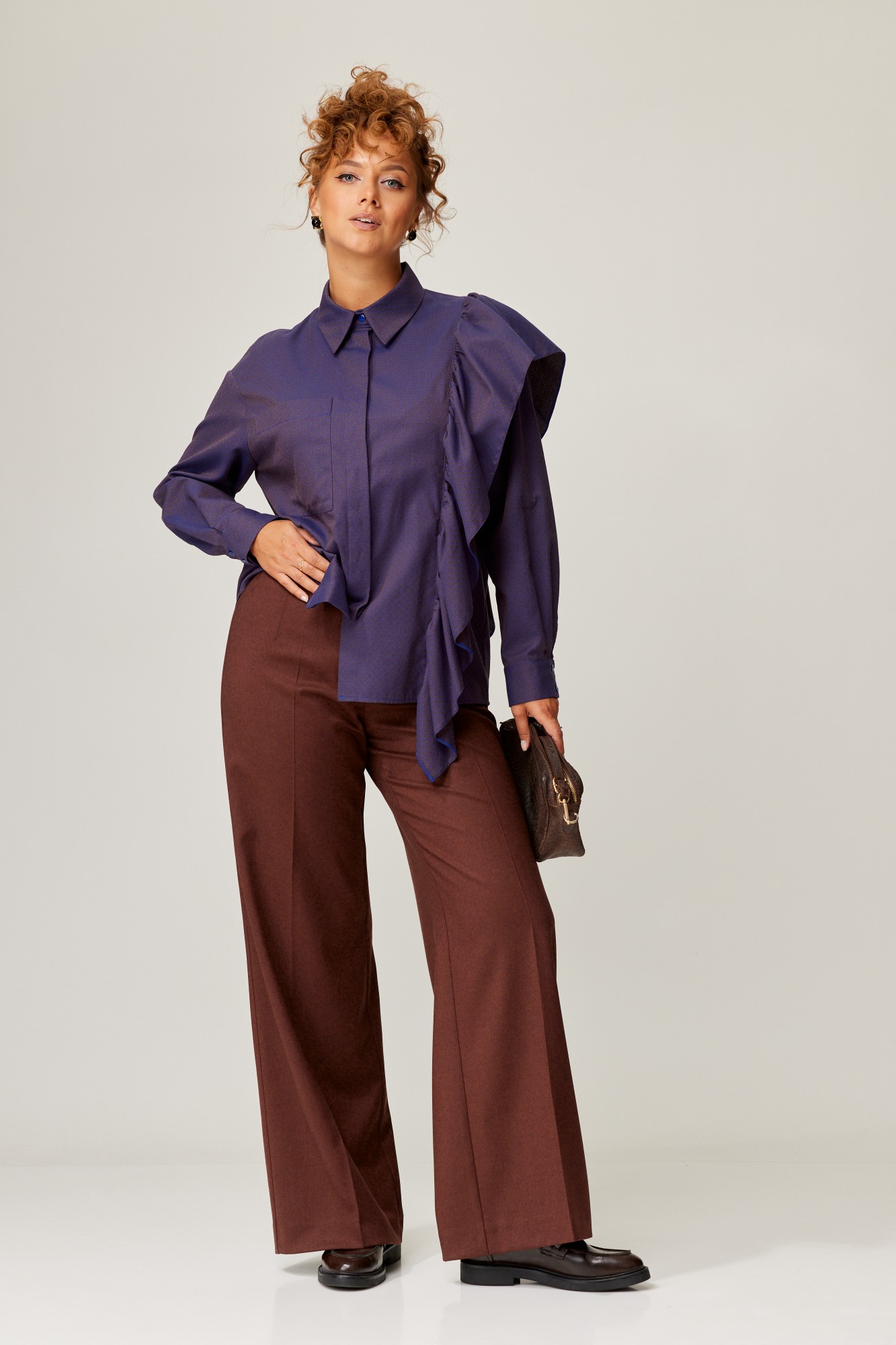 Костюм состоит из блузки (рубашки) и брюк. Рубашка прямого силуэта выполнена из хлопковой ткани с оригинальным жаккардовым переплетением. Перед с центральной застежкой потайной планкой. Левая часть переда и спинка с воланом на сборке вставленном в рельеф. На правой части переда настрочен карман. Рукав втачной одношовный с манжетой по низу. на манжете застежка на 2 петли и пуговицы. Воротник отложной со стойкой. Брюки расширенные книзу с притачным поясом выполнены из костюмной ткани средней плотности. В поясе по бокам вставлена резинка. По передней и задней частям брюк вытачки и заутюжены стрелки. Спереди застежка гульфик на молнии и пуговицей на поясе. Фурнитура может быть изменена с сохранением художественного образа.