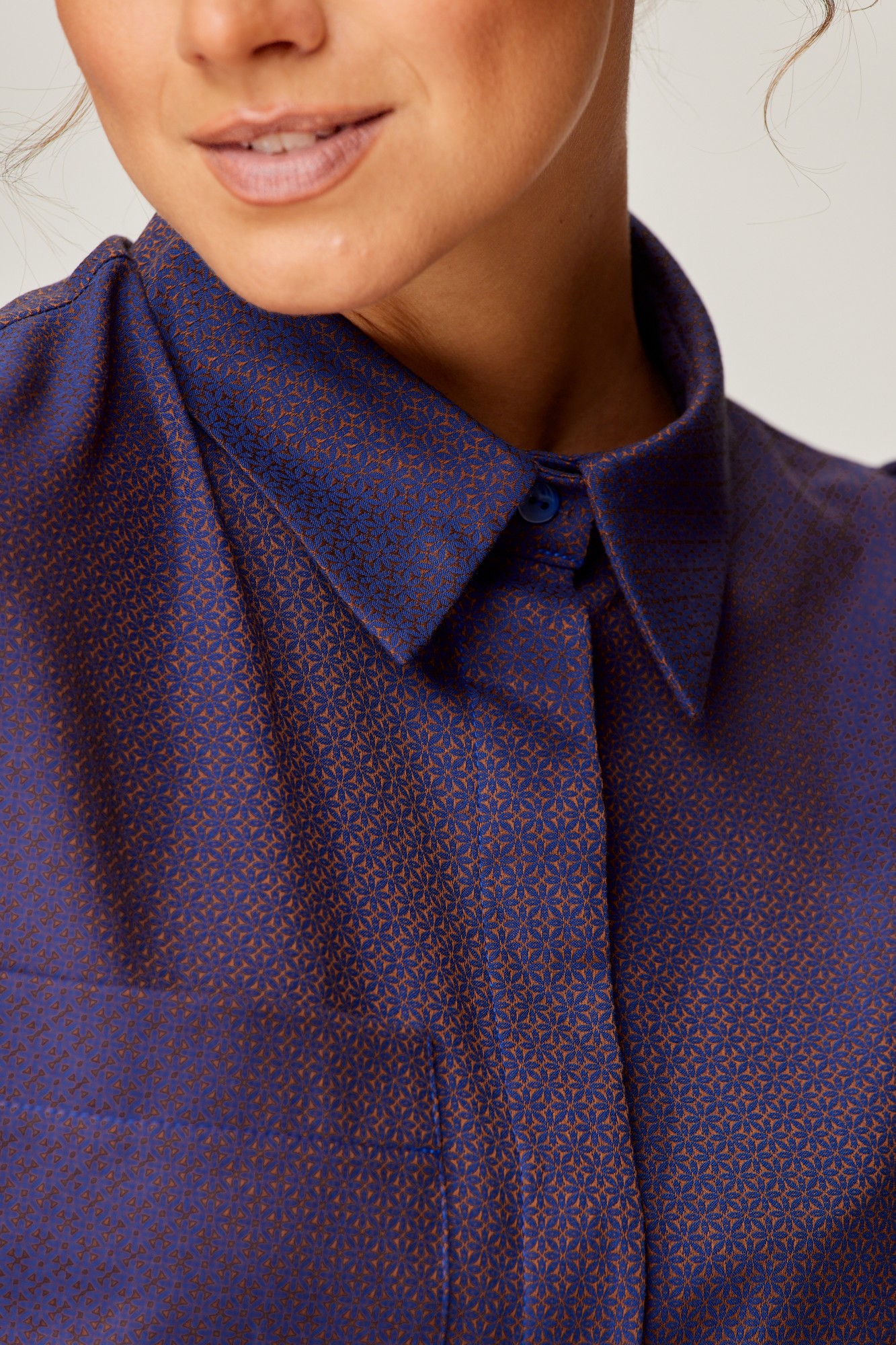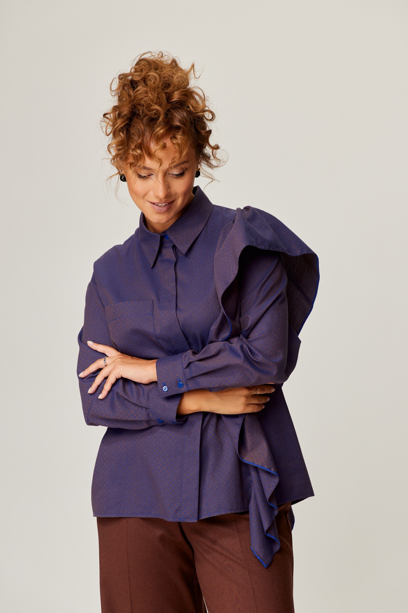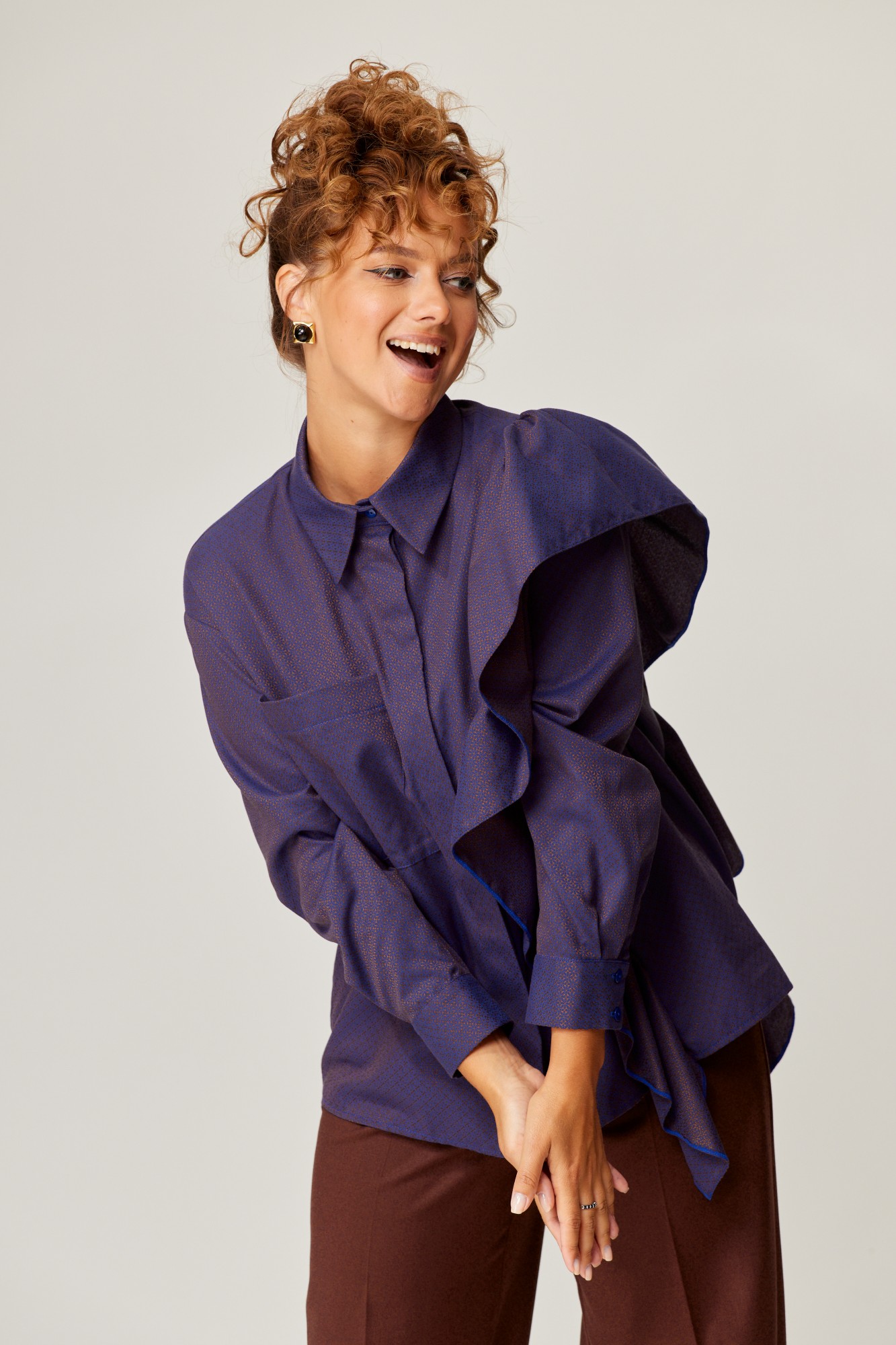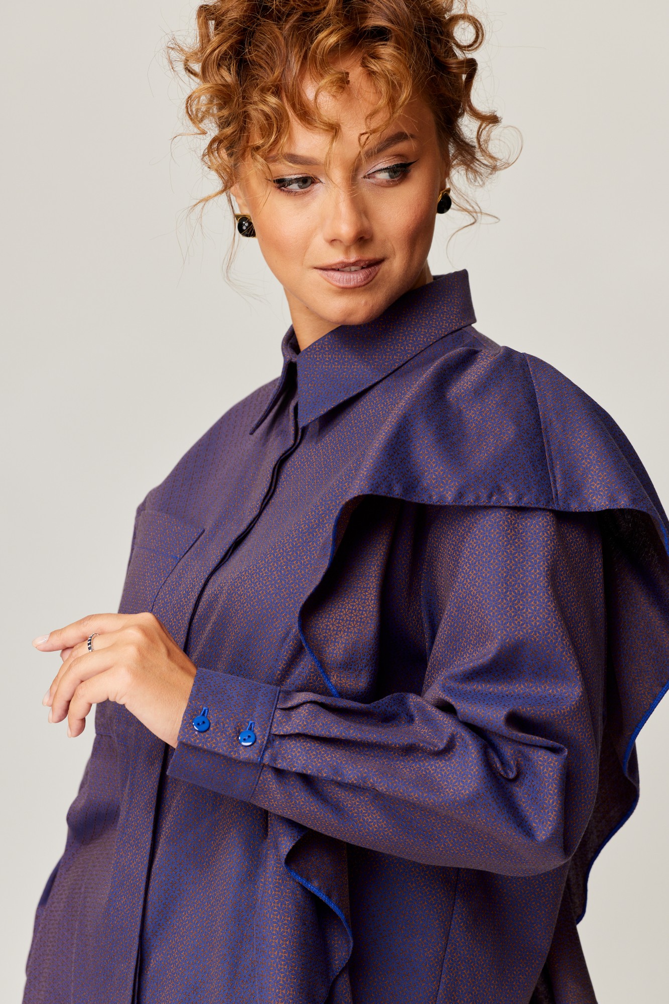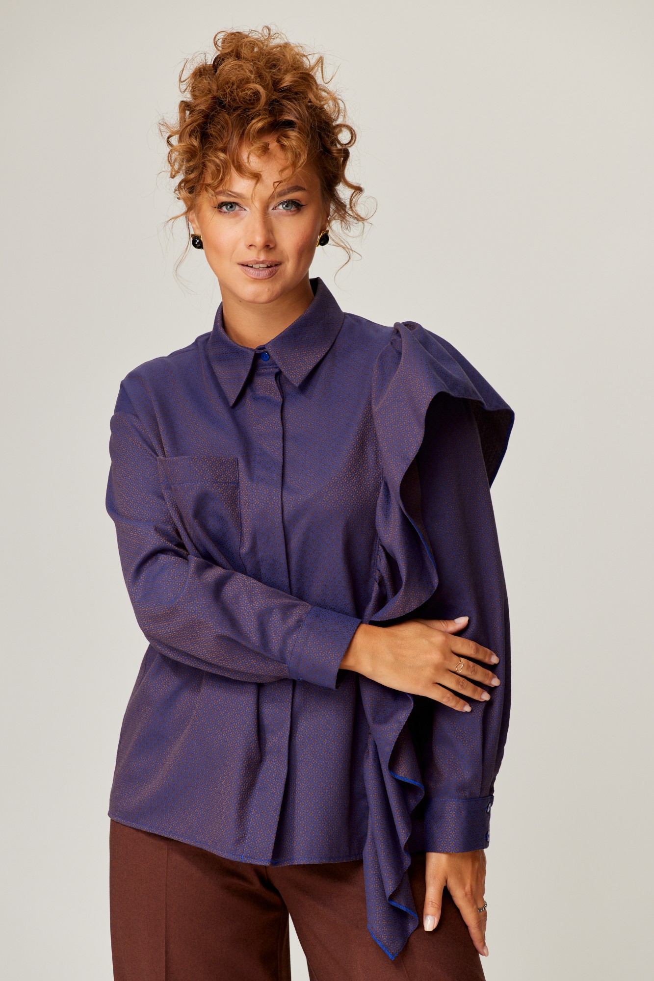 Костюм состоит из блузки (рубашки) и брюк. Рубашка прямого силуэта выполнена из хлопковой ткани с оригинальным жаккардовым переплетением. Перед с центральной застежкой потайной планкой. Левая часть переда и спинка с воланом на сборке вставленном в рельеф. На правой части переда настрочен карман. Рукав втачной одношовный с манжетой по низу. на манжете застежка на 2 петли и пуговицы. Воротник отложной со стойкой. Брюки расширенные книзу с притачным поясом выполнены из костюмной ткани средней плотности. В поясе по бокам вставлена резинка. По передней и задней частям брюк вытачки и заутюжены стрелки. Спереди застежка гульфик на молнии и пуговицей на поясе. Фурнитура может быть изменена с сохранением художественного образа.