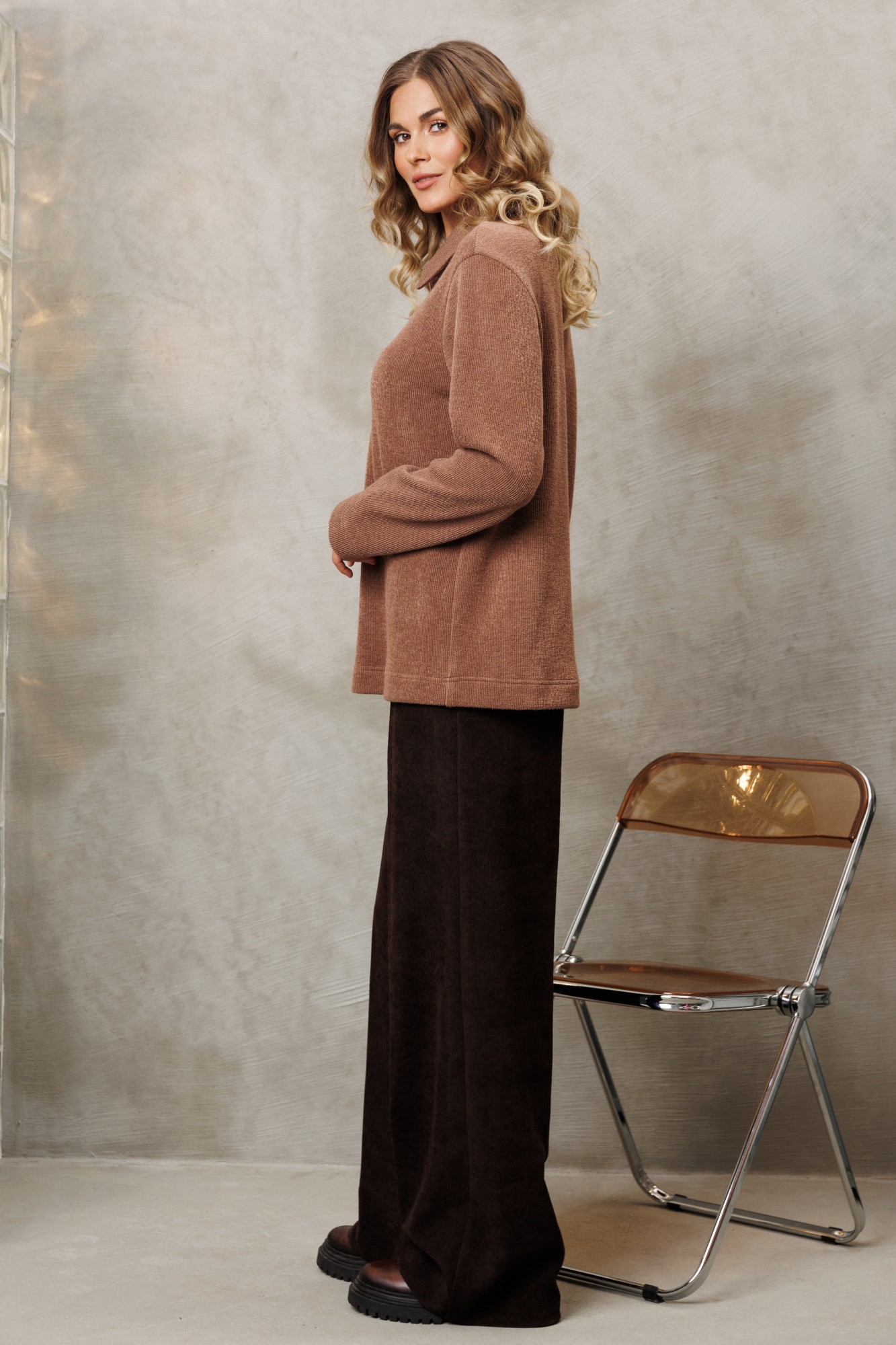 Костюм состоит из джемпера и брюк. Джемпер прямого силуэта с воротником поло из теплого трикотажного полотна. Рукав втачной одношовный. Брюки палаццо с притачным поясом из мягкой вельветовой ткани. Спереди застежка гульфик на молнии и петлей и пуговицей по поясу. По задней частям брюк вытачки. Пояс с резинкой в боковых частях. Брюки с заутюженными стрелками.