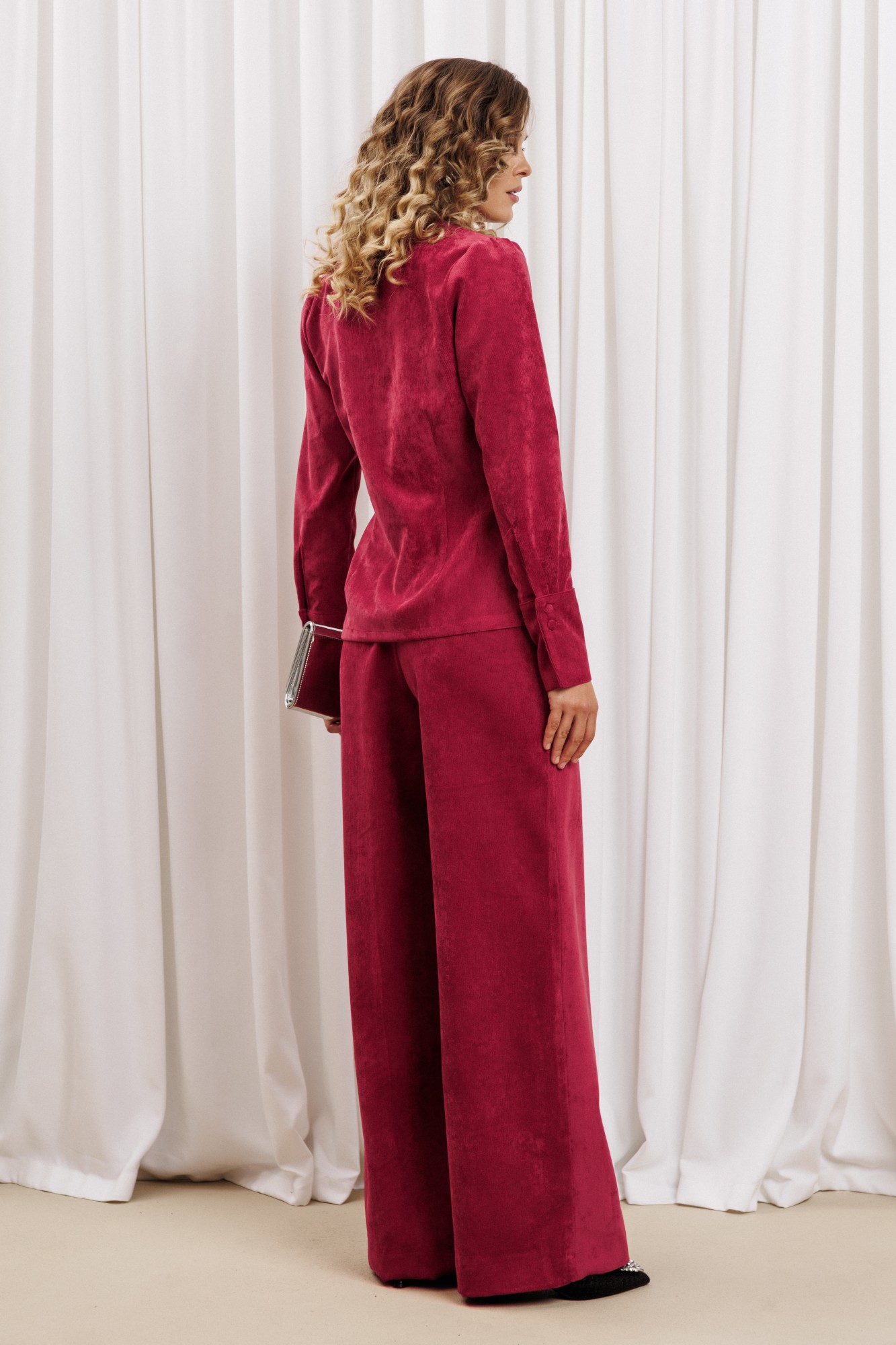 Костюм состоит из блузки и брюк. Блузка оригинальная приталенного силуэта из вельветовой ткани. Перед с подрезом под грудью, сборкой в районе груди и таллиевыми вытачками. Застёжка на петли и пуговицы. Горловина V-образной формы. Спинка со средним швом и таллиевыми вытачками. Рукав втачной со сборкой по окату и с манжетой по низу. Манжета высокая с двумя петлями и пуговицами. Брюки палаццо с притачным поясом из мягкой вельветовой ткани. Спереди застежка гульфик на молнии и петлей и пуговицей по поясу. По задней частям брюк вытачки. Пояс с резинкой в боковых частях. Брюки с заутюженными стрелками.