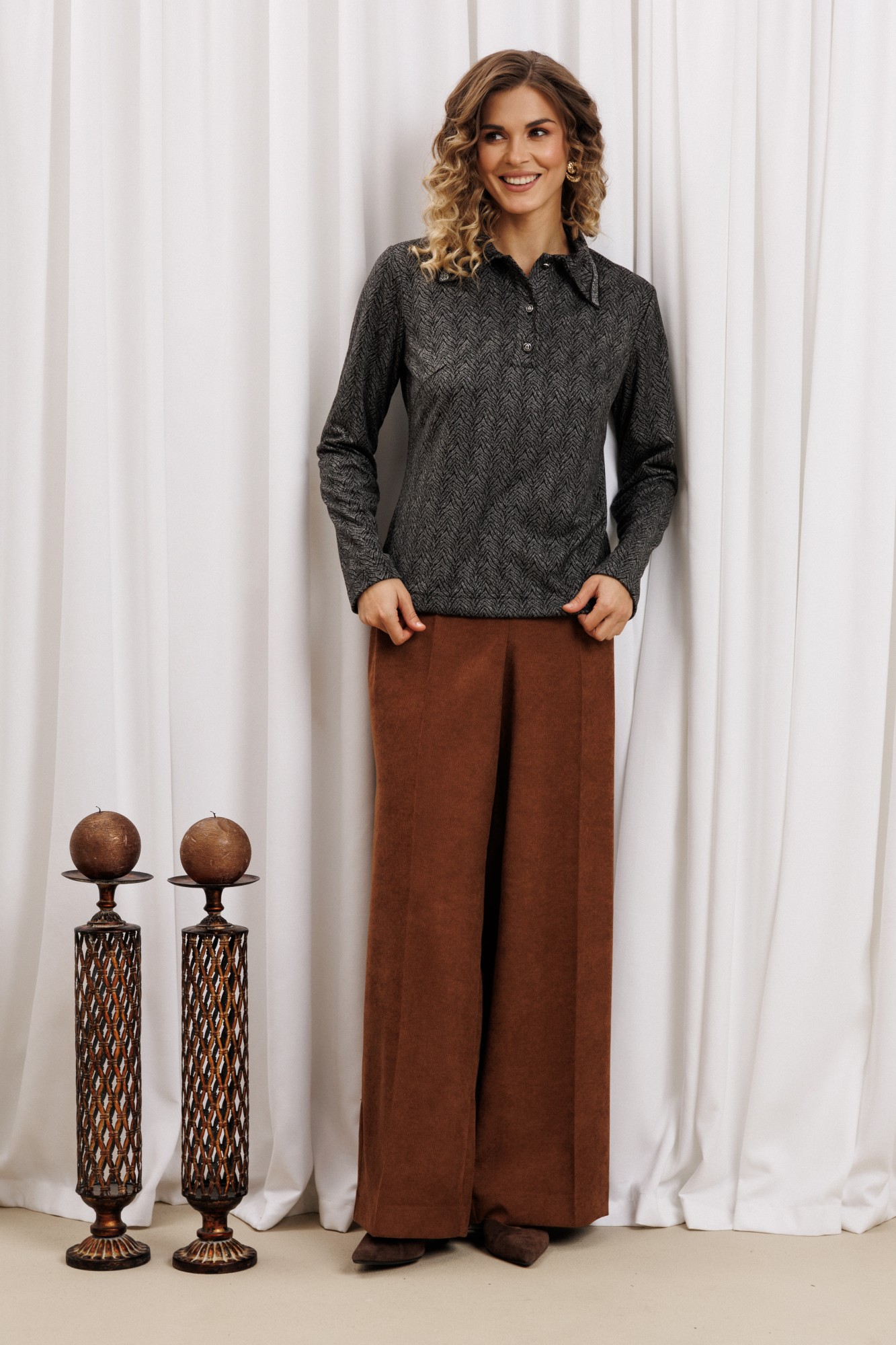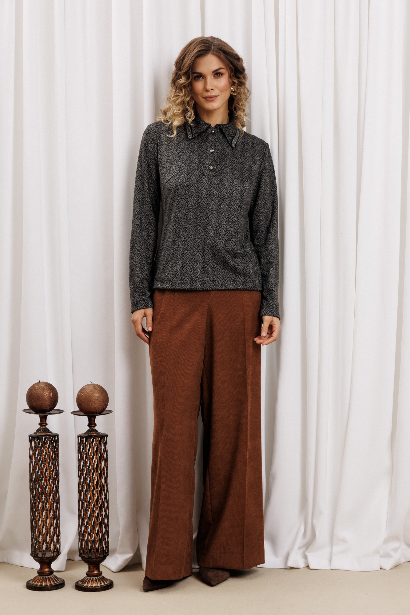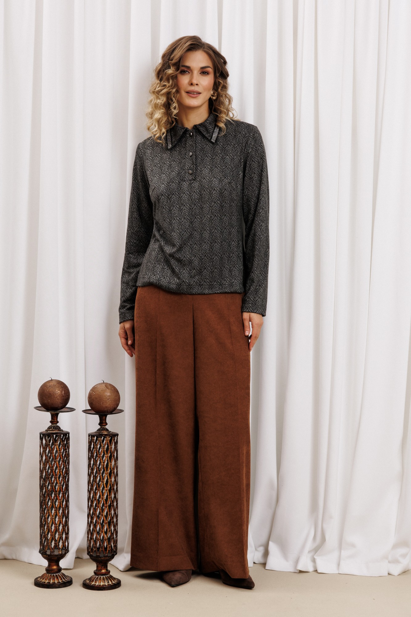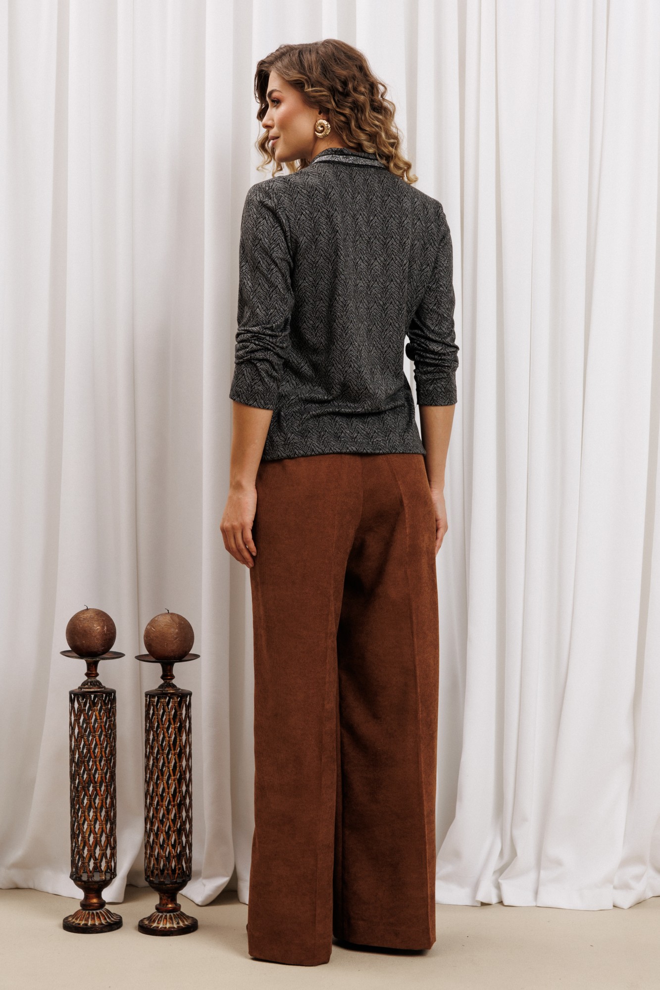 Костюм состоит из джемпера и брюк. Джемпер прямого силуэта из плотного трикотажного полотна с оригинальным рисунком из люрекса. Перед с застежкой поло и нагрудными вытачками. По воротнику настрочена декоративная тесьма. Брюки палаццо с притачным поясом из мягкой вельветовой ткани. Спереди застежка гульфик на молнии и петлей и пуговицей по поясу. По задней частям брюк вытачки. Пояс с резинкой в боковых частях. Брюки с заутюженными стрелками.