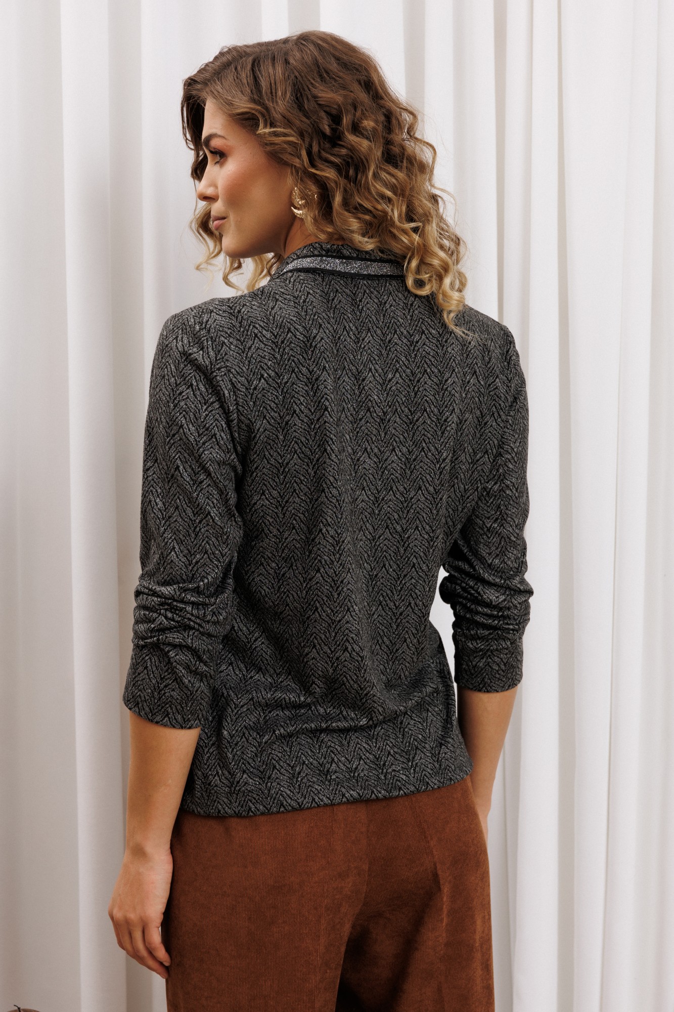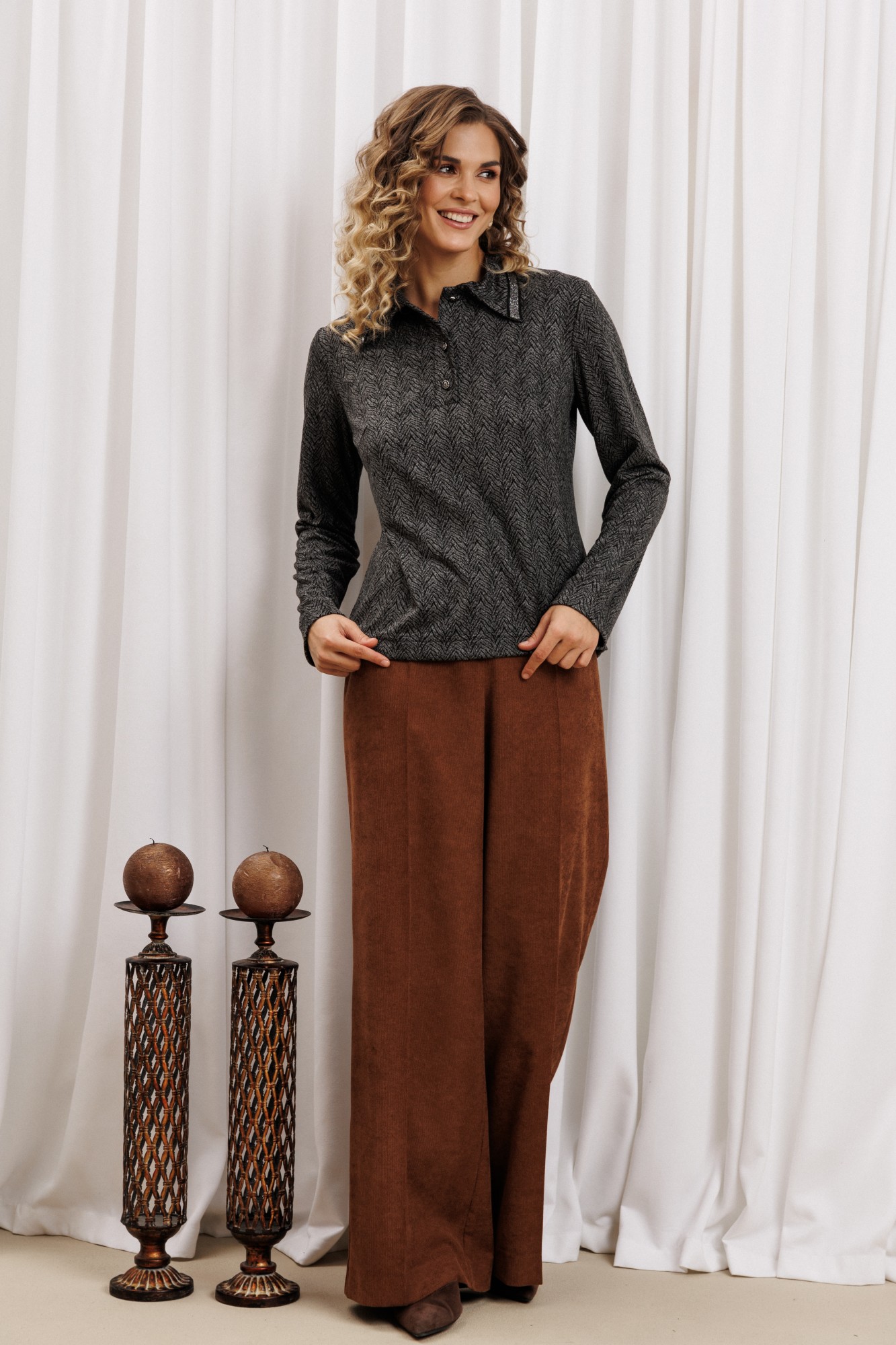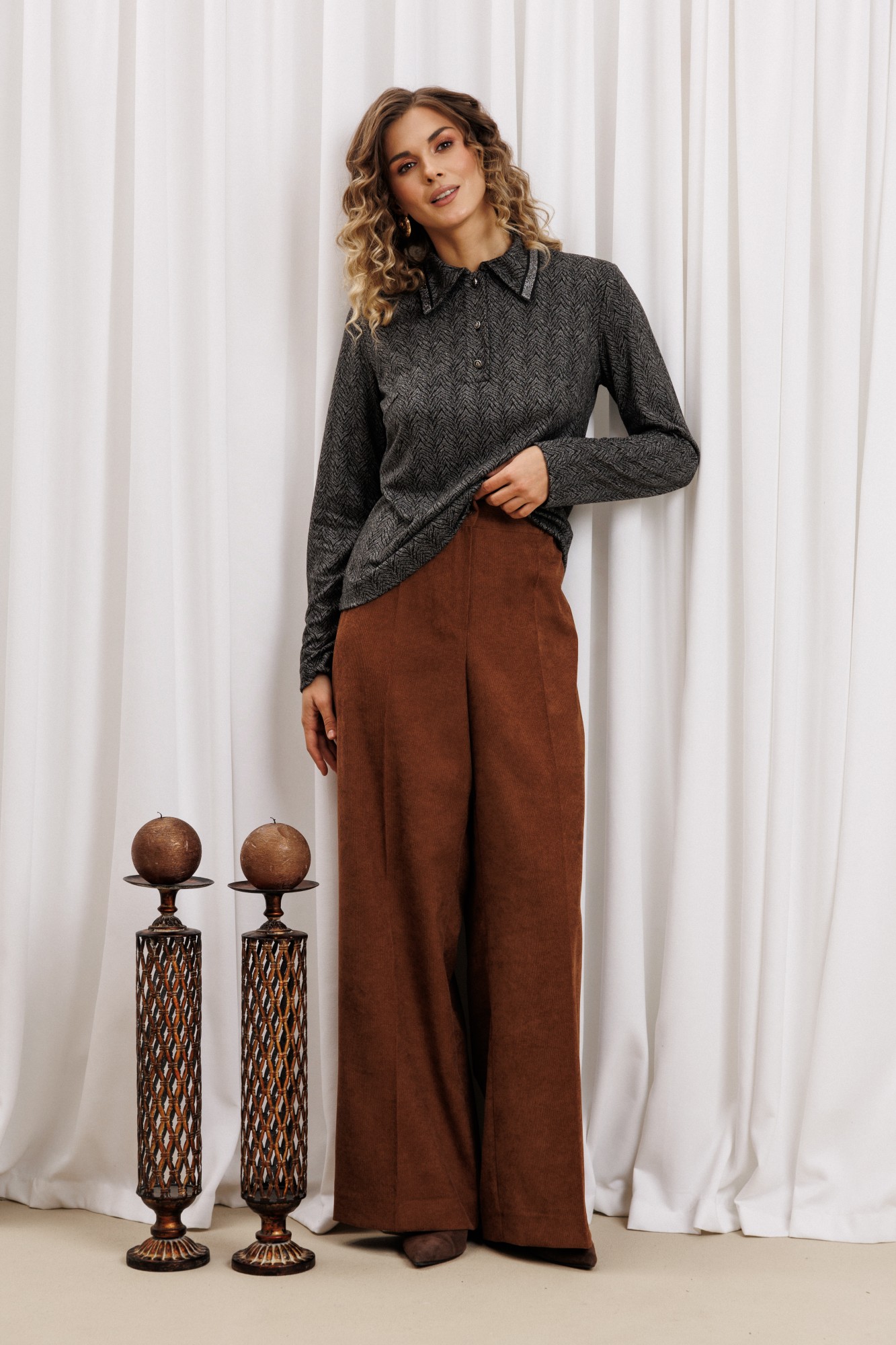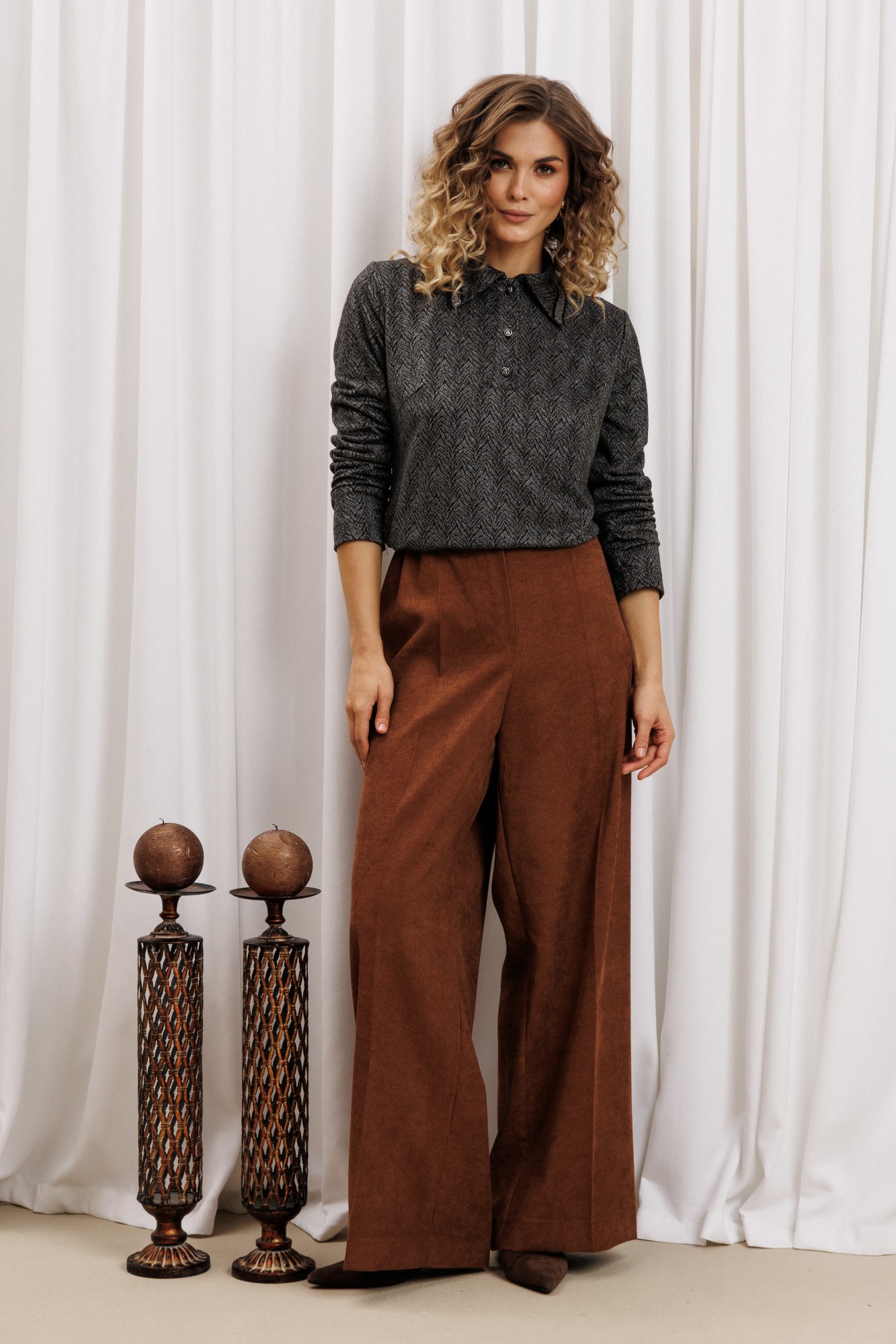 Костюм состоит из джемпера и брюк. Джемпер прямого силуэта из плотного трикотажного полотна с оригинальным рисунком из люрекса. Перед с застежкой поло и нагрудными вытачками. По воротнику настрочена декоративная тесьма. Брюки палаццо с притачным поясом из мягкой вельветовой ткани. Спереди застежка гульфик на молнии и петлей и пуговицей по поясу. По задней частям брюк вытачки. Пояс с резинкой в боковых частях. Брюки с заутюженными стрелками.