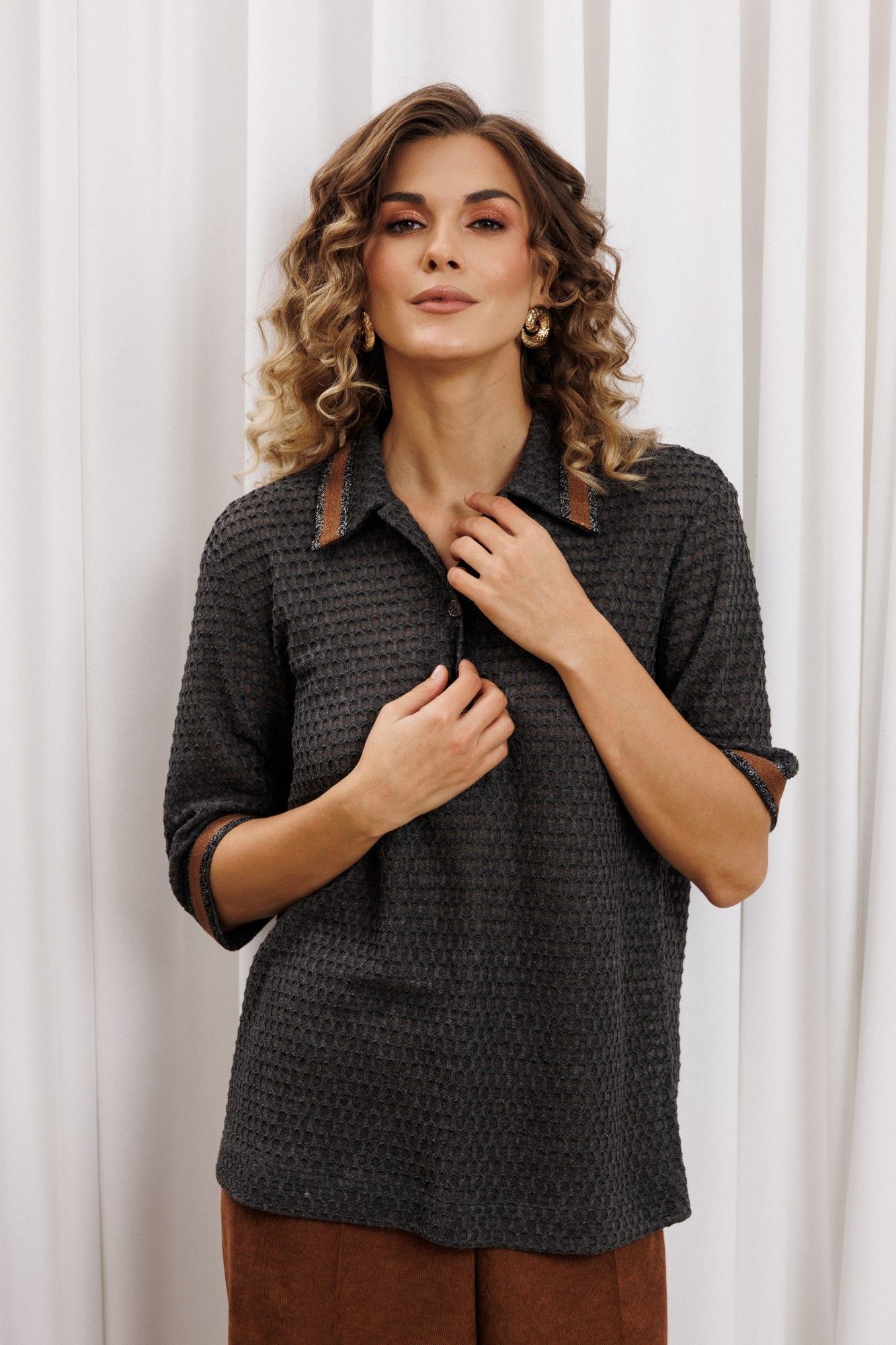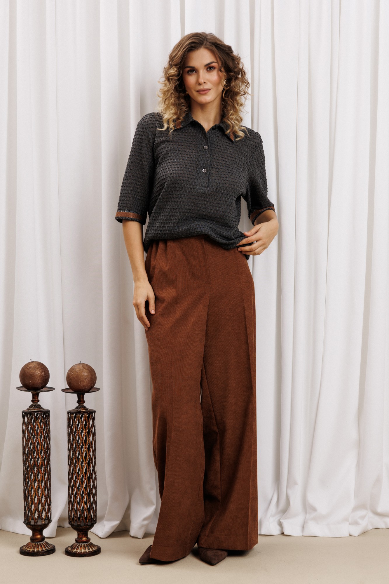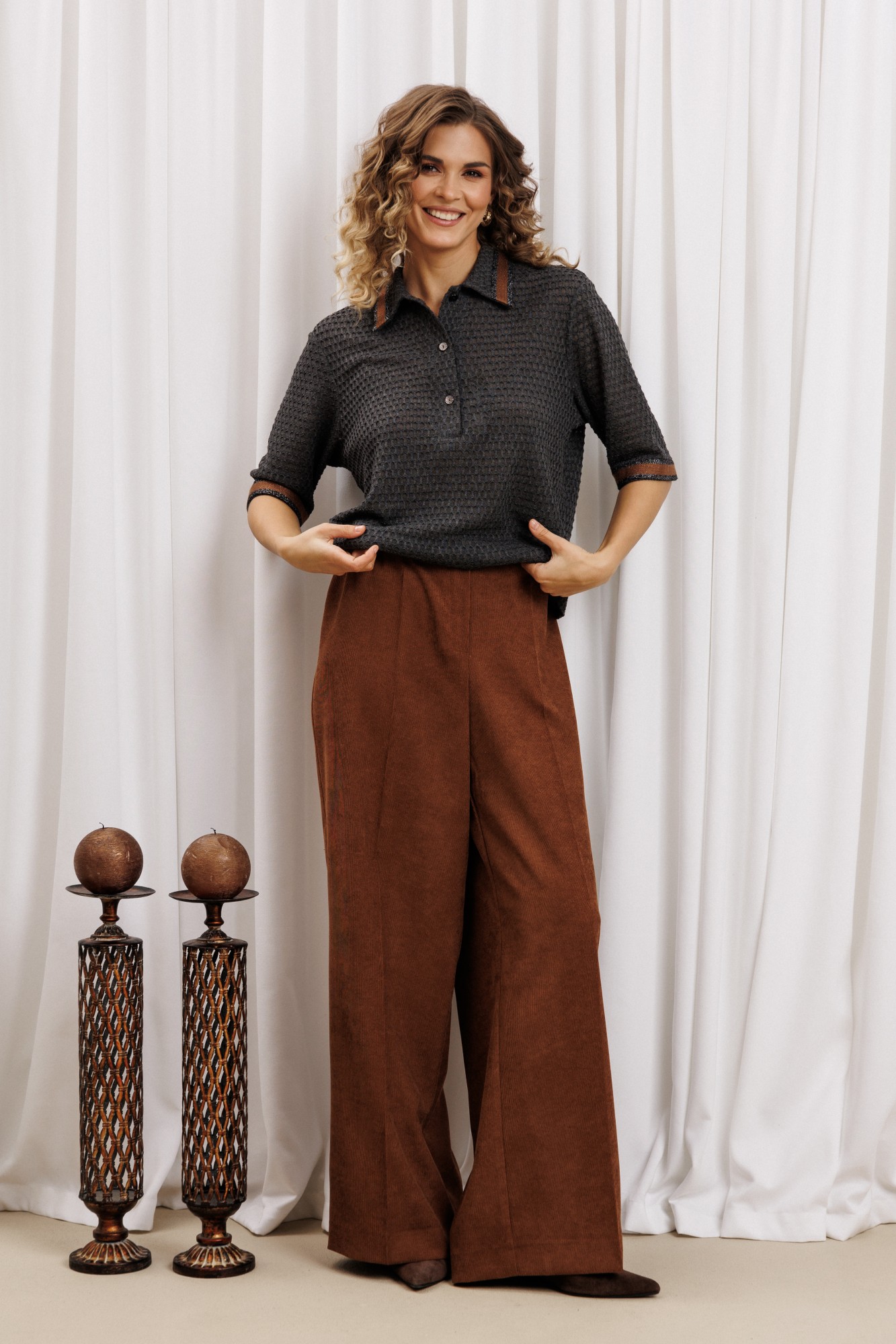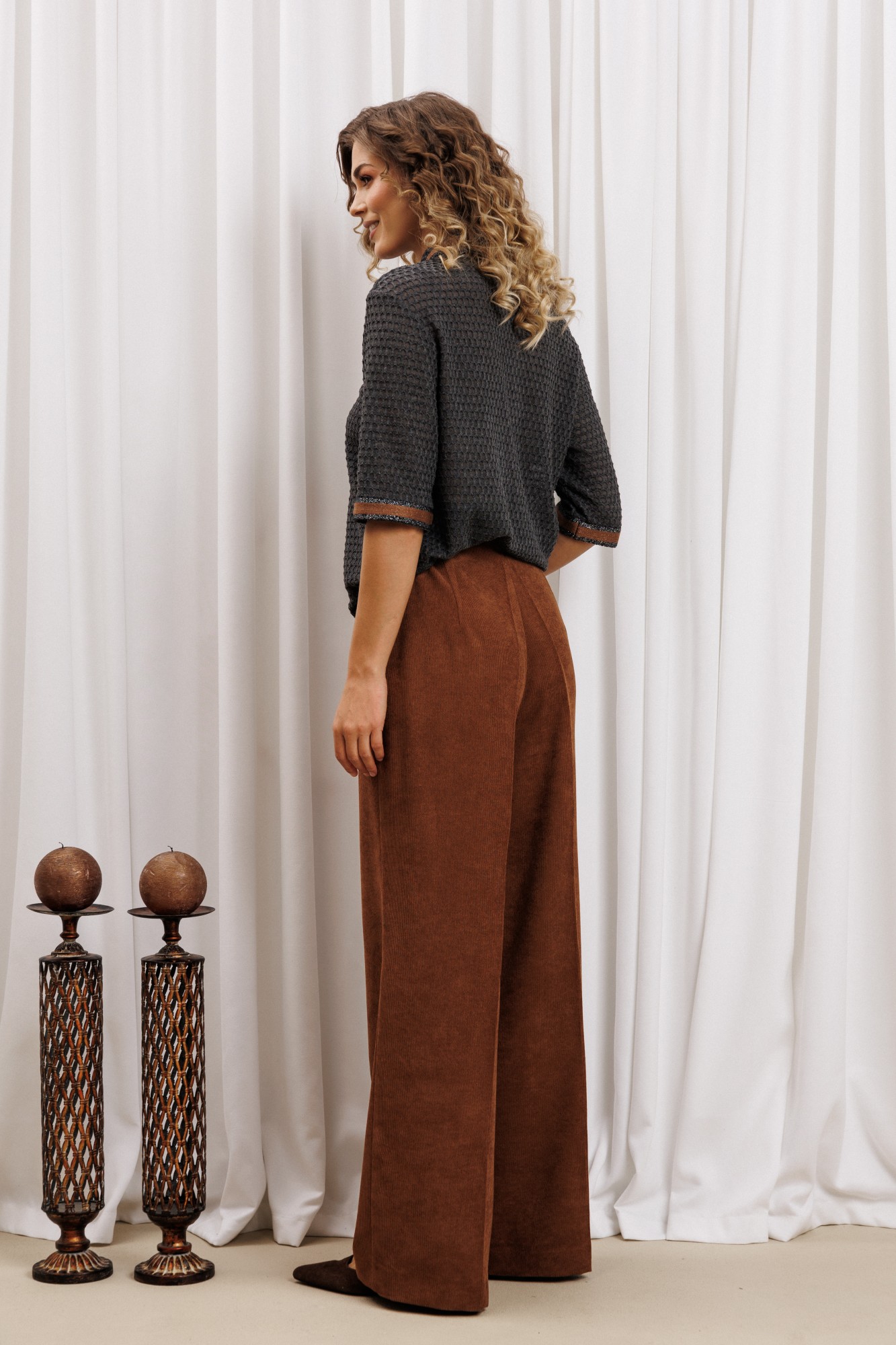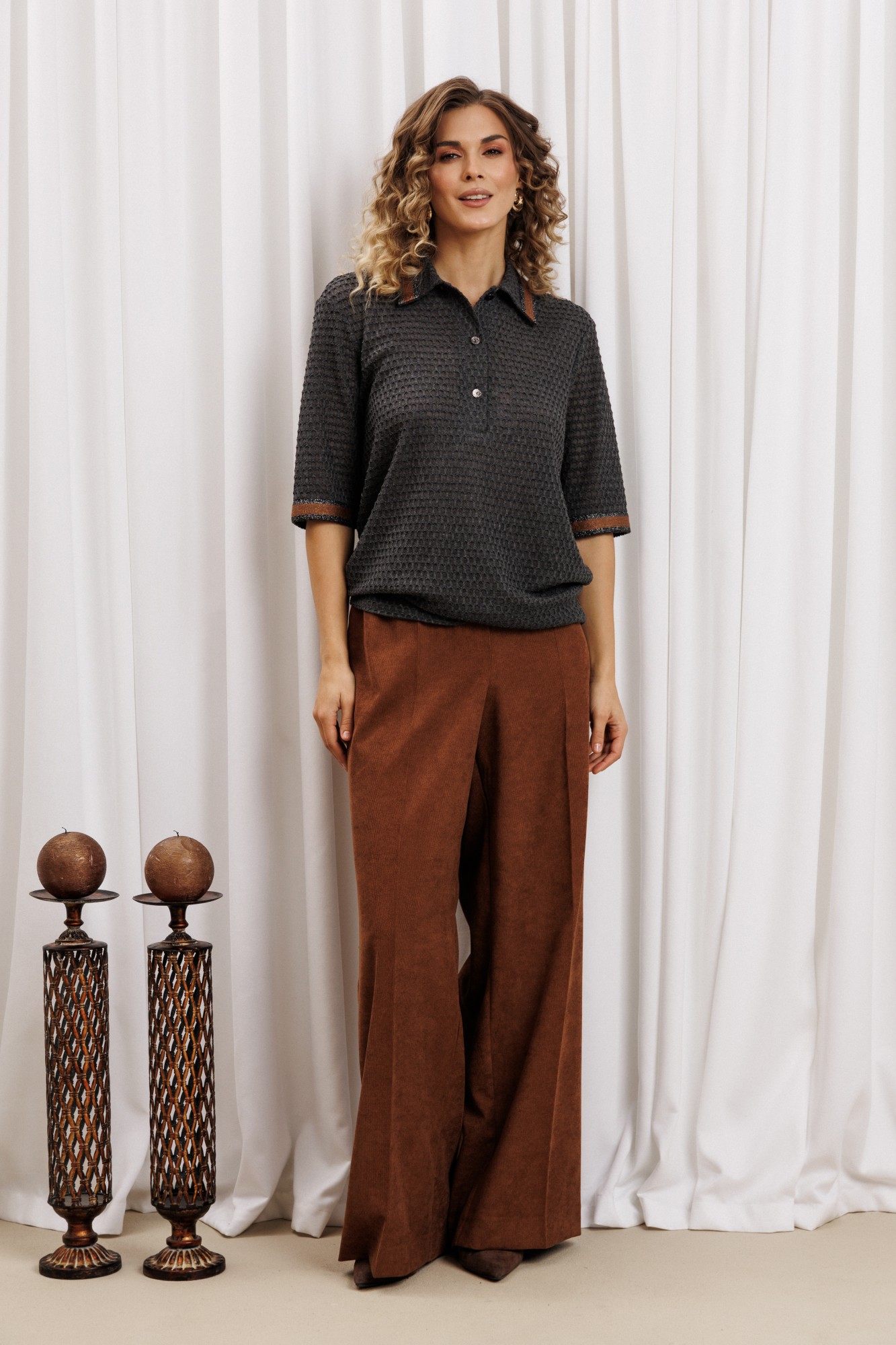 Костюм состоит из джемпера и брюк. Джемпер прямого силуэта из трикотажного ажурного полотна. Перед с застежкой поло и нагрудными вытачками. По воротнику и низу рукава настрочена декоративная тесьма. Брюки палаццо с притачным поясом из мягкой вельветовой ткани. Спереди застежка гульфик на молнии и петлей и пуговицей по поясу. По задней частям брюк вытачки. Пояс с резинкой в боковых частях. Брюки с заутюженными стрелками.