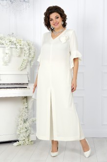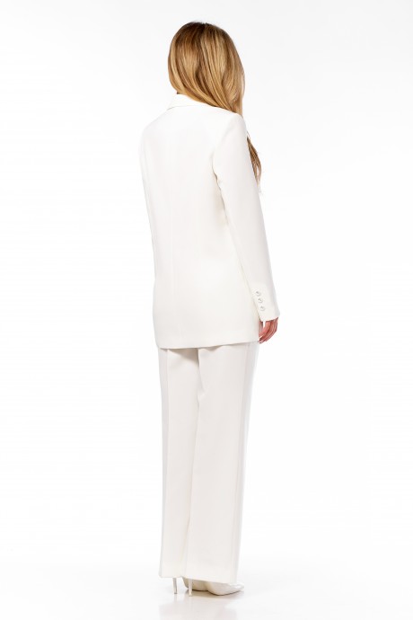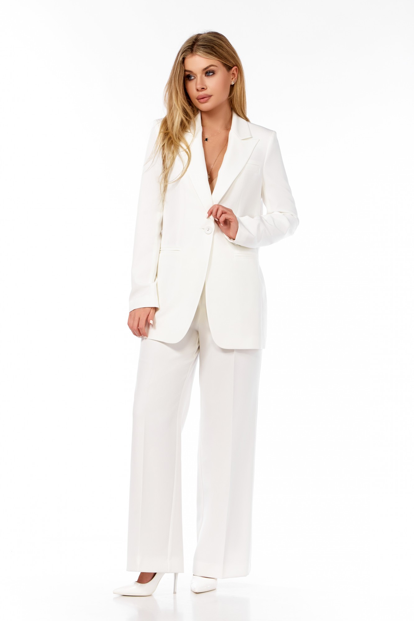 Элегантный жакет, слегка приталенного силуэта с острыми лацканами, застежкой на пуговицу и закругленными бортами. Прорезные карманы "в рамку" и имитированный карман с листочкой в верней части. Жакет на подкладке из 100% п/э, по спинке средний шов и талиевые вытачки. Рукава втачные двухшовные, внизу с обработанными шлицами на три пуговицы. Брюки-палаццо, со стрелками, на поясе с застежкой на пуговицу и тесьму-молнию. По бокам обработаны карманы.